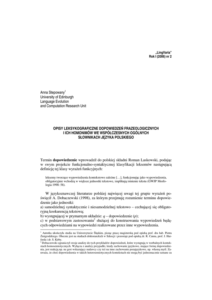 „LingVaria” Rok I (2006) nr 2 Anna Stepowany1 University of Edinburgh Language Evolution and Computation Research Unit OPISY LEKSYKOGRAFICZNE DOPOWIEDZEŃ FRAZEOLOGICZNYCH I ICH HOMONIMÓW WE WSPÓŁCZESNYCH OGÓLNYCH SŁOWNIKACH JĘZYKA POLSKIEGO Termin dopowiedzenie wprowadził do polskiej składni Roman Laskowski, podając w swym projekcie funkcjonalno-syntaktycznej klasyfikacji leksemów następującą definicję tej klasy wyraŜeń funkcyjnych: leksemy tworzące wypowiedzenia kontekstowo zaleŜne […], funkcjonując jako wypowiedzenia, obligatoryjnie wchodzą w większe jednostki tekstowe, implikują istnienie tekstu (GWJP Morfologia 1998: 58). W językoznawczej literaturze polskiej najwięcej uwagi tej grupie wyraŜeń poświęcił A. Dobaczewski (1998), za którym przejmuję rozumienie terminu dopowiedzenie jako jednostki: a) samodzielnej syntaktycznie i niesamodzielnej tekstowo – cechującej się obligatoryjną kookurencją tekstową; b) występującej w prymarnym układzie: q – dopowiedzenie (p); c) w podstawowym zastosowaniu2 słuŜącej do konstruowania wypowiedzeń będących odpowiedziami na wypowiedzi realizowane przez inne wypowiedzenia. 1 Autorka ukończyła studia na Uniwersytecie Śląskim, pisząc pracę magisterską pod opieką prof. dra hab. Piotra śmigrodzkiego. Obecnie jest na studiach doktoranckich w Szkocji i pozostaje pod opieką dr. R. Canna, prof. J. Hurforda i dr. S. Kirby. 2 Dobaczewski ograniczył swoje analizy do tych przykładów dopowiedzeń, które występują w werbalnych kontekstach homosemiotycznych. Wyłącza z analizy przypadki, kiedy zachowanie językowe, mające formę dopowiedzenia, jest reakcją np. na gest wskazujący nadawcy czy teŜ na inne zachowanie pozajęzykowe, np. własną myśl. ZauwaŜa, Ŝe choć dopowiedzenia w takich heterosemiotycznych kontekstach nie mogą być jednoznacznie uznane za 126 ANNA STEPOWANY Taka definicja bardzo dobrze stosuje się do przykładowego kontekstu zawierającego dopowiedzenie np. – Podobał ci się ten film? – Tak. Wyraźnie widać tutaj na przykładzie jednostki TAK wszystkie cechy definicyjne dopowiedzenia wyliczone przez Dobaczewskiego: samodzielność syntaktyczną i zaleŜność tekstową (– Tak), stanowienie wypowiedzi-reakcji p na wypowiedź-akcję q (– Podobał ci się ten film?) – realizowanie układu q–p oraz konstruowanie wypowiedzi o charakterze odpowiedzi na inne wypowiedzenie. Całą grupę tak charakteryzowanych jednostek leksykalnych podzielić moŜna za względu na ich ogólne znaczenie na potwierdzenia, np. tak, właśnie, jak najbardziej, rzecz jasna, i zaprzeczenia, np. nie, w Ŝadnym razie, nigdy. Dopowiedzenia – jak ilustrują przykłady – oprócz formy jednostek jednosegmentowych mogą być takŜe konstrukcjami wielosegmentowymi. Społeczne utrwalenie i ustabilizowana konstrukcja tych ostatnich oraz niemoŜność wyprowadzenia ich znaczenia ze znaczeń poszczególnych segmentów pozwalają zaliczyć je do wydzielonej przez A. M. Lewickiego grupy wskaźników frazeologicznych (Lewicki, Pajdzińska 2001), frazeologizmów pełniących funkcje pomocnicze – przyimków, np. w ramach czegoś; spójników, np. zarówno... jak i…, nie tylko... ale…; partykuł, np. Ŝe teŜ, a mianowicie, na ogół. MoŜna zatem mówić o grupie dopowiedzeń frazeologicznych – tego terminu uŜywać będę dalej, skupiając się wyłącznie na grupie frazeologicznych dopowiedzeń potwierdzających. Celem niniejszego artykułu jest przedstawienie wyników analizy opisu dopowiedzeń frazeologicznych i ich licznych homonimów3 w trzech najnowszych duŜych słownikach ogólnych języka polskiego – z punktu widzenia językoznawcy. Słownikami tymi są: Słownik współczesnego języka polskiego (dalej: SWJP), Inny słownik języka polskiego (dalej: ISJP) i Uniwersalny słownik języka polskiego (dalej: USJP). Szczególna uwaga została zwrócona na ocenienie spójności poszczególnych elementów opisu słownikowego – definicji4, przykładów uŜycia i kwalifikacji gramatycznej. Przykładową analizę pojedynczych przypadków przedstawię jako dodatek w końcowej części niniejszego artykułu. Analiza zawartości artykułów hasłowych i odsyłaczy w wymienionych słownikach pozwoliła wyłonić łącznie grupę 25 notowanych w nich dopowiedzeń frazeolodewiacyjne, istnieje jednak pewna groźba nieintpretowalności bądź niezrozumiałości w takim wypadku. Ponadto takie heterosemiotyczne uŜycia są – z punktu widzenia analizy syntaktycznej i semantyki językoznawczej – nierelewantne, dlatego w mojej analizie takŜe je pominę. 3 Rozumienie poszczególnych części mowy przyjmuję tutaj za klasyfikacją leksemów nieodmiennych M. Grochowskiego (1997). Wykorzystuję takŜe terminy fraza przysłówkowa, przymiotnikowa i czasownikowa – w rozumieniu przyjętym we wstępie do ISJP, które zostaną przytoczone w dalszej części artykułu. 4 Zgadzam się z następującą tezą M. Grochowskiego: „[...] zaleŜność między liczbą klas części mowy reprezentowanych przez jednostkę leksykalną a liczbą znaczeń jednostki jest właściwością indywidualną poszczególnych jednostek, a nie właściwością całego systemu leksykalnego [...]” (Gr o c h o w s k i 1989: 37). UwaŜam takŜe, Ŝe w definicjach dopowiedzeń warunkiem koniecznym jest wskazanie na kontekstualność jako cechę konstytutywną tych jednostek, odróŜniającą ją od homonimicznych wyraŜeń funkcyjnych, tzn. eksplicytne zasugerowanie, Ŝe uŜycie danej jednostki jest reakcją na wypowiedź innej osoby. Rezygnacja z tego warunku moŜliwa mogłaby być jedynie w wypadku jednostek nieposiadających homonimów w klasie wyraŜeń funkcyjnych – takich jak Ŝaden problem i w porządku. Taki punkt widzenia stosować będę przy ocenianiu trafności i spójności definicji z pozostałymi elementami mikrostruktury. OPISY LEKSYKOGRAFICZNE DOPOWIEDZEŃ 127 gicznych: a jak, a jakŜe, nie ma sprawy, jasna spr