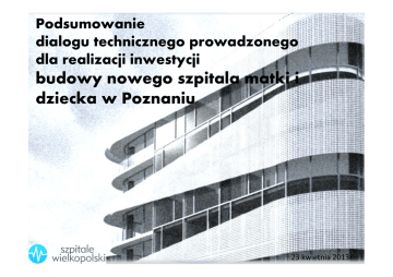 Podsumowanie dialogu technicznego prowadzonego dla realizacji inwestycji budowy nowego szpitala matki i dziecka w Poznaniu 23 kwietnia 2013r. Charakterystyka inwestycji Koncepcja nowego szpitala zakłada, że będzie on prowadził działalność przejętą z istniejących dwóch jednostek, uwzgledniającą zmiany zachodzące w procesach diagnostyczno‐terapeutycznych: 1) SZOZ nad Matką i Dzieckiem w Poznaniu, który hospitalizuje ok. 33 tys. pacjentów rocznie, w tym ok. 17 tys. dzieci oraz ok. 16 tys. pacjentek położniczo‐ ginekologicznych. 2) Szpital Rehabilitacyjny dla Dzieci w Kiekrzu wykonuje ok 270 tys. procedur fizjo i fizykoterapii. cd. Charakterystyka inwestycji Inwestycja planowana jest na terenie niezabudowanym w bezpośrednim sąsiedztwie istniejącego Wielospecjalistycznego Szpitala Miejskiego im. J. Strusia przy ul. Szwajcarskiej w Poznaniu. Zgodnie ze wstępnym programem medycznym inwestycja obejmować będzie 14 oddziałów (ok. 420 łóżek), szpitalny oddział ratunkowy, 24 poradnie, szkołę rodzenia, blok operacyjny, blok porodowy, diagnostykę i laboratoria. cd. Charakterystyka inwestycji Planowane parametry budynku: • Powierzchnia działki – 37 957 m2 • Powierzchnia zabudowy – 80 000 m2 • Powierzchnia użytkowa – 40 000 m2 • Przewiduje się parking na 840 miejsc 5 Kalendarz dialogu technicznego 12 listopada 2012 r. Ogłoszenie o Dialogu Technicznym 30 listopada 2012 r. Termin składania wniosków o dopuszczenie do dialogu technicznego, 11 stycznia 2013 r. Pierwsze spotkanie organizacyjne z wszystkimi siedmioma podmiotami 28.01.2013 r. do 14.03.2013 r. Indywidualne spotkania z poszczególnymi podmiotami Uczestnicy dialogu technicznego • 9 złożonych wniosków o dopuszczenie do dialogu • 7 podmiotów zaproszonych do dialogu: 1. ESA&CAPITA& STRABAG 2. HOCHTIEF Solutions AG 3. HOSPITALS Projektenwicklungsges.m.b.H 4. INSO S.p.A 5. Interhealth Canada 6. VAMED Standortentwicklung und Engineering GmbH 7. Warbud SA Wnioski Analizując przedstawione przez partnerów prywatnych rozwiązania dla inwestycji, dostrzec można, że: 1. Preferowane są dwa modele realizacji przedsięwzięcia: Model zintegrowany – partner prywatny przejmuje projektowanie, budowę, finansowanie oraz eksploatację łącznie z zarzadzaniem w aspekcie medycznym (2 podmioty zainteresowane) Model infrastrukturalny ‐ partner prywatny przejmuje projektowanie, budowę, finansowanie oraz zarządzanie techniczne (5 podmiotów zainteresowanych) Model zintegrowany Właściciel Partner Publiczny Udział X % Sponsor B Umowa w ramach dostępności (opłata za dostępność) Udział Y % Umowa PPP Sponsor A Sponsor C Spółka projektowa (SPV) kontrakt Uprawnienia do dysponowania Bank Finansowanie / spłata zadłużenia zabezpieczenie Środki pomocowe Usługi Użytkownicy (pacjenci) Udział Z % Gwarancje NFZ Nieruchomość projektowa Usługi Instytucje wspierające UE Partner prywatny projektowanie budowa eksploatacja Krajowa Instytucja wspierająca zarządzanie medyczne Model infrastrukturalny Partner Publiczny Umowa w ramach dostępności (opłata za dostępność) Umowa PPP Sponsor A Właściciel Udział Y % Sponsor B Sponsor C Spółka projektowa (SPV) Usługi Użytkownicy (pacjenci) Udział Z % Usługi kontrakt Gwarancje NFZ Nieruchomość projektowa Uprawnienia do dysponowania Bank Finansowanie / spłata zadłużenia zabezpieczenie Środki pomocowe Instytucje wspierające UE Partner prywatny projektowanie budowa Krajowa Instytucja wspierająca eksploatacja cd. Wnioski 2. Okres trwania umowy o PPP kształtuje się w przedziale: • Od 20 do 30 lat. 3. Czas realizacji inwestycji: • Projektowanie i pozyskanie pozwoleń – od 6 miesięcy do 12 miesięcy, • Budowa szpitala – od 2 lat do 3 lat cd. Wnioski 4. Podział zadań i ryzyk związanych z przedsięwzięciem pomiędzy podmiotem publicznym i partnerem prywatnym rozkłada się w zależności od preferowanego modelu: • Infrastrukturalny: - Ryzyko budowy i dostępności – partner prywatny a ryzyko popytu – partner publiczny, • Zintegrowany: - Ryzyko budowy, dostępności i popytu – partner prywatny lub ryzyko popytu (częściowo) – partner publiczny. Podział ryzyka Główne grupy ryzyk Ryzyko budowy Ryzyko popytu Ryzyko dostępności Publiczny* Kto ponosi ryzyko ? Prywatny Prywatny Prywatny Uwagi * strona publiczna przez pewien czas może zostać zobowiązana do gwarantowania wysokości kontraktu z NFZ Główne grupy ryzyk Uwagi Ryzyko budowy Ryzyko popytu Ryzyko dostępności Kto ponosi ryzyko ? Prywatny Publiczny Prywatny Po stronie partnera publicznego mogą znaleźć się następujące dodatkowe ryzyka szczególne: • ryzyko związane z gruntem (geologiczne, hydrologiczne, zanieczyszczenia) • ryzyko wzrostu cen np. energii wody i kanalizacji cd. Wnioski 5. Stosunek wkładu własnego podmiotu publicznego do wkładu partnera publicznego: • Nie jest wymagany wkład własny podmiotu publicznego, • 100 % finansowanie partnera prywatnego (spółka SPV) w podziale na: ‐ Wkład własny ‐ od 10% do 30% ‐ Bank, instytucja kredytowa lub finansowa – 70% do 90%. 6. Szacunkowa wartość inwestycji w ramach PPP: • Wysokość nakładów (budowa łącznie z wyposażeniem) kształtować się będzie na poziomie od 270 mln zł do 400 mln zł. Szacowane koszty inwestycji w zł Koszt budowy 270 mln – 400 mln Stopa zwrotu * 10 % Okres spłaty 25 lat Wysokość raty spłaty zadłużenia (kapitał + odsetki) 30 mln – 44 mln * oprocentowanie kredytu inwestycyjnego 8 % plus marża 2 % Budowa budynku pod klucz z pierwszym wyposażeniem w sprzęt medyczny rocznie (odpowiednio: 30 mln dla 270 mln zł kosztu inwestycji, 44 mln dla 400 mln) Modele PPP wg przedstawionych możliwości / propozycji uczestników dialogu 1 2 3 projektowanie budowa finansowanie utrzymanie i zarządzanie techniczne 1 5 2 wyposażenie medyczne usługi medyczne Usługi medyczne Infrastruktura Ryzyko budowy 4 Ryzyko dostępności Ryzyko popytu Rekome
