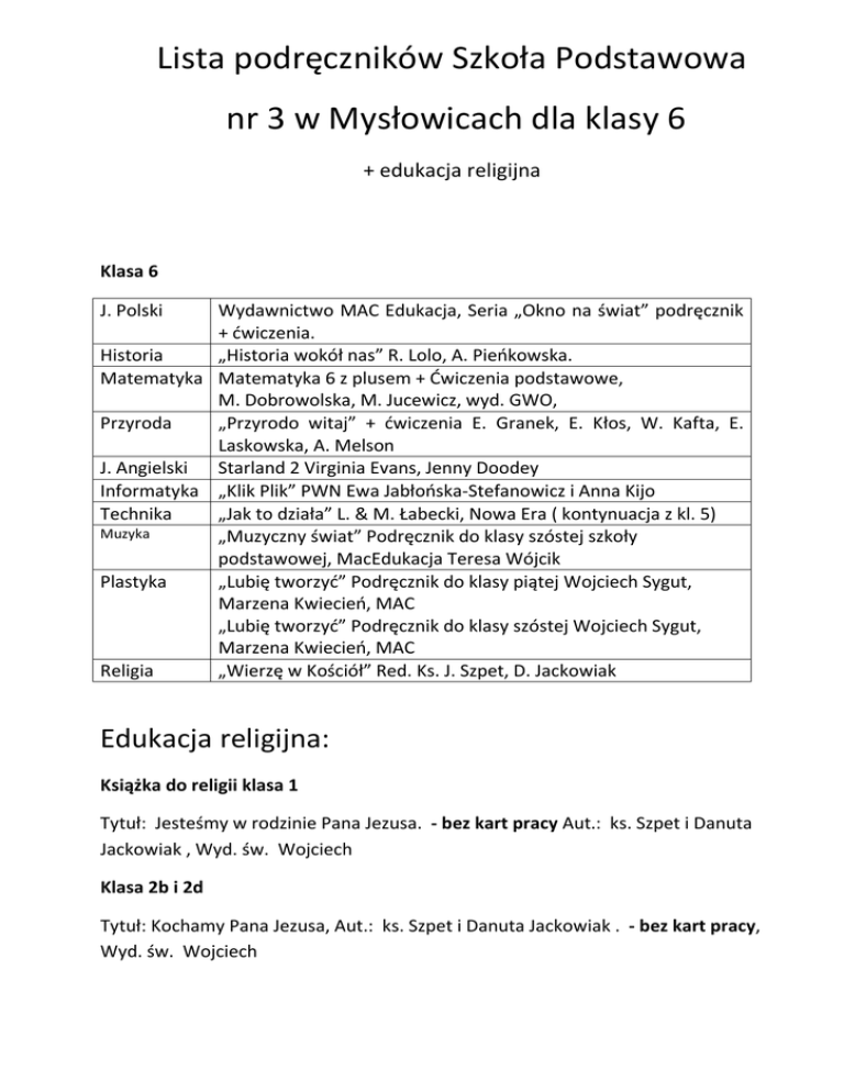 Lista podręczników Szkoła Podstawowa nr 3 w Mysłowicach dla klasy 6 + edukacja religijna Klasa 6 J. Polski Wydawnictwo MAC Edukacja, Seria „Okno na świat” podręcznik + ćwiczenia. Historia „Historia wokół nas” R. Lolo, A. Pieńkowska. Matematyka Matematyka 6 z plusem + Ćwiczenia podstawowe, M. Dobrowolska, M. Jucewicz, wyd. GWO, Przyroda „Przyrodo witaj” + ćwiczenia E. Granek, E. Kłos, W. Kafta, E. Laskowska, A. Melson J. Angielski Starland 2 Virginia Evans, Jenny Doodey Informatyka „Klik Plik” PWN Ewa Jabłońska-Stefanowicz i Anna Kijo Technika „Jak to działa” L. & M. Łabecki, Nowa Era ( kontynuacja z kl. 5) Muzyka „Muzyczny świat” Podręcznik do klasy szóstej szkoły podstawowej, MacEdukacja Teresa Wójcik Plastyka „Lubię tworzyć” Podręcznik do klasy piątej Wojciech Sygut, Marzena Kwiecień, MAC „Lubię tworzyć” Podręcznik do klasy szóstej Wojciech Sygut, Marzena Kwiecień, MAC Religia „Wierzę w Kościół” Red. Ks. J. Szpet, D. Jackowiak Edukacja religijna: Książka do religii klasa 1 Tytuł: Jesteśmy w rodzinie Pana Jezusa. - bez kart pracy Aut.: ks. Szpet i Danuta Jackowiak , Wyd. św. Wojciech Klasa 2b i 2d Tytuł: Kochamy Pana Jezusa, Aut.: ks. Szpet i Danuta Jackowiak . - bez kart pracy, Wyd. św. Wojciech Klasy komunijne: Książka do religii dla klas 2a, 2c, 2e + klasa 3b (ze względu na to, iż te klasy przystępują do Komunii Świętej w klasie II, proszone są o zakup podręczników z religii do klasy III, gdyż według nowej podstawy programowej właśnie w tym podręczniku zawarte są niezbędne informacje przygotowujące do w/w sakramentu)- bez kart pracy Tytuł: „Przyjmujemy Pana Jezusa”,- ks. Szpet i Danuta Jackowiak, Wyd. św. Wojciech Klasa 3a, 3c, 3d „Przyjmujemy Pana Jezusa” - Władysław Kubik SJ (red), Wydawnictwo WAM (nie wyd. św. Wojciech – to jest inny podręcznik). Klasa 4 „Jestem chrześcijaninem” Red. Ks. J. Szpet, D. Jackowiak wyd. św. Wojciech Klasa 5 „Wierzę w Boga” Red. Ks. J. Szpet, D. Jackowiak
