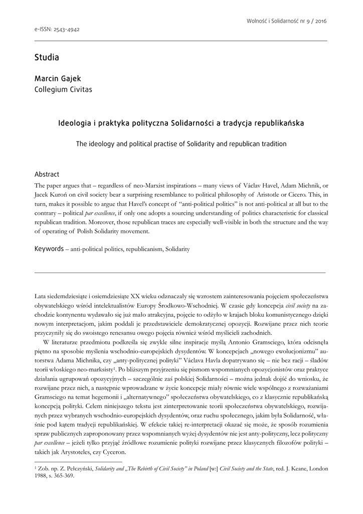 Wolność i Solidarność nr 9 / 2016 e-ISSN: 2543-4942 Studia Marcin Gajek Collegium Civitas Ideologia i praktyka polityczna Solidarności a tradycja republikańska The ideology and political practise of Solidarity and republican tradition Abstract The paper argues that – regardless of neo-Marxist inspirations – many views of Václav Havel, Adam Michnik, or Jacek Kuroń on civil society bear a surprising resemblance to political philosophy of Aristotle or Cicero. This, in turn, makes it possible to argue that Havel’s concept of “anti-political politics” is not anti-political at all but to the contrary – political par excellence, if only one adopts a sourcing understanding of politics characteristic for classical republican tradition. Moreover, those republican traces are especially well-visible in both the structure and the way of operating of Polish Solidarity movement. Keywords – anti-political politics, republicanism, Solidarity Lata siedemdziesiąte i osiemdziesiąte XX wieku odznaczały się wzrostem zainteresowania pojęciem społeczeństwa obywatelskiego wśród intelektualistów Europy Środkowo-Wschodniej. W czasie gdy koncepcja civil society na zachodzie kontynentu wydawało się już mało atrakcyjna, pojęcie to odżyło w krajach bloku komunistycznego dzięki nowym interpretacjom, jakim poddali je przedstawiciele demokratycznej opozycji. Rozwijane przez nich teorie przyczyniły się do swoistego renesansu owego pojęcia również wśród myślicieli zachodnich. W literaturze przedmiotu podkreśla się zwykle silne inspiracje myślą Antonio Gramsciego, która odcisnęła piętno na sposobie myślenia wschodnio-europejskich dysydentów. W koncepcjach „nowego ewolucjonizmu” autorstwa Adama Michnika, czy „anty-politycznej polityki” Václava Havla dopatrywano się – nie bez racji – śladów teorii włoskiego neo-marksisty1. Po bliższym przyjrzeniu się pismom wspomnianych opozycjonistów oraz praktyce działania ugrupowań opozycyjnych – szczególnie zaś polskiej Solidarności – można jednak dojść do wniosku, że rozwijane przez nich, a następnie wprowadzane w życie koncepcje miały równie wiele wspólnego z rozważaniami Gramsciego na temat hegemonii i „alternatywnego” społeczeństwa obywatelskiego, co z klasycznie republikańską koncepcją polityki. Celem niniejszego tekstu jest zinterpretowanie teorii społeczeństwa obywatelskiego, rozwijanych przez wybranych wschodnio-europejskich dysydentów, oraz ruchu społecznego, jakim była Solidarność, właśnie pod kątem tradycji republikańskiej. W efekcie takiej re-interpretacji okazać się może, że sposób rozumienia spraw publicznych zaproponowany przez wspomnianych wyżej dysydentów nie jest anty-polityczny, lecz polityczny par excellence – jeżeli tylko przyjąć źródłowe rozumienie polityki rozwijane przez klasycznych filozofów polityki – takich jak Arystoteles, czy Cyceron. Zob. np. Z. Pełczyński, Solidarity and „The Rebirth of Civil Society” in Poland [w:] Civil Society and the State, red. J. Keane, London 1988, s. 365-369. 1 Marcin Gajek Rzecz jasna, praktyka oraz formy działania Solidarności nie były dosłowną implementacją teoretycznych koncepcji rozwijanych w latach siedemdziesiątych XX wieku przez Kuronia, czy Michnika. Wiele z nich wykształciło się w sposób spontaniczny, a większość robotników podejmujących strajk w stoczni im. Lenina zapewne nie znała pism obu wspomnianych dysydentów. Niemniej jednak, działacze KOR i tzw. eksperci, zaproszeni przez robotników do rozmów z władzami, niewątpliwie wywarli pewien wpływ na strukturę oraz praktykę działania Solidarności2, co zdaje się usprawiedliwiać powiązanie ze sobą w jednym tekście zarówno sposobu funkcjonowania Związku, jak i rozwijanych w latach siedemdziesiątych teorii społeczeństwa obywatelskiego. „Anty-polityczna polityka”, czyli o związkach polityki z etyką W jednym ze swoich najlepiej znanych esejów politycznych Václav Havel przedstawia się jako zwolennik „polityki antypolitycznej” – to znaczy polityki rozumianej nie jako czysta technologia władzy i manipulacji, czy też cybernetyczna kontrola nad ludźmi, bądź sztuka tego, co użyteczne, ale „polityki jako jednego ze sposobów szukania i znajdowania sensu życia”. Pragnie on „polityki jako moralności stosowanej w praktyce; jako służby prawdzie; jako najgłębszej ludzkiej (...) troski o bliźnich”3. Jest rzeczą niezwykle znamienną, że tak rozumianą politykę przyszły prezydent Republiki Czeskiej określa mianem „antypolitycznej” – sugerując tym samym, że pomiędzy sferą polityki (i to zarówno w jej komunistycznym, jak i zachodnio-kapitalistycznym wydaniu) i moralności istnieje zasadnicza sprzeczność. Tymczasem Havel w przywołanych wyżej słowach odnosi się do koncepcji, która w tradycji republikańskiej stanowi kwintesencję tego, czym jest i czym powinna być polityka. W tradycji tej, życie polityczne posiadało przede wszystkim wymiar etyczny, było wręcz praktyczną realizacją zaleceń etycznych. Nieprzypadkowo Etyka Nikomachejska była dla Arystotelesa swoistym wstępem do Polityki. Ostatecznym celem państwa było w jego przekonaniu „szczęśliwe życie”; wszystko inne to zaledwie „środki do tego celu wiodące”4. Życie obywatelskie polegać miało również na zaprawianiu się w cnocie, państwo miało zaś swym obywatelom zagwarantować tę możliwość. Jego najwyższym, ostatecznym celem jest „możliwie doskonałe życie”5. Państwo jest więc w tradycji republikańskiej przestrzenią umożliwiająca samodoskonalenie; pełną realizację potencjału zawartego w ludzkiej naturze. Rzecz jasna, Havel miał swoje powody aby przedstawiać etyczną wizję polityki jako antypolityczną. Czynił tak dlatego, że sfera polityki utożsamiana była przez niego z oficjalnym aparatem państwowym – realizującym marksistowską koncepcję polityki s
