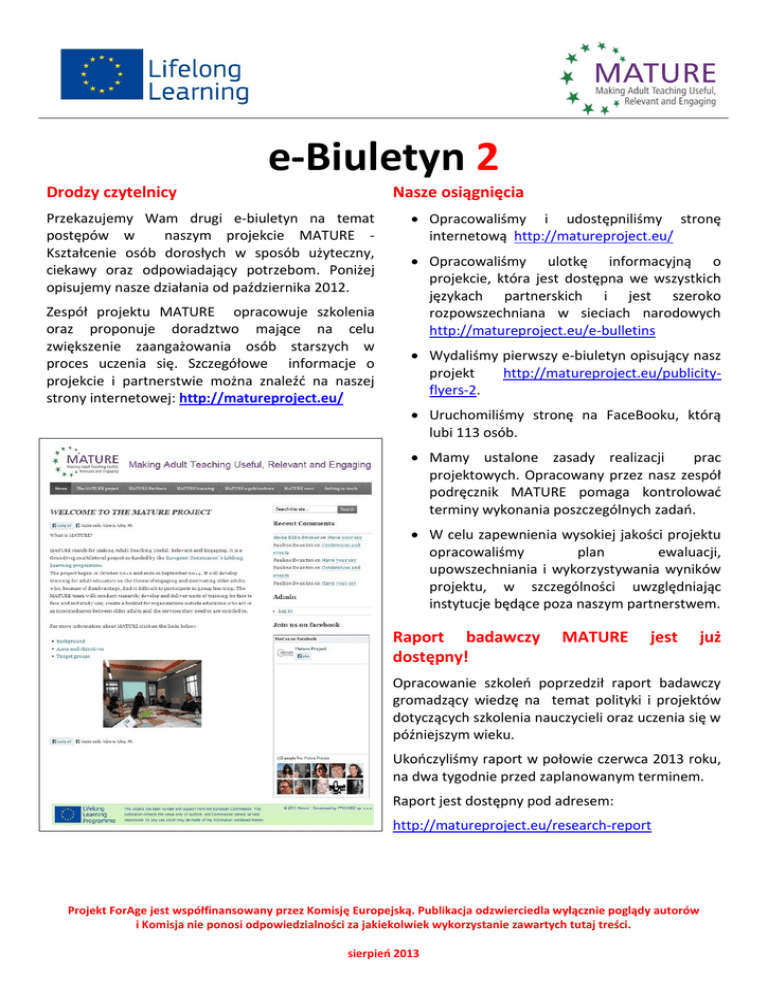 e-Biuletyn 2 Drodzy czytelnicy Nasze osiągnięcia Przekazujemy Wam drugi e-biuletyn na temat postępów w naszym projekcie MATURE Kształcenie osób dorosłych w sposób użyteczny, ciekawy oraz odpowiadający potrzebom. Poniżej opisujemy nasze działania od października 2012. Zespół projektu MATURE opracowuje szkolenia oraz proponuje doradztwo mające na celu zwiększenie zaangażowania osób starszych w proces uczenia się. Szczegółowe informacje o projekcie i partnerstwie można znaleźć na naszej strony internetowej: http://matureproject.eu/ Opracowaliśmy i udostępniliśmy stronę internetową http://matureproject.eu/ Opracowaliśmy ulotkę informacyjną o projekcie, która jest dostępna we wszystkich językach partnerskich i jest szeroko rozpowszechniana w sieciach narodowych http://matureproject.eu/e-bulletins Wydaliśmy pierwszy e-biuletyn opisujący nasz projekt http://matureproject.eu/publicityflyers-2. Uruchomiliśmy stronę na FaceBooku, którą lubi 113 osób. Mamy ustalone zasady realizacji prac projektowych. Opracowany przez nasz zespół podręcznik MATURE pomaga kontrolować terminy wykonania poszczególnych zadań. W celu zapewnienia wysokiej jakości projektu opracowaliśmy plan ewaluacji, upowszechniania i wykorzystywania wyników projektu, w szczególności uwzględniając instytucje będące poza naszym partnerstwem. Raport badawczy dostępny! MATURE jest już Opracowanie szkoleń poprzedził raport badawczy gromadzący wiedzę na temat polityki i projektów dotyczących szkolenia nauczycieli oraz uczenia się w późniejszym wieku. Ukończyliśmy raport w połowie czerwca 2013 roku, na dwa tygodnie przed zaplanowanym terminem. Raport jest dostępny pod adresem: http://matureproject.eu/research-report Projekt ForAge jest współfinansowany przez Komisję Europejską. Publikacja odzwierciedla wyłącznie poglądy autorów i Komisja nie ponosi odpowiedzialności za jakiekolwiek wykorzystanie zawartych tutaj treści. sierpień 2013 e-Biuletyn 2 http://matureproject.eu/online-training-2. Projekt MATURE nawiązuje kontakty Zespół projektu MATURE chciałby nawiązać jak najwięcej kontaktów z ludźmi i organizacjami, których praca dotyczy edukacji osób starszych. Od zainteresowanych oczekujemy nie tylko danych teleadresowych, zbieramy również opinie i pomysły, które mogą być użyteczne w realizacji naszego projektu. Aby nawiązać z nami kontakt przejdź http://matureproject.eu/haveyoursay do: Szkolenie MATURE Szkolenie MATURE składa się z dwóch części: http://matureproject.eu/mature-training. Pierwsza część zawiera 10 jednostek szkoleniowych dotyczących ustawicznego rozwoju zawodowego, które mogą być wykorzystane pojedynczo lub w połączeniach, w kursach dla osób dorosłych, nauczycieli i animatorów edukacji: http://matureproject.eu/face-to-face-training. Wybrane przez partnerów jednostki szkoleniowe będą udostępnione w formie kursów pilotażowych w terminie od października do grudnia 2013 roku. Ostateczne wersje szkoleń będą dostępne online na stronie internetowej we wrześniu 2014 roku. Druga część programu szkoleniowego składa się z pięciu jednostek do samodzielnej nauki: Obecnie jednostki te są na etapie opracowania. Wersje w języku angielskim, francuskim oraz niemieckim będą dostępne na stronie internetowej na początku listopada 2013 i będą wówczas testowane przez wybranych uczestników z krajów partnerskich. Za pośrednictwem naszej strony internetowej zapraszamy wszystkich, którzy chcieliby wziąć udział w samokształceniu. Uczestnicy pilotażowego kursu online będą mieli możliwość wyrażenia swojej opinii na temat materiałów do samodzielnej nauki. Broszura informacyjna MATURE Zespół projektu MATURE gromadzi materiały doradcze dla organizacji pośredniczących, które pracują z osobami starszymi, przy czym edukacja nie jest ich priorytetowym działaniem. Broszura będzie oferowała porady i praktyczne informacje na temat nauki osób starszych: http://matureproject.eu/advice-booklet Projekt broszury informacyjnej w języku angielskim zostanie przygotowany przez nasz zespół do lutego 2014. Wersje we wszystkich językach partnerskich będą udostępnione online we wrześniu 2014 roku. Konferencja MATURE Ageing – Learning – Inclusion, czyli Włączanie osób starszych w process uczenia się Niemieccy partnerzy reprezentujący szkołę ludową w Hamburgu rozpoczęli przygotowania do ostatniej, podsumowującej konferencji projektu MATURE, która odbędzie się w piątek, 19 września 2014. Sesje plenarne i warsztaty pozwolą kolegom z całej Europy omówić zagadnienia związane z kształceniem osób dorosłych w sposób użyteczny, Projekt ForAge jest współfinansowany przez Komisję Europejską. Publikacja odzwierciedla wyłącznie poglądy autorów i Komisja nie ponosi odpowiedzialności za jakiekolwiek wykorzystanie zawartych tutaj treści. sierpień 2013 e-Biuletyn 2 ciekawy oraz odpowiadający potrzebom oraz przetestować wybrane produkty projektu MATURE. Najnowsze informacje o konferencji, w tym na temat rejestracji będą dostępne pod adresem: http://matureproject.eu/about Drugie MATURE międzynarodowe spotkanie Drugie międzynarodowe spotkanie MATURE odbyło się w Polsce, w terminie 5-07 lipca 2013, w Toruniu. Było to bardzo udane spotkanie, które zachęciło partnerów do dalszej współpracy, umożliwiło wspólne rozwiązywanie problemów, które pojawiły się od czasu naszego pierwszego spotkania. Atmosfera panująca w zabytkowym polskim mieście Toruniu, sprzyjała pracy projektowej oraz społecznym interakcjom, które są kluczowe dla budowania zespołu. Nasi polscy koledzy zaplanowali bardzo napięty harmonogram spotkań, który obejmował udział w prestiżowej konferencji IWE (Informatyka w Edukacji). Sesja warsztatowa zorganizowana przez nasz zespół stała się okazją do omówienia głównych zagadnień projektu MATURE z nauczycielami z całej Polski oraz z ucz