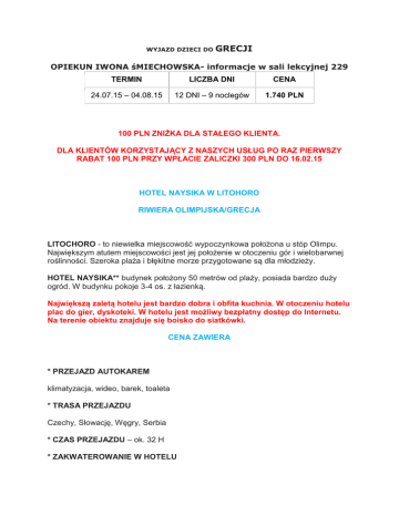 WYJAZD DZIECI DO GRECJI OPIEKUN IWONA śMIECHOWSKA- informacje w sali lekcyjnej 229 TERMIN LICZBA DNI CENA 24.07.15 – 04.08.15 12 DNI – 9 noclegów 1.740 PLN 100 PLN ZNIŻKA DLA STAŁEGO KLIENTA. DLA KLIENTÓW KORZYSTAJĄCY Z NASZYCH USŁUG PO RAZ PIERWSZY RABAT 100 PLN PRZY WPŁACIE ZALICZKI 300 PLN DO 16.02.15 HOTEL NAYSIKA W LITOHORO RIWIERA OLIMPIJSKA/GRECJA LITOCHORO - to niewielka miejscowość wypoczynkowa położona u stóp Olimpu. Największym atutem miejscowości jest jej położenie w otoczeniu gór i wielobarwnej roślinności. Szeroka plaża i błękitne morze przygotowane są dla młodzieży. HOTEL NAYSIKA** budynek położony 50 metrów od plaży, posiada bardzo duży ogród. W budynku pokoje 3-4 os. z łazienką. Największą zaletą hotelu jest bardzo dobra i obfita kuchnia. W otoczeniu hotelu plac do gier, dyskoteki. W hotelu jest możliwy bezpłatny dostęp do Internetu. Na terenie obiektu znajduje się boisko do siatkówki. CENA ZAWIERA * PRZEJAZD AUTOKAREM klimatyzacja, wideo, barek, toaleta * TRASA PRZEJAZDU Czechy, Słowację, Węgry, Serbia * CZAS PRZEJAZDU – ok. 32 H * ZAKWATEROWANIE W HOTELU Pokoje 3,4os z łazienką – 9 noclegów * WYŻYWIENIE 3 RAZY DZIENNIE – KUCHNIA GRECKA I EUROPEJSKA Śniadania, obiady, kolacje Podczas wycieczek całodniowych lunch pakiet. * OPIEKĘ REZYDENTA, RATOWNIKA I WYCHOWAWCÓW * UBEZPIECZENIE – KL 10.000 EURO i NNW 5.000 PLN *ZWIEDZANIE LEPTOKARII - pasaż handlowy, promenada wzdłuż wybrzeża, relaks w greckich kafejkach CENA NIE ZAWIERA * SUCHY PROWIANT NA DROGĘ POWROTNĄ DLA CHĘTNYCH – 10 EURO – PŁATNE NA MIEJSCU * WYCIECZEK * KAUCJI ZWROTNEJ WYCIECZKI * METEORY – słynny zespół klasztorów górskich położonych na skałach, zwiedzanie największego z klasztorów, * OLIMP – spacer po Olimpie, taras widokowy * SALONIKI - Biała Wieża- symbol Salonik, Agia Sophia – zabytek kultury bizantyjskiej, dzielnica handlowa, port * WATERLAND – miasteczko wodne * WIECZÓR GRECKI – typowa grecka kolacja i zabawa przy dźwiękach Zorby WYCIECZKI PŁATNE WE WŁASNYM ZAKRESIE – PAKIET 80 EURO * PLAŻOWANIE I KĄPIELE MORSKIE * ZAJĘCIA SPORTOWO-REKREACYJNE WYCIECZKI FAKULTATYWNE- dla chętnych * 45 EURO – ATENY - (wstępy płatne we własnym zakresie), port Pireus, stadion Kalimarmaro, Pałac Prezydencki, Park Zapion, Słupy Świątyni Zeusa, Łuk Hadriana, wzgórze Akropol, spacer po najstarszej dzielnicy Aten – Plaka, Parlament ze słynnym Pomnikiem Nieznanego Żołnierza, zobaczymy uroczystą zmianę Warty. * 35 EURO – REJS NA WYSPĘ SKATHOS - jednodniowy rejs po zatoce Pagestyckiej i otwartym morzu Egejskim. Podczas rejsu chętni będą mogli wykąpać się w krystalicznych wodach przy jednej z najpiękniejszych plaż Europy- Kukunaries. W drodze powrotnej Kapitan statku dla dopełnienia wrażeń zaprosi do wspólnej zabawy . RAMOWY PROGRAM IMPREZY 1 dzień – wyjazd z Polski, przejazd przez Czechy, Słowację, Węgry, Serbię (postoje w trakcie podróży są organizowane co 4-5h) 2 dzień - przyjazd do Grecji, zakwaterowanie w hotelu od godz. 16.00, kolacja, nocleg 3-10 dzień - wypoczynek, wycieczki, plażowanie, zajęcia sportowo-rekreacyjne 11 dzień – śniadanie, sprzątanie w pokojach , wykwaterowanie do godz.10.00, 12 dzień – przyjazd do Polski w godzinach popołudniowych UWAGA * Młodzież zobowiązana jest do dostarczenia karty uczestnika miesiąc przed wyjazdem. * Uczestnik powinien posiadać ważny dokument tożsamości paszport lub dowód osobisty w zależności od przepisów obowiązujących w krajach tranzytowych *Prosimy zabezpieczyć młodzież w suchy prowiant na drogę do Grecji * Herbata dostępna w autokarze za dodatkową opłatą. * Przy zakwaterowaniu pobierana jest kaucja w wysokości 10 EUR0, która zwracana jest w dniu wyjazdu, o ile nie zostały wyrządzone szkody. W przypadku szkody przekraczającej wartość kaucji, uczestnik ponosi odpowiedzialność za zwrot pełnych kosztów naprawy lub wymiany sprzętu. * Sugerowane kieszonkowe od 50-100 EURO na drobne wydatki + wycieczki WAŻNE INFORMACJE * Każdy uczestnik w ramach wykupionej imprezy może przewieźć 1 szt. bagażu – 20 kg i bagaż podręczny – 5 kg *Cena nie zawiera dopłat do połączeń antenowych, które realizowane są przy min. 6 osobach. Dopłaty znajdują się na stronie internetowej * Na trasach dojazdowych uczestnicy mogą być dowożeni samochodami osobowymi, busami lub pociągiem. * Godzina podstawienia autokaru na miejsce zbiórki podana będzie 14 dni przed wyjazdem. * Biuro nie ponosi odpowiedzialności za opóźnienie autokaru spowodowane przyczynami niezależnymi od Organizatora czy Przewoźnika Kalkulacja cenowa sporządzona na dzień 15.10.2014 1 EURO = 4,20 PLN ŻYCZYMY UDANYCH WAKACJI !!!