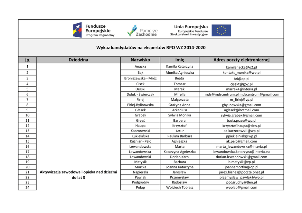 Wykaz kandydatów na ekspertów RPO WZ 2014-2020 Dziedzina Nazwisko Imię Adres poczty elektronicznej 1 Anacka Kamila Katarzyna 2 3 4 5 6 7 8 9 10 11 12 13 14 15 16 17 18 19 20 21 22 23 24 Bąk Broniszewska - Mróz Cisek Derski Doluk - Świerczek Firlej Firlej-Bylinowska Głasek Grabek Grześ Haupa Kaczorowski Kukielińska Kuźniar - Pelc Lewandowska Lewandowska Lewandowski Matysik Mortka Napierała Pawlak Podgrudny Połap Monika Agnieszka Beata Tomasz Marek Mirella Małgorzata Grażyna Anna Arkadiusz Sylwia Monika Barbara Krzysztof Artur Paulina Barbara Agnieszka Marta Katarzyna Agnieszka Dorian Karol Barbara Joanna Katarzyna Jarosław Przemysław Radosław Wojciech Tobiasz [email protected] [email protected] Lp. Aktywizacja zawodowa i opieka nad dziećmi do lat 3 [email protected] [email protected] [email protected] [email protected] [email protected] [email protected] [email protected] [email protected] [email protected] [email protected] [email protected] [email protected] [email protected] [email protected] [email protected] [email protected] [email protected] [email protected] [email protected] [email protected] [email protected] [email protected] [email protected] Aktywizacja zawodowa i opieka nad dziećmi do lat 3 25 26 27 28 29 30 31 32 33 34 35 36 37 38 39 40 41 42 43 1 2 3 4 5 6 7 8 9 10 11 12 13 14 15 Poniatowska Posyniak Proć Puckowska- Pociask Rogoza - Chojnacka Rutkowski Sadowska Sarwa Stempniak Szcześniak Świętoniowska Tyc Urbański Węgrzyńska Wiankowski Wojtaszewska Wróbel Wysocka Zwarzany Bąk Bileńki-Świsterska Broniszewska - Mróz Chabiera Cisek Czarnecka Derski Doluk - Świerczek Firlej Firlej-Bylinowska Glock Głasek Głowacki Grześ Idryjan Urszula Katarzyna Dorota Agnieszka Artur Ilona Barbara Joanna Sylwia Dariusz Joanna Halina Ewa Anna Marcin, Michał Marcin Joanna Magdalena Andrzej Jan Wiktor Jan Joanna Rafał Wojciech Kamila Maria Tomasz Wojciech Magdalena Katarzyna Elżbieta Monika Agnieszka Anna Patrycja Beata Stefan Tomasz Justyna Maria Marek Mirella Małgorzata Grażyna Anna Mariusz Arkadiusz Radosław Grzegorz Barbara Karolina Marta [email protected] [email protected] [email protected] [email protected] [email protected] [email protected] [email protected] [email protected] [email protected] [email protected] [email protected] [email protected] [email protected] [email protected] [email protected] [email protected] [email protected] [email protected] [email protected] [email protected] [email protected] , [email protected] [email protected] [email protected] [email protected] [email protected] [email protected] [email protected] [email protected] [email protected] [email protected] [email protected] [email protected] [email protected] [email protected] [email protected] 16 17 18 19 20 21 22 23 24 25 26 27 28 29 30 31 32 33 34 35 36 37 38 39 40 41 42 43 44 45 46 47 48 1 Aktywna integracja i usługi społeczne Kaszycki Kordys Kucharska Kuźniar - Pelc Lewandowska Lewandowska Lewandowski Łukomska - Dziedzic Markowska Matysik Miela Milewska Mortka Mucha Napierała Oleksiak Połap Poniatowska Proć Puckowska- Pociask Rogoza - Chojnacka Sadowska Sarwa Seńków Stempniak Szcześniak Urbański Węgrzyńska Wiankowski Wojtaszewska Wolska Zientarska Zwarzany Arcimowicz Zbigniew Marzena Karolina Agnieszka Marta Katarzyna Agnieszka Dorian Karol Anna Florentyna Justyna Ewa Barbara Joanna Maria Maria Joanna Katarzyna Karolina Anna Jarosław Dariusz Wojciech Tobiasz Urszula Katarzyna Artur Ilona Barbara Joanna Sylwia Joanna Halina Ewa Anna Małgorzata Marcin, Michał Marcin Wiktor Jan Joanna Rafał Wojciech Kamila Maria Teresa Katarzyna Anna Katarzyna Elżbieta Anna Małgorzata [email protected] [email protected] [email protected] [email protected] [email protected] [email protected] [email protected] [email protected] [email protected] [email protected] [email protected] [email protected] [email protected] [email protected] [email protected] [email protected] [email protected] [email protected] [email protected] [email protected] [email protected] [email protected] [email protected] [email protected] [email protected] [email protected] [email protected] [email protected] [email protected] [email protected] [email protected] [email protected] [email protected] [email protected] 2 3 4 5 6 7 8 9 10 11 12 13 14 15 16 17 18 19 20 21 22 23 24 25 26 27 28 29 30 31 32 33 34 35 Bąk Bileńki-Świsterska Brząkalik Chabiera Chlebińska Chmiel Cisek Ciszewska Ciupa Dąbrowski Derski Firlej-Bylinowska Furgoł Głasek Grześ Jasińska Kamińska Katlewska Kempa - Paplińska Komorkiewicz Kordys Kowalska Kozioł Kuć Kukielińska Kuźniar - Pelc Kwiatkowska - Ciotucha Leder Leśniak Lewandowska Lewandowska Lewandowska Lewandowski Ludwikowska Monika Agnieszka Anna Patrycja Krystyna Jolanta Stefan Grażyna Zofia Alicja Barbara Tomasz Agnieszka Rafał Piotr Arkadiusz Marek Grażyna Anna Sabina Joanna Arkadiusz Barbara Jolanta Małgorzata Alicja Inga Natalia Anna Michał Marian Marzena Elżbieta Katarzyna Jacek Paulina Barbara Agnieszka Dorota Anna Beata Zofia Marek Marta Józefa Marta Katarzyna Agnieszka Dorian Karol Sylwia [email protected] [email protected] , [email protected] [email protected] [email protected] [email protected] [email protected] [email protected] [email protected] [email protected] [email protected] [email protected] [email protected] [email protected] [email protected] [email protected] [email protected] [email protected] [email protected] [email protected] [email protected] [email protected] [email protected] [email protected] [email protected] [email protected] [email protected] [email protected] [email protected] [email protected] [email protected] [email protected] [email protected] [email protected] [email protected] 36 37 38 39 40 41 42 43 44 45 46 47 48 49 50 51 52 53 54 55 56 57 58 59 60 61 62 63 64 65 66 67 68 69 Edukacja Łuczak Matysik Mortka Napierała Nosowicz Pawlak Pipier Pliżga Połap Poniatowska Posyniak Proć Przybył Przystalska Pyrczak