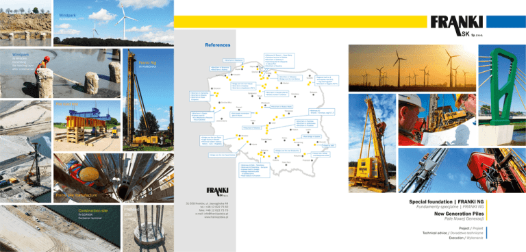 Windpark IN KAMIONKA References Windpark IN WYSOKA Concreting the blinding layer after construction •Motorway A1 Rusocin – Nowe Marzy •Container terminal in Gdańsk •Wind farm in Subkowy II •Assembling Hall for Shipyards in Gdynia Port •Wind farm in Nowotna •Wind farm in Masłowice Franki Rig IN KAMIONKA Gdynia •Wind farm in Stramnica •Wind Farm in Kukinia Słupsk Gdańsk Elbląg Koszalin Kołobrzeg •Wind farm in Tolkowiec •Bridge over the river Babica Olsztyn •Bridge over the river Vistula •Wind farm in Kisielice •Wind farm in Gawłowice (PEP I) Szczecin •Wind farm in Kamionka •Wind farm in Wysoka •Wind farm in Nowe Chrapowo Bydgoszcz Toruń Gorzów Wlkp Pile load test Suwałki •Wind farm in Skurpie (PEP III) •Mrówka market in Chełmża Białystok Ostrołęka Włocławek •Wind farm in Redecz Wielki Poznań •Motorway A2 Stryków – Konotopa, seg. B, C, E Warszawa •Wind farm in Rzepin •Express road S3 Klucz Międzyrzecz Południe – Klucz Sulechów •Solid waste incineration plant in Konin Kalisz Zielona Góra •Wind farm in Pudzików •Wind farm in Jadwinówka •Wind farm in Pruszków Łódź •Ring road in Pabianice •Bridge over the river Ślęża •Sugar factory in Strzelin •Provincial eastern roadway Bielany – Łany – Długołęka •Regional road no. 8 and express road S-61 – ring road Augustów •Wind farm in Rajgród (PEP II) Radom Wrocław •Road bridge in Opatów Kielce Częstochowa Lublin Zamość Tarnobrzeg Opole •Road no. 849 Katowice •Bridge over the river Stradomka •Bridge over the river Nysa Kłodzka •Viaduct over railway and Księżycowa street Rzeszów Kraków Nowy Sącz Przemyśl •Motorway A1 Bełk – Świerklany •Motorway A1 Świerklany – Gorzyczki •Express road S1 (bridge) •Sewage treatment plant in Łaziska Górne •Road viaduct in Chrzanów Franki pile manufacture Construction site IN GDANSK Container terminal Pilehead after cutting 31-358 Kraków, ul. Jasnogórska 44 tel.: +48 12 622 75 60 faks: +48 12 622 75 70 e-mail: [email protected] www.frankipolska.pl Special foundation | FRANKI NG Fundamenty specjalne | FRANKI NG New Generation Piles Pale Nowej Generacji Project / Projekt Technical advice / Doradztwo techniczne Execution / Wykonanie Manufacturing process with gravel pre-compression Manufacturing process Set driving pipe in place, fill in stopper concrete and ram in Ramming in the driving pipe through inner ramming with free fall pile hammer Formation of the pile base through ramming down the conrete Fitting the reinforcing cage and conreting the shaft Capping the pile head; arranging the connecting reinforcement Ramming in the driving pipe through inner ramming with free fall pipe hammer until soil load-bearing foundation soil is reached Ramming down the gravel whilst pulling the pipe Ramming back the pipe into the gravel previously rammed down pulling the driving pipe driving pipe pulling during base formation free fall pile hammer refiling concrete Capping the pile head; arranging the connecting reinforcement Forming a pile base through ramming down concrete Ground profile Pressure sounding Resistance-Settlement-Line Load [MN] Filling pulling when forming base Clay soil refilling concrete the pile is finished and after hardening ready to bear loads stopper made of concrete or gravel Foundation soil Load refilling of gravel refilling of concrete fitting the reinforcing cage Peat the pile is finished and after hardering ready to bear loads Clay soil non load-bearing foundation soil pile drive onto the stopper GW GW Peat non load-bearing foundation soil always waterresistant closing with stopper Sand Clay soil penetration into the earth load-bearing foundation soil always waterresistant closing with stopper Applications - - All types of constructions - Contaminated foundation soil - Fluctuating foundation soil conditions Very high pile loads Very low settlement Full ground displacement Optimum adaptation to the foundation soil Base expansion Diameter 42, 51, 56, 61 cm Application possibilities Zastosowanie The FRANKIPILE NG can be used in a wide range of foundation soil conditions as a deep foundation element for all types of constructions such as, e.g. bridges, roads, tunnels, industrial and office buildings, dock bases, craneways, wind power plants and many more. It offers particular advantages in places where high loads have to be transferred or where good, load-bearing foundation soil only occurs very deep down in the ground. Where very high loads have to be transferred in restricted areas, a further development is available in the form of the Megapile, which enables pile loads of up to R2,K = 6000 kN, depending on the foundation soil. The pile system has a wide variety of designs enabling it to be ideally adapted individually to the various types of foundation soil conditions and building site situations. Vertical piles as well as sloping piles tilted up to 4:1 are available. Due to its base expansion the FRANKIPILE NG is also well suited to absorbing tensile loads. The dimensioning and the manufacturing of the FRANKIPILE NG are carried out according to DIN 1054 and DIN EN 12699. For preliminary dimensioning, dimensioning curves are given for the FRANKIPILE NG in the “EA-piles” for both non-cohesive and cohesive soils. Pal Franki NG może być stosowany jako element posadowienia w bardzo zróżnicowanych warunkach gruntowych przy budowie takich obiektów jak np.: budynki biurowe i przemysłowe, budowa dróg i mostów, doki stoczniowe, trasy dźwigowe i siłownie wiatrowe. Szczególnie dobrze spełnia swoje zadanie tam gdzie zachodzi potrzeba przejęcia dużych obciążeń lub tam gdzie nośny grunt znajduje się na dużej głębokości. Dzięki szerokiemu wachlarzowi możliwości wykonania Pal Franki NG może być optymalnie dostosowany do panujących warunków gruntowych i do położenia planowanego obiektu. Istnieje możliwość stawiania pali pionowych jak równi