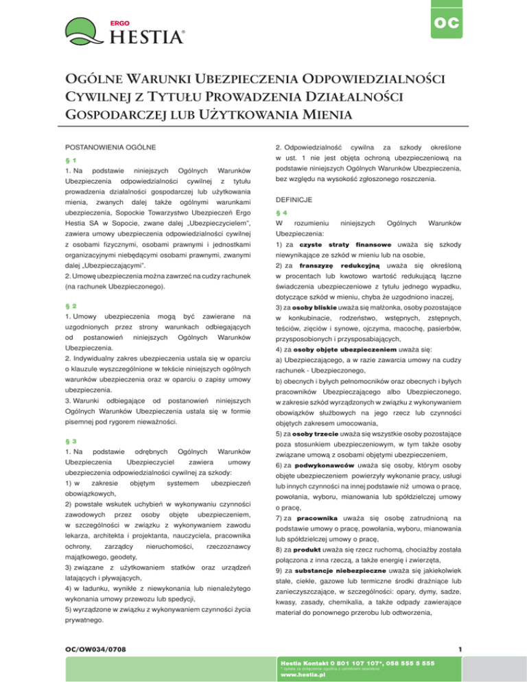 OC OGÓLNE WARUNKI UBEZPIECZENIA ODPOWIEDZIALNOŚCI CYWILNEJ Z TYTUŁU PROWADZENIA DZIAŁALNOŚCI GOSPODARCZEJ LUB UŻYTKOWANIA MIENIA POSTANOWIENIA OGÓLNE 2. Odpowiedzialność §1 w ust. 1 nie jest objęta ochroną ubezpieczeniową na 1. Na podstawie Ubezpieczenia niniejszych Ogólnych odpowiedzialności Warunków cywilnej z tytułu cywilna za szkody określone podstawie niniejszych Ogólnych Warunków Ubezpieczenia, bez względu na wysokość zgłoszonego roszczenia. prowadzenia działalności gospodarczej lub użytkowania mienia, zwanych dalej także ogólnymi warunkami DEFINICJE ubezpieczenia, Sopockie Towarzystwo Ubezpieczeń Ergo §4 Hestia SA w Sopocie, zwane dalej „Ubezpieczycielem”, W zawiera umowy ubezpieczenia odpowiedzialności cywilnej Ubezpieczenia: z osobami fizycznymi, osobami prawnymi i jednostkami 1) za czyste straty finansowe uważa się szkody organizacyjnymi niebędącymi osobami prawnymi, zwanymi niewynikające ze szkód w mieniu lub na osobie, rozumieniu niniejszych Ogólnych dalej „Ubezpieczającymi”. 2) za 2. Umowę ubezpieczenia można zawrzeć na cudzy rachunek w procentach lub kwotowo wartość redukującą łączne (na rachunek Ubezpieczonego). świadczenia ubezpieczeniowe z tytułu jednego wypadku, franszyzę redukcyjną uważa się Warunków określoną dotyczące szkód w mieniu, chyba że uzgodniono inaczej, §2 3) za osoby bliskie uważa się małżonka, osoby pozostające 1. Umowy ubezpieczenia mogą być zawierane na w konkubinacie, rodzeństwo, wstępnych, zstępnych, uzgodnionych przez strony warunkach odbiegających teściów, zięciów i synowe, ojczyma, macochę, pasierbów, od przysposobionych i przysposabiających, postanowień niniejszych Ogólnych Warunków Ubezpieczenia. 4) za osoby objęte ubezpieczeniem uważa się: 2. Indywidualny zakres ubezpieczenia ustala się w oparciu a) Ubezpieczającego, a w razie zawarcia umowy na cudzy o klauzule wyszczególnione w tekście niniejszych ogólnych rachunek - Ubezpieczonego, warunków ubezpieczenia oraz w oparciu o zapisy umowy b) obecnych i byłych pełnomocników oraz obecnych i byłych ubezpieczenia. pracowników Ubezpieczającego albo Ubezpieczonego, 3. Warunki odbiegające od postanowień niniejszych w zakresie szkód wyrządzonych w związku z wykonywaniem Ogólnych Warunków Ubezpieczenia ustala się w formie obowiązków służbowych na jego rzecz lub czynności pisemnej pod rygorem nieważności. objętych zakresem umocowania, 5) za osoby trzecie uważa się wszystkie osoby pozostające §3 1. Na poza stosunkiem ubezpieczeniowym, w tym także osoby podstawie Ubezpieczenia odrębnych Ogólnych Ubezpieczyciel Warunków zawiera umowy ubezpieczenia odpowiedzialności cywilnej za szkody: 1) w zakresie objętym systemem ubezpieczeń obowiązkowych, przez 6) za podwykonawców uważa się osoby, którym osoby objęte ubezpieczeniem powierzyły wykonanie pracy, usługi lub innych czynności na innej podstawie niż umowa o pracę, powołania, wyboru, mianowania lub spółdzielczej umowy 2) powstałe wskutek uchybień w wykonywaniu czynności zawodowych związane umową z osobami objętymi ubezpieczeniem, osoby o pracę, ubezpieczeniem, 7) za pracownika uważa się osobę zatrudnioną na w szczególności w związku z wykonywaniem zawodu podstawie umowy o pracę, powołania, wyboru, mianowania lekarza, architekta i projektanta, nauczyciela, pracownika lub spółdzielczej umowy o pracę, ochrony, 8) za produkt uważa się rzecz ruchomą, chociażby została zarządcy objęte nieruchomości, rzeczoznawcy majątkowego, geodety, połączona z inna rzeczą, a także energię i zwierzęta, 3) związane z użytkowaniem statków oraz urządzeń 9) za substancje niebezpieczne uważa się jakiekolwiek latających i pływających, 4) w ładunku, wynikłe z niewykonania lub nienależytego wykonania umowy przewozu lub spedycji, 5) wyrządzone w związku z wykonywaniem czynności życia stałe, ciekłe, gazowe lub termiczne środki drażniące lub zanieczyszczające, w szczególności: opary, dymy, sadze, kwasy, zasady, chemikalia, a także odpady zawierające materiał do ponownego przerobu lub odtworzenia, prywatnego. OC/OW034/0708 1 Hestia Kontakt 0 801 107 107*, 058 555 5 555 * opłata za połączenie zgodna z cennikiem operatora www.hestia.pl 10) za szkodę na osobie uważa się straty powstałe z wskutek śmierci, uszkodzenia ciała lub rozstroju zdrowia, za szkody w związku z prowadzeniem działalności a gospodarczej. także utracone korzyści poniesione przez zakresu ubezpieczenia odpowiedzialność cywilną poszkodowanego, które by mógł osiągnąć, gdyby nie doznał uszkodzenia ciała lub rozstroju zdrowia, §6 11) za szkodę w mieniu uważa się straty powstałe Umową wskutek zniszczenia lub uszkodzenia rzeczy ruchomej albo o wykonanie umów, o należyte wykonanie umów, roszczenia nieruchomości poszkodowanego, a także utracone korzyści, z tytułu zastępczego wykonania umów, roszczenia o zwrot które by mógł osiągnąć, gdyby nie zostało zniszczone lub świadczeń oraz roszczenia o zwrot kosztów poniesionych uszkodzone jego mienie, na poczet lub w celu wykonania umów. ubezpieczenia nie są objęte roszczenia 12) za wartości pieniężne uważa się krajowe i zagraniczne znaki pieniężne, czeki, weksle i inne dokumenty zastępujące w obrocie gotówkę oraz złoto, srebro i wyroby z tych metali, kamienie szlachetne i perły, a także platynę i pozostałe §7 Ubezpieczenie nie obejmuje szkód wyrządzonych umyślnie przez Ubezpieczającego oraz osoby, za które ponosi odpowiedzialność, przy czym świadomość wprowadzenia metale z grupy platynowców, 13) za wypadek uważa się śmierć, doznanie rozstroju do obrotu wadliwego produktu lub wadliwości wykonanej zdrowia, pracy albo usługi uważa się za równoznaczne z winą uszczerbku na zdrowiu, uszkodzenie lub umyślną. zniszczenie mienia, 14) za producenta produktu finalnego uważa się osobę, która wykorzystuje rzeczy po