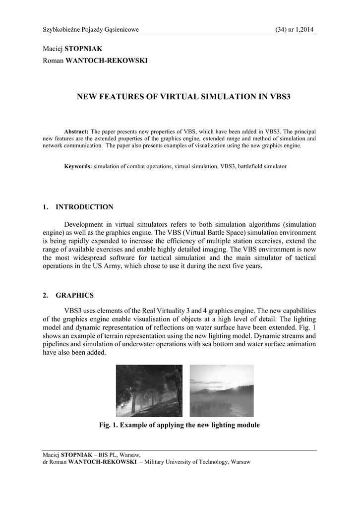 Szybkobieżne Pojazdy Gąsienicowe (34) nr 1,2014 Maciej STOPNIAK Roman WANTOCH-REKOWSKI NEW FEATURES OF VIRTUAL SIMULATION IN VBS3 Abstract: The paper presents new properties of VBS, which have been added in VBS3. The principal new features are the extended properties of the graphics engine, extended range and method of simulation and network communication. The paper also presents examples of visualization using the new graphics engine. Keywords: simulation of combat operations, virtual simulation, VBS3, battlefield simulator 1. INTRODUCTION Development in virtual simulators refers to both simulation algorithms (simulation engine) as well as the graphics engine. The VBS (Virtual Battle Space) simulation environment is being rapidly expanded to increase the efficiency of multiple station exercises, extend the range of available exercises and enable highly detailed imaging. The VBS environment is now the most widespread software for tactical simulation and the main simulator of tactical operations in the US Army, which chose to use it during the next five years. 2. GRAPHICS VBS3 uses elements of the Real Virtuality 3 and 4 graphics engine. The new capabilities of the graphics engine enable visualisation of objects at a high level of detail. The lighting model and dynamic representation of reflections on water surface have been extended. Fig. 1 shows an example of terrain representation using the new lighting model. Dynamic streams and pipelines and simulation of underwater operations with sea bottom and water surface animation have also been added. Fig. 1. Example of applying the new lighting module Maciej STOPNIAK – BIS PL, Warsaw, dr Roman WANTOCH-REKOWSKI – Military University of Technology, Warsaw Maciej STOPNIAK, Roman WANTOCH-REKOWSKI 3. SIMULATION ENGINE AND NETWORK COMMUNICATION The simulator is now furnished with improved network communication mechanisms for multiple station exercises. The new network communication mechanisms provide high performance imaging (50 FPS), even with several hundred scenario objects (AI or trainee). Exercises with two hundred or more participants and several hundred objects controlled by artificial intelligence are performed on a regular basis. Fig. 2 shows an example of the architecture. Fig. 1. Architecture of an example of exercise configuration 4. DYNAMICALLY RENDERED VEGETATION AND PROCEDURAL SNOW The newest version of VBS3 provides mechanisms that enable generating procedural biotopes for a given map. Such a solution enables adapting the given map to the needs of trainees in terms of vegetation changing with the time of year or in accordance with the training scenario. Another advantage of such a solution is that special tools for generating maps are not required. The generated map also takes up much less memory space, as the position of every tree does not have to be permanently recorded in the map file – this is important because VBS generates maps that cover hundreds of square kilometres which can have millions of trees. Fig. 3 shows the same fragment of the map with dynamically generated biotopes. Fig. 3. Dynamic generation of biotopes A new property of the most recent VBS3 version is the ability to use snowfall algorithms (procedural snow layer). Snowfall algorithms are not constrained to visualise snow, they also represent the interaction of snow with moving objects. Fig. 4 shows an example of the representation. Snow is deposited in layers and affects the speed of simulated vehicles, thermal signature and fatigue. New Features of Virtual Simulation in VBS3 Fig. 4. Rendering of procedural snow 5. MAPS To handle large areas during exercises, VBS3 now supports building maps covering a terrain of up to 2200km x 2200km in size. Maps of this size enable representing vast areas. Fig. 5 shows an example of a large-sized map. Fig. 5. Example of a large-sized map 6. OBJECTS As regards objects, the vehicle condition properties have been expanded. Now it is possible to define several vehicle components that can break down and be repaired in real time. The simulation represents failures of the individual components, possibilities of repairing them and the duration of the repair. A new element is the ability to simulate systems that support vehicle driving, such as: ABS, hand brake. Independent suspension, front and rear wheel drives are simulated, which has an effect on the manner of driving under various conditions. Human injury severities have also been expanded, which during simulation has a strong effect on the scope of possible actions, affecting also the AI algorithms. Treatment is also simulated, as are the effects of wrong actions. Deep changes have been made in models of buildings to enable representation of partial demolition or damage. Building elements retain their basic physical properties when damaged and can also cause injuries (see Fig. 6). Fig. 6. Examples of the representation of the new physics of building damage New objects have been introduced to enable creating underground passages and tunnels adapted to land configuration. Maciej STOPNIAK, Roman WANTOCH-REKOWSKI A new element is the introduction of the aspect of object camouflage (see Fig. 7) for generating images in exercises with the use of augmented reality (AR) technology. Fig. 7. An example of object camouflage 7. SUMMARY New properties available in VBS3 enable construction of simulators and training devices that closely map the reality that surrounds the trainee. The increased number of available objects (vehicles, weapons, aeroplanes, helicopters) and additional maps enable the instructors to locate the trainees within new, previously unattainable scenarios. 8. REFERENCES [1]Wantoch-Rekowski R. (Editor), Programowalne środowisko symulacji wirtualnej VBS2 [Programmable environment of virtual simulation VBS2], 2013 PWN, ISBN 978-83-01-17323-4 [2]Koszela J., Wantoch-Rekowski R.: Koncepcja symulatora do szkolenia kierowców wozów bojowych PSP w zakresie zadań realizow