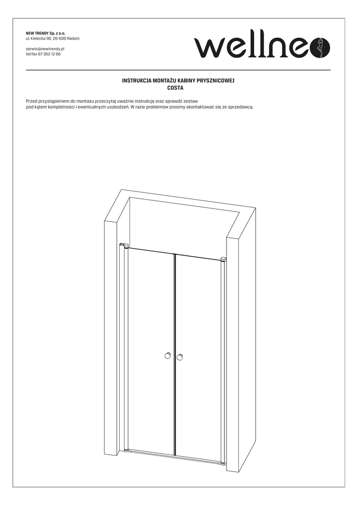 NEW TRENDY Sp. z o.o. ul. Kielecka 90, 26-600 Radom [email protected] tel/fax 67 262 12 66 INSTRUKCJA MONTAŻU KABINY PRYSZNICOWEJ COSTA Przed przystąpieniem do montażu przeczytaj uważnie instrukcję oraz sprawdź zestaw pod kątem kompletności i ewentualnych uszkodzeń. W razie problemów prosimy skontaktować się ze sprzedawcą.