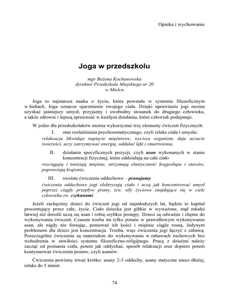 Opieka i wychowanie Joga w przedszkolu mgr Bożena Kochanowska dyrektor Przedszkola Miejskiego nr 20 w Mielcu Joga to najstarsza nauka o życiu, która powstała w systemie filozoficznym w Indiach. Joga oznacza ujarzmienie swojego ciała. Dzięki uprawianiu jogi można uzyskać jaśniejszy umysł, przyjazny i swobodny stosunek do drugiego człowieka, a także zdrowie i lepszą sprawność w każdym działaniu, które człowiek podejmuje. W jodze dla przedszkolaków można wykorzystać trzy elementy ćwiczeń fizycznych: I. stan rozluźnienia psychosomatycznego, czyli relaks ciała i umysłu: relaksacja likwiduje napięcie mięśniowe, wycisza organizm, daje uczucie świeżości, uczy zatrzymywać energię, oddalać lęki i zmartwienia, II. działania specyficznych pozycji, czyli asan wykonanych w stanie koncentracji fizycznej, które oddziałują na całe ciało rozciągają i tonizują mięśnie, utrzymują elastyczność kręgosłupa i stawów, poprawiają krążenie, swoiste ćwiczenia oddechowe – pranajamy III. ćwiczenia oddechowe jogi elektryzują ciało i uczą jak koncentrować umysł poprzez ciągły przepływ prany, tzw. siły życiowe znajdujące się w ciele człowieka zw. czekanami. Jeżeli zachęcimy dzieci do ćwiczeń jogi od najmłodszych lat, będzie to kapitał procentujący przez całe, życie. Ciało dziecka jest gibkie w wyważone, stąd młodsi łatwiej niż dorośli uczą się asan i robią szybkie postępy. Dzieci są odważne i chętne do wykonywania ćwiczeń. Czasem trzeba im tylko pomóc w prawidłowym wykonywaniu asan, ale nigdy nie forsując, ponieważ ich kości i mięśnie ciągle rosną. Jedynym problemem dla dzieci jest koncentracja. Trzeba, więc ćwiczenia jogi łączyć z zabawą. Poszczególne ćwiczenia są materiałem do wykonywania w zabawach ruchowych bez wchodzenia w zawiłości systemu filozoficzno-religijnego. Pracę z dziećmi należy zacząć od poznania ciała, potem jak oddychać, sposób relaksacji oraz dopiero potem kontynuować ćwiczenia postaw, czyli asanów. Ćwiczenia powinny trwać krótko: asany 2-3 oddechy, asany statyczne nieco dłużej, relaks do 5 minut. 74 CKPiDN w Mielcu – Zeszyty nauczycielskie – Nr 2/2005 Relaks – czyli rozluźnienie mięśni jest fundamentalnym ćwiczeniem fizycznym w jodze. Stan koncentracji wraz z sugestią rozluźnienia mięśni powoduje spokój metaboliczny i emocjonalny, obniżenie napięcia mięśni szkieletowych i zwiększony stan równowagi psychofizycznej. Postawy (asany) – jogi zapewniają człowiekowi zdrowie fizyczne i psychiczne. Utrzymanie tych postaw przez określony czas powoduje przekrwienie odpowiednich narządów i części ciała. Systematyczne wykonywanie postaw tworzą odruchowo warunkowe połączenia nerwowe i takież reakcje autonomiczne, na podłożu których może przejawiać się sprawniejsze działanie świadomości. Oddech – jest życiem. Zadziwiająco mało uwagi poświęcamy właściwemu oddychaniu w życiu codziennym. Dla jogina właściwe oddychanie pełni dwojaką funkcję: - dostarczenie tlenu do krwi, a zatem i do mózgu, - kontroluje pranę - czyli energię życiową. Istotnym składnikiem systemu jogi jest stosowanie kontrolowanych oddechów. Zaleca się: przedłużanie wdechu, przedłużanie wydechu, zatrzymanie oddychania na szczycie wdechu, zwalnianie i pogłębianie oddychania. W pranajamie mamy trzy stadia oddychania: wdech – zatrzymanie – wydech Tak więc w dobie zagrożeń ekologicznych, należy uczyć sposobów radzenia sobie z atakiem cywilizacji na nasze coraz mniej odporne organizmy. Asany utrzymują bowiem w dobrej formie nasze ciało i naszą psychikę. Joga w przedszkolu to najlepszy moment, aby dzieci uczyły się dbać o siebie, rozumiało swoje ciało, aby dzięki jodze było sprawne i zdrowe. Literatura: 1. Szyszko-Bohusz „Joga – indyjski system filozoficzny, leczniczy i pedagogiczny, PAN, 1978 2. pod red. Grochmala S. „Teoria i metodyka ćwiczeń relaksacyjnokompensacyjnych”, PZWL, 1986 75