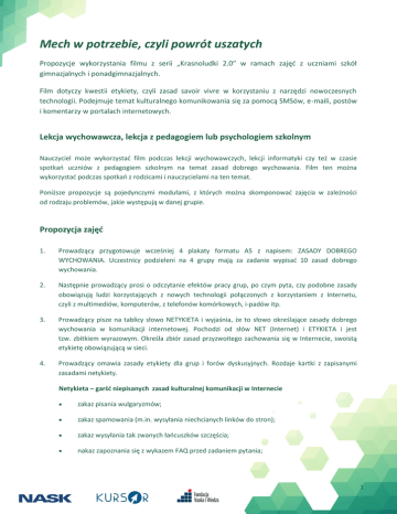 Mech w potrzebie, czyli powrót uszatych Propozycje wykorzystania filmu z serii „Krasnoludki 2.0” w ramach zajęć z uczniami szkół gimnazjalnych i ponadgimnazjalnych. Film dotyczy kwestii etykiety, czyli zasad savoir vivre w korzystaniu z narzędzi nowoczesnych technologii. Podejmuje temat kulturalnego komunikowania się za pomocą SMSów, e-maili, postów i komentarzy w portalach internetowych. Lekcja wychowawcza, lekcja z pedagogiem lub psychologiem szkolnym Nauczyciel może wykorzystać film podczas lekcji wychowawczych, lekcji informatyki czy też w czasie spotkań uczniów z pedagogiem szkolnym na temat zasad dobrego wychowania. Film ten można wykorzystać podczas spotkań z rodzicami i nauczycielami na ten temat. Poniższe propozycje są pojedynczymi modułami, z których można skomponować zajęcia w zależności od rodzaju problemów, jakie występują w danej grupie. Propozycja zajęć 1. Prowadzący przygotowuje wcześniej 4 plakaty formatu A5 z napisem: ZASADY DOBREGO WYCHOWANIA. Uczestnicy podzieleni na 4 grupy mają za zadanie wypisać 10 zasad dobrego wychowania. 2. Następnie prowadzący prosi o odczytanie efektów pracy grup, po czym pyta, czy podobne zasady obowiązują ludzi korzystających z nowych technologii połączonych z korzystaniem z Internetu, czyli z multimediów, komputerów, z telefonów komórkowych, i-padów itp. 3. Prowadzący pisze na tablicy słowo NETYKIETA i wyjaśnia, że to słowo określające zasady dobrego wychowania w komunikacji internetowej. Pochodzi od słów NET (Internet) i ETYKIETA i jest tzw. zbitkiem wyrazowym. Określa zbiór zasad przyzwoitego zachowania się w Internecie, swoistą etykietę obowiązującą w sieci. 4. Prowadzący omawia zasady etykiety dla grup i forów dyskusyjnych. Rozdaje kartki z zapisanymi zasadami netykiety. Netykieta – garść niepisanych zasad kulturalnej komunikacji w Internecie zakaz pisania wulgaryzmów; zakaz spamowania (m.in. wysyłania niechcianych linków do stron); zakaz wysyłania tak zwanych łańcuszków szczęścia; nakaz zapoznania się z wykazem FAQ przed zadaniem pytania; 1 stosowanie się do reguł pisania obowiązujących w danej grupie, np. sposobu kodowania polskich liter, zasad cytowania, możliwości wysyłania (lub nie) wiadomości formatowanych w HTML-u, możliwości dołączania (lub nie) plików binarnych, co zwykle jest szczegółowo opisane w FAQ danej grupy; zakaz nadmiernego cross-postowania, czyli wysyłania e-maili lub postów do kilku grup naraz; zakaz wysyłania listów (e-maili) do wielu osób naraz z jawnymi adresami poczty elektronicznej (stosujemy kopię ukrytą); zakaz pisania nie na temat (OT – off-topic); zakaz pisania kilka razy z rzędu (szczególnie restrykcyjnie używany na forach posiadających funkcję edycji postu); zakaz odpowiadania nad cytowanym fragmentem (top-posting); zakaz pisania wiadomości wielkimi literami. 5. Prowadzący proponuje pokaz filmu „Mech w potrzebie” i prosi, aby spróbować rozpoznać złamanie lub przestrzeganie zasad wypisanych na kartkach przez bohaterów filmu. 6. Po obejrzeniu filmu uczestnicy dzielą się swoimi obserwacjami i refleksjami, prowadzący może to komentować. Ważne jest, by osoba prowadząca zajęcia dokładnie i kilka razy obejrzała film i przygotowała się na pytania i ewentualną korektę obserwacji uczestników warsztatu. *** Podczas zajęć z dorosłymi warto podjąć temat: „Czy uczymy nasze dzieci, naszych wychowanków zasad dobrego wychowania w Sieci i w korzystaniu z nowoczesnych technologii?”. Można podać przykłady autentycznych „gaf etykietowych” młodych ludzi i zaproponować, by uczestnicy zajęć poprawili je i podali prawidłowe formy, np. 2 Cytat z notatek młodzieży Prawidłowa forma SMS do mamy: EloMum, no to kiedy idziemy na pizze? Pisząc SMSy do dorosłych (i do rodziców też) warto stosować polskie znaki i nie używać „slangu”, np. Cześć Mamo, o której idziemy na pizzę? E-mail: W temacie listu do kilku osób nadawca napisał: Cześć wszyscy jutro urodziny moje o 15.00 będziecie? Natomiast w treści listu nie ma nic. Treść e-maila wpisujemy w innym miejscu niż temat. Temat powinien brzmieć np. Zapraszam na moje urodziny. Treść zaproszenia powinna być elegancka, zawierać powitanie, pożegnanie i pełną informację o imprezie, można dodać grafikę, zdjęcie, np. Witam Was Wszystkich! Serdecznie zapraszam na moje urodziny, które odbędą się jutro, tj. 18 września b.r. od godz. 15.00 do 17.00 w moim domu przy ul. Klonowej 5 w Warszawie. Proszę o potwierdzenie obecności e-mailem lub pod telefonem 000-000-000. Pozdrawiam i do zobaczenia, Antoni Jaskier E-mail maturzysty do nauczyciela: Czy mogę jutro zdawać zaległą fizykę? Antek Szanowny Panie Profesorze. Ponieważ nie było mnie przez tydzień w szkole z powodu choroby, zwracam się z uprzejmą prośbą o możliwość zaliczenia zaległej klasówki, np. juto. Z góry dziękuję, Antoni Jaskier Artur wysłał do Antka 20 SMSów o treści: Nawet jeśli Antek wiecznie o czymś zapomina, PAMIĘTAJ ŻE JUTRO O 19.00 IDZIEMY to Artur nie powinien spamować. Wystarczy NA TRENING! jeden SMS i ewentualnie telefoniczne przypomnienie. Post na forum internetowym dotyczącym porad kulinarnych: Uwaga Ziomy! Polecam moje usługi! Tu jest link : www.lulekgotuje.pl Warto zapoznać się z zasadami korzystania z danego forum. Zazwyczaj nie wypada zamieszczać tam reklam własnej działalności, chyba że forum tego właśnie dotyczy. W propozycjach cytatów uczestnicy mogą umieścić własne, inspirując się swoimi doświadczeniami w korzystaniu z Sieci. Można dla ułatwienia podzielić uczestników na grupy i każdej rozdać kartki z napisami (np. w formie podobnej jak wyżej tabelki: gafy SMSowe, gafy na forum internetowym, gafy e-mailowe, gafy innego rodzaju. Po trzech minutach pracy grupy przekazują sobie kartki i dopisują swoje propozycje i pomysły. Tego rodzaju rundę wymiany kartek należy kontr
