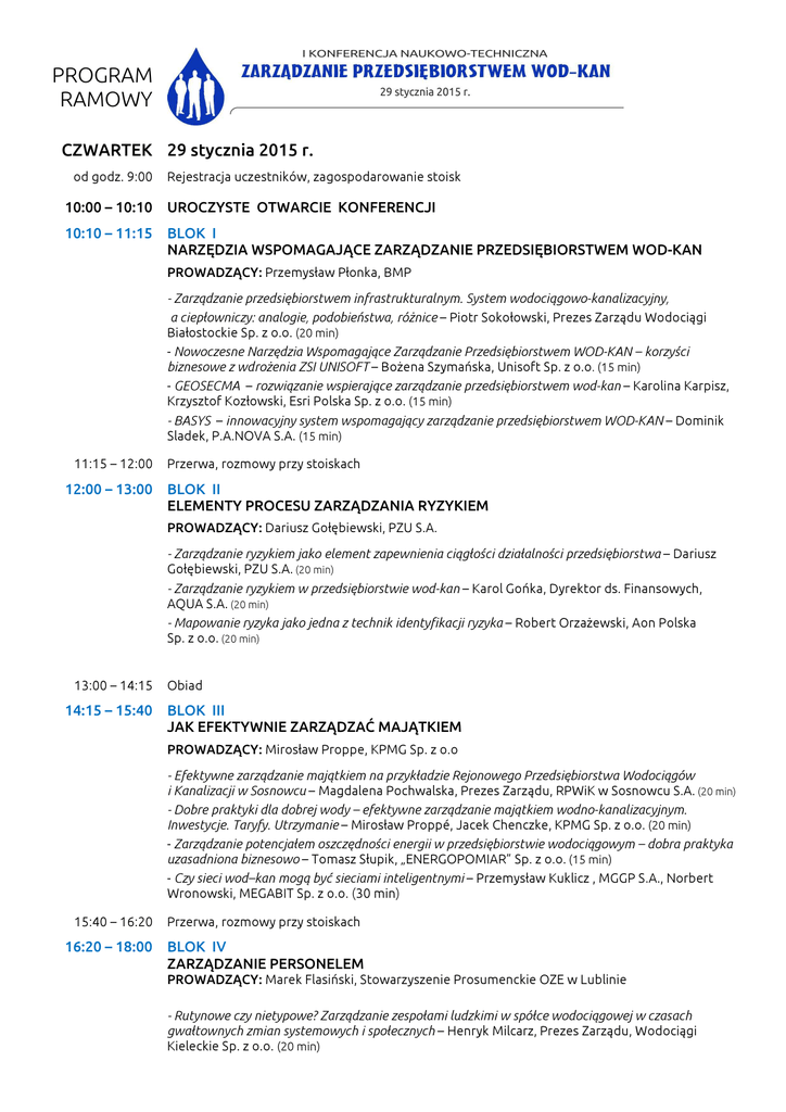 PROGRAM RAMOWY CZWARTEK 29 stycznia 2015 r. od godz. 9:00 Rejestracja uczestników, zagospodarowanie stoisk 10:00 – 10:10 UROCZYSTE OTWARCIE KONFERENCJI 10:10 – 11:15 BLOK I NARZĘDZIA WSPOMAGAJĄCE ZARZĄDZANIE PRZEDSIĘBIORSTWEM WOD-KAN PROWADZĄCY: Przemysław Płonka, BMP - Zarządzanie przedsiębiorstwem infrastrukturalnym. System wodociągowo-kanalizacyjny, a ciepłowniczy: analogie, podobieństwa, różnice – Piotr Sokołowski, Prezes Zarządu Wodociągi Białostockie Sp. z o.o. (20 min) - Nowoczesne Narzędzia Wspomagające Zarządzanie Przedsiębiorstwem WOD-KAN – korzyści biznesowe z wdrożenia ZSI UNISOFT – Bożena Szymańska, Unisoft Sp. z o.o. (15 min) - GEOSECMA – rozwiązanie wspierające zarządzanie przedsiębiorstwem wod-kan – Karolina Karpisz, Krzysztof Kozłowski, Esri Polska Sp. z o.o. (15 min) - BASYS – innowacyjny system wspomagający zarządzanie przedsiębiorstwem WOD-KAN – Dominik Sladek, P.A.NOVA S.A. (15 min) 11:15 – 12:00 12:00 – 13:00 Przerwa, rozmowy przy stoiskach BLOK II ELEMENTY PROCESU ZARZĄDZANIA RYZYKIEM PROWADZĄCY: Dariusz Gołębiewski, PZU S.A. - Zarządzanie ryzykiem jako element zapewnienia ciągłości działalności przedsiębiorstwa – Dariusz Gołębiewski, PZU S.A. (20 min) - Zarządzanie ryzykiem w przedsiębiorstwie wod-kan – Karol Gońka, Dyrektor ds. Finansowych, AQUA S.A. (20 min) - Mapowanie ryzyka jako jedna z technik identyfikacji ryzyka – Robert Orzażewski, Aon Polska Sp. z o.o. (20 min) 13:00 – 14:15 14:15 – 15:40 Obiad BLOK III JAK EFEKTYWNIE ZARZĄDZAĆ MAJĄTKIEM PROWADZĄCY: Mirosław Proppe, KPMG Sp. z o.o - Efektywne zarządzanie majątkiem na przykładzie Rejonowego Przedsiębiorstwa Wodociągów i Kanalizacji w Sosnowcu – Magdalena Pochwalska, Prezes Zarządu, RPWiK w Sosnowcu S.A. (20 min) - Dobre praktyki dla dobrej wody – efektywne zarządzanie majątkiem wodno-kanalizacyjnym. Inwestycje. Taryfy. Utrzymanie – Mirosław Proppé, Jacek Chenczke, KPMG Sp. z o.o. (20 min) - Zarządzanie potencjałem oszczędności energii w przedsiębiorstwie wodociągowym – dobra praktyka uzasadniona biznesowo – Tomasz Słupik, „ENERGOPOMIAR” Sp. z o.o. (15 min) - Czy sieci wod–kan mogą być sieciami inteligentnymi – Przemysław Kuklicz , MGGP S.A., Norbert Wronowski, MEGABIT Sp. z o.o. (30 min) 15:40 – 16:20 Przerwa, rozmowy przy stoiskach 16:20 – 18:00 BLOK IV ZARZĄDZANIE PERSONELEM PROWADZĄCY: Marek Flasiński, Stowarzyszenie Prosumenckie OZE w Lublinie - Rutynowe czy nietypowe? Zarządzanie zespołami ludzkimi w spółce wodociągowej w czasach gwałtownych zmian systemowych i społecznych – Henryk Milcarz, Prezes Zarządu, Wodociągi Kieleckie Sp. z o.o. (20 min) - Nowe wyzwania w zakresie zarządzania personelem – teoria i praktyka – Marek Flasiński, Prezes Zarządu, Stowarzyszenie Prosumenckie OZE w Lublinie (20 min) - Rola efektywnego systemu wynagrodzeń w optymalizacji pracy branży wodociągowej – Jolanta Krawczyk, eduPartners (20 min) - Motywacja jako system uruchomienia zachowania do realizacji celu – Bernard Krekora, Prezes PWiK Sp. z o.o. Mińsk Mazowiecki (20 min) - Zmiany w polityce personalnej Bytomskiego Przedsiębiorstwa Komunalnego Sp. z o. o. w związku z pozyskanymi środkami unijnymi – Dawid Zięba, Prezes Zarządu, Bytomskie Przedsiębiorstwo Komunalne Sp. z o.o. (20 min) 18:00 – 18:30 18:30 – 19:30 Przerwa, rozmowy przy stoiskach WYKŁAD ZAMYKAJĄCY - Strategia i taktyka w planowaniu działań bojowych. Adaptacja systemu dowodzenia na niwę środowiska cywilnego – podpułkownik Krzysztof Przepiórka, Fundacja Byłych Żołnierzy i Funkcjonariuszy Sił Specjalnych "Szturman" (30 min) 19:30 – 20:00 20:00 – 24:00 Demontaż stoisk KOLACJA, SPOTKANIE INTEGRACYJNE Organizator zastrzega sobie prawo do zmian w programie