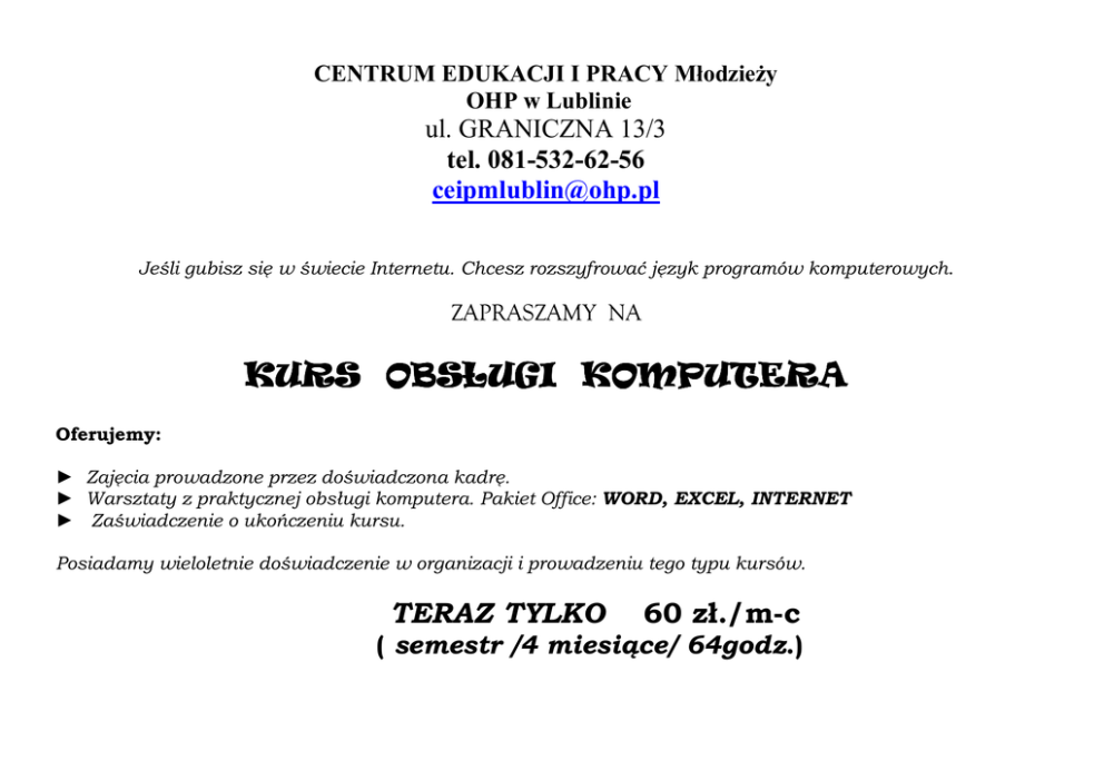 CENTRUM EDUKACJI I PRACY MłodzieŜy OHP w Lublinie ul. GRANICZNA 13/3 tel. 081-532-62-56 [email protected] Jeśli gubisz się w świecie Internetu. Chcesz rozszyfrować język programów komputerowych. ZAPRASZAMY NA KURS OBSŁUGI KOMPUTERA Oferujemy: ► Zajęcia prowadzone przez doświadczona kadrę. ► Warsztaty z praktycznej obsługi komputera. Pakiet Office: WORD, EXCEL, INTERNET ► Zaświadczenie o ukończeniu kursu. Posiadamy wieloletnie doświadczenie w organizacji i prowadzeniu tego typu kursów. TERAZ TYLKO 60 zł./m-c ( semestr /4 miesiące/ 64godz.) W programie kursu znajdzie się między innymi: Co nieco o komputerze Pakiet Office: WORD – praca z dokumentami tworzenie listów seryjnych i etykiet, formularzy zakładki i indeksy dostosowanie Worda do własnych potrzeb EXCEL – łączenie baz danych z róŜnych źródeł analizowanie alternatywnych zbiorów danych tworzenie dynamicznych list za pomocą tabel przestawnych wykresy, funkcje, drukowanie, statystyka INTERNET : - teoria i praktyka wyszukiwania informacji - komunikacja ( poczta , komunikatory, VIP ) - usługi dostępne w Internecie - funkcje społeczne Internetu ( blog, czat, społeczności )
