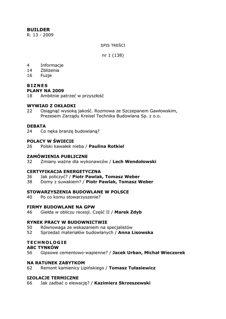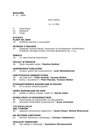 BUILDER R. 13 - 2009 SPIS TREŚCI nr 1 (138) 4 14 16 Informacje ZbliŜenia Fuzje BIZNES PLANY NA 2009 18 Ambitnie patrzeć w przyszłość WYWIAD Z OKŁADKI 22 Osiągnąć wysoką jakość. Rozmowa ze Szczepanem Gawłowskim, Prezesem Zarządu Kreisel Technika Budowlana Sp. z o.o. DEBATA 24 Co nęka branŜę budowlaną? POLACY W ŚWIECIE 26 Polski kawałek nieba / Paulina Rotkiel ZAMÓWIENIA PUBLICZNE 32 Zmiany waŜne dla wykonawców / Lech Wendołowski CERTYFIKACJA ENERGETYCZNA 36 Jak policzyć? / Piotr Pawlak, Tomasz Weber 38 Domy z suwakiem? / Piotr Pawlak, Tomasz Weber STOWARZYSZENIA BUDOWLANE W POLSCE 40 Po co komu stowarzyszenie? FIRMY BUDOWLANE NA GPW 46 Giełda w obliczu recesji. Część II / Marek Zdyb RYNEK PRACY W BUDOWNICTWIE 50 Równowaga ze wskazaniem na specjalistów 52 SprzedaŜ materiałów budowlanych / Anna Lisowska TECHNOLOGIE ABC TYNKÓW 56 Gipsowe cementowo-wapienne? / Jacek Urban, Michał Wieczorek NA RATUNEK ZABYTKOM 62 Remont kamienicy Lipińskiego / Tomasz Tułasiewicz IZOLACJE TERMICZNE 66 Jak zadbać o elewację? / Kazimierz Skrzeszewski TWORZYWA SZTUCZNE W BUDOWNICTWIE 70 Okna z polichlorku winylu. Część II / Katarzyna Cesluk DACHY 74 Praktycznym okiem / Mariusz Kościesza IZOLACJE TERMICZNE 76 Liderzy pod lupą / Mariusz Rejment JAK SIĘ BUDUJE METRO 80 II linia metra. Odcinek centralny BUDOWNICTWO DROGOWE 82 Uszkodzenia nawierzchni asfaltowych / Wojciech Bańkowski PROJEKTOWANIE OBIEKTÓW BUDOWLANYCH 88 Podstawy projektowania według PN-EN 1990:2004 / Antoni Biegus TECHNIKA GRZEWCZA 92 Ekoprojekt na paliwo stałe / Krystyna Kubica 94 RYNEK nr 2 (139) 6 12 Informacje ZbliŜenia BIZNES TARGI 14 Budma w dobrej formie / Grzegorz Przepiórka BIZNES - FIRMA 19 Pracujemy na wspólny sukces FORUM NOWOCZESNYCH TECHNOLOGII TOP BUILDER 2009 20 Liderzy innowacyjności / Grzegorz Przepiórka WYWIAD I OKŁADKI 28 Będziemy sprzedawać wiedzę, a deskowania będą jej uzupełnieniem. Rozmowa z Andrzejem Kozłowskim, Prezesem Zarządu ULMA Construccion Polska S.A. GALA BCC 32 Mocna strona polskiego biznesu / Grzegorz Przepiórka PLANY NA 2009 34 Ambitnie w 2009 WYWIAD 36 Filozofia zdrowego biznesu. Rozmowa z Michałem Wrzoskiem, Dyrektorem Handlowym PERI Polska Sp.z o.o. OCENA RYZYKA BIZNESOWEGO 38 Prognoza ekonomiczna dla Polski / Stanisław Gomółka INTERAKCJE 40 5 pytań do... Macieja Nowickiego, Ministra Środowiska DEBATA 42 Co nęka branŜę budowlaną? RYNEK PRODUCENTÓW SZKŁA 44 Wyzwania stojące przed branŜą szkła płaskiego w Europie / Dariusz Woźniak RYNEK PRACY W BUDOWNICTWIE 48 Z kryzysu silni wyjdą silniejsi / Piotr Siewierski TECHNOLOGIE OPROGRAMOWANIE DLA BUDOWNICTWA 52 Modelowanie informacji o budynku / Wojciech Jędrzejczak KONSTRUKCJE STALOWE 56 Systemy lekkiej obudowy / Jarosław Stankiewicz JAK SIĘ BUDUJE METRO 60 W centrum uwagi WIZYTÓWKI EUROPY 62 Kompleksowe rozwiązania w szklanym biurowcu / Justyna Sobiecka ELEWACYJNE WYPRAWY TYNKARSKIE 64 Pargeting elewacyjny / Mariusz Rejmert IZOLACJE TERMICZNE 68 Odbiór i utrzymanie obiektów budowlanych / Kazimierz Skrzeszewski TWORZYWA SZTUCZNE W BUDOWNICTWIE 71 Woda z tworzywa sztucznego / Katarzyna Cesluk SYSTEMY WENTYLACYJNE 74 Zmienne przepływy powietrza wentylacyjnego / Joanna Ryńska BUDOWNICTWO DROGOWE 77 Era rewolucyjnych zmian / Dariusz Sybilski PROJEKTOWANIE KONSTRUKCJI STALOWYCH 80 Zgodnie z Eurokodem 3. Część 1 / Antoni Biegus KONSTRUKCJE DREWNIANE 85 10 przykazań dla budownictwa szkieletowego. Część 2 / Wojciech Nitka BUDOWNICTWO SPORTOWE 88 Stadion ŜuŜlowy w Toruniu / Anna Kęsik 92 RYNEK nr 3 (140) 6 12 Informacje ZbliŜenia BIZNES 14 Mocna strona polskiego budownictwa / Grzegorz Przepiórka WYWIAD Z OKŁADKI 24 Ze spokojem patrzymy w przyszłość. Rozmowa z Robertem Napierała, Prezesem Zarządu Libet S.A. RAPORT - RYNEK OKIEN 26 Wymowne wyniki badań / Danuta Burzyńska RAPORT 30 Polska budowlanka w kryzysie? ASM Centrum Badań i Analiz Rynku Sp. z o.o. RYNEK STALI 33 Korekta na rynku stali / Andrzej Ciepiela WYWIAD 34 Konstrukcja i montaŜ sukcesu. Rozmowa z Tadeuszem Rybakiem, Prezesem Zarządu Mostostalu Puławy S.A, BUDOWNICTWO MIESZKANIOWE 36 Konsekwencje kryzysu w mieszkaniówce / Kazimierz Kirejczyk RYNEK MIESZKANIOWY 38 Rumuński raj utracony / Grzegorz śochowski DEBATA 42 Co nęka branŜę budowlaną? RYNEK NIERUCHOMOŚCI 44 Warszawski prospekt / Kinga Barchoń CERTYFIKACJA ENERGETYCZNA BUDYNKÓW 46 Obowiązkowe, niewymagane / Piotr Pawlak RYNEK PRACY W BUDOWNICTWIE 50 Manager w kryzysie / Paula Stojanow TECHNOLOGIE BUDOWNICTWO KOMUNIKACYJNE 54 Budowa S8 / Justyna Sobiecka BUDOWNICTWO KOMUNIKACYJNE 58 Wykonawca ścian szczelinowych drogi ekspresowej / Norbert Kurek, Konrad Klimkowski OPROGRAMOWANIE DLA BUDOWNICTWA 60 Nowy wymiar projektowania / Wojciech Jędrzejczak INNOWACJE W REALIZACJACH 62 Renowacja zbiornika wody / Adriana Bensch IZOLACJE TERMICZNE 64 Zasady uŜytkowania elewacji / Kazimierz Skrzeszewski JAK SIĘ BUDUJE METRO 66 Od Wschodniego po Gocław / Grzegorz Przepiórka BUDOWNICTWO DROGOWE 68 Naprawa i przebudowa nawierzchni asfaltowych / Wojciech Bańkowski PROJEKTY ŚWIATA 72 246 metrów paryskiej innowacji / Katarzyna Burzyńska PROJEKTOWANIE KONSTRUKCJI STALOWYCH 76 Zgodnie z Eurokodem 3. Część 2 / Antoni Biegus TWORZYWA SZTUCZNE W BUDOWNICTWIE 80 Instalacje kanalizacyjne / Katarzyna Cesluk SYSTEMY GRZEWCZE 83 Pompy kontra kolektory / Artur Karczmarczyk KONSTRUKCJE PODŁÓG 84 Podłogi a ochrona akustyczna / Marcin Gtadyś BUDOWNICTWO SPORTOWE 86 Emirates wskazówką dla Narodowego / Dominik Sysak POSADZKI 89 Remmers WD System / Ireneusz Gmaj 90 RYNEK nr 4 (141) 6 12 14 Informacje ZbliŜenia List od Czytelnika BIZNES WYWIAD Z OKŁADKI 16 Czas na infrastrukturę podziemną. Rozmowa z Jolantą Kaczmarek, Kierownikiem SprzedaŜy Działu Infrastuktura Consolis Polska Sp. z o.o. DEBATA BUILDERA 18 Szansa ze znakiem zapytania TERMOMODERNIZACJA 22 Unijne termofundusze / GraŜyna Kasprzak EUROFUNDUSZE 24 Szansa i wyzwanie / Monika Filipiuk KONTRAKT