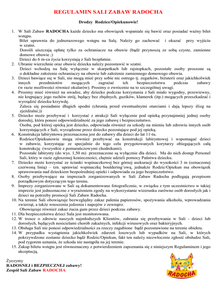 REGULAMIN SALI ZABAW RADOCHA Drodzy Rodzice/Opiekunowie! 1. W Sali Zabaw RADOCHA każde dziecko ma obowiązek wspaniale się bawić oraz posiadać ważny bilet wstępu. Bilet uprawnia do jednorazowego wstępu na Salę. Należy go zachować i okazać przy wyjściu w szatni. Dorośli uiszczają opłatę tylko za ochraniacze na obuwie (bądź przynoszą ze sobą czyste, zamienne domowe obuwie ;) Dzieci do 6 m-ca życia korzystają z Sali bezpłatnie. 2. Ubranie wierzchnie oraz obuwie dziecka należy pozostawić w szatni. Dzieci wchodzą na Salę wyłącznie w skarpetkach lub rajstopkach, pozostałe osoby proszone są o dokładne założenie ochraniaczy na obuwie lub założenie zamiennego domowego obuwia. 3. Dzieci bawiące się w Sali, nie mogą mieć przy sobie nic ostrego tj. zegarków, biżuterii oraz jakichkolwiek innych przedmiotów mogących zagrażać ich bezpieczeństwu podczas zabawy (w razie możliwości również okularów). Prosimy o zwrócenie na to szczególnej uwagi. 4. Prosimy mieć również na uwadze, aby dziecko podczas korzystania z Sali miało wygodny, przewiewny, nie krępujący jego ruchów strój, będący bez zbędnych, guzików, klamerek (itp.) mogących przeszkadzać i wyrządzić dziecku krzywdę. Zaleca się posiadanie długich spodni (chronią przed ewentualnymi otarciami i dają lepszy ślizg na zjeżdżalni;)) 5. Dziecko może przebywać i korzystać z atrakcji Sali wyłącznie pod opieką przynajmniej jednej osoby dorosłej, która ponosi odpowiedzialność za jego zabawę i bezpieczeństwo. Osoba, pod której opieką jest dziecko, odpowiada również za szkody na mieniu lub zdrowiu innych osób korzystających z Sali, wyrządzone przez dziecko pozostające pod jej opieką. 6. Konstrukcja labiryntowa przeznaczona jest do zabawy dla dzieci do lat 11-tu. Rodzice/Opiekunowie mogą również przebywać na konstrukcji labiryntowej i wspomagać dzieci w zabawie, korzystając ze specjalnie do tego celu przygotowanych korytarzy obiegających całą konstrukcję (wszystkie z pomarańczowymi chodnikami). Pozostałe labirynty (do wys. 1,50 m) przeznaczone są wyłącznie dla dzieci. Ma do nich dostęp Personel Sali, który w razie zgłoszonej konieczności, chętnie udzieli pomocy Państwa dziecku. 7. Dziecko może korzystać ze ścianki wspinaczkowej bez górnej asekuracji do wysokości 3 m (oznaczonej czerwoną linią) – tzn. uprawiać wspinaczkę bouldering’ową, jednakże Rodzic/Opiekun ma obowiązek sprawowania nad dzieckiem bezpośredniej opieki i odpowiada za jego bezpieczeństwo. 8. Osoby przebywające na imprezach zorganizowanych w Sali Zabaw Radocha podlegają przepisom porządkowym dotyczącym tego terenu. 9. Imprezy zorganizowane w Sali są dokumentowane fotograficznie, w związku z tym uczestnictwo w takiej imprezie jest jednoznaczne z wyrażeniem zgody na wykorzystanie wizerunku zarówno osób dorosłych jak i dzieci na potrzeby promocji Sali Zabaw Radocha. 10. Na terenie Sali obowiązuje bezwzględny zakaz palenia papierosów, spożywania alkoholu, wprowadzania zwierząt, a także wnoszenia jedzenia i napojów z zewnątrz. Obowiązuje również zakaz żucia gum przez dzieci podczas zabawy. 11. Dla bezpieczeństwa dzieci Sala jest monitorowana. 12. W trosce o zdrowie naszych najmłodszych Klientów, zabrania się przebywania w Sali - dzieci lub dorosłych, będących nosicielami chorób zakaźnych, infekcji wirusowych oraz bakteryjnych. 13. Obsługa Sali nie ponosi odpowiedzialności za rzeczy zagubione bądź pozostawione na terenie obiektu. 14. W przypadku wystąpienia jakichkolwiek zdarzeń losowych lub wypadków na Sali, w których pokrzywdzone zostanie dziecko bądź Rodzic/Opiekun, fakt ten należy niezwłocznie zgłosić obsłudze Sali, pod rygorem uznania, że szkoda nie nastąpiła na jej terenie. 15. Zakup biletu wstępu jest równoznaczny z potwierdzeniem zapoznania się z niniejszym Regulaminem i jego akceptacją. Życzymy RADOSNEJ i BEZPIECZNEJ zabawy! Zespół Sali Zabaw RADOCHA