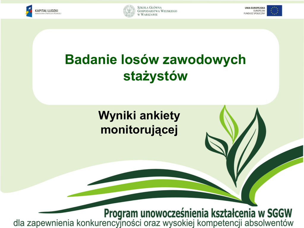 Badanie losów zawodowych stażystów Wyniki ankiety monitorującej Charakterystyka respondentów • W badaniu wzięło udział 19 osób • Rok odbycia stażu: 2010 lub 2011 • Rok ukończenia studiów: 2011 lub 2012 • Średnia wieku 25 lat Charakterystyka respondentów Płeć respondentów 9; 47% 10; 53% Kobieta Mężczyzna Charakterystyka respondentów Miejsce zamieszkania respondentów 8; 42% 11; 58% Miasto Wieś Charakterystyka respondentów Kierunek ukończonych studiów 8 7 7 6 5 4 4 3 3 2 2 2 1 1 0 TŻiŻCz Zootechnika Rolnictwo TRiL Ekonomia Informatyka Wyniki ankiety – sytuacja zawodowa Sytuacja zawodowa respondentów 3; 16% 9; 47% 3; 16% Zatrudnienie na umowę o pracę Zatrudnienie na umowę zlec. Bez pracy ze względu na naukę 1; 5% 3; 16% Bezrobotny(a) Inna sytuacja „Inna sytuacja” – wyjaśnienia respondentów W przypadku zaznaczenia pola „Inna sytuacja” respondenci podawali następujące przypadki: • Urodzenie dziecka • Odbywanie stażu krajowego (płatnego) • Odbywanie stażu zagranicznego (płatnego) Jeżeli brak zatrudnienia… Przyczyny braku zatrudnienia 3,5 3 3 2,5 2 2 Brak doświadczenia zawodowego Zbyt wysokie wymagania pracodawcy 2 1,5 1 0,5 0 Brak ofert pracy zgodnych z wykształceniem Czas poszukiwania pracy od ukończenia studiów Czas poszukiwania pracy 2; 14% 1; 7% Do 1 miesiąca 3; 22% 8; 57% Powyżej 1 do 2 miesięcy Powyżej 3 do 4 miesięcy Powyżej 6 miesięcy Staż a obecna sytuacja zawodowa Wpływ stażu na obecną sytuację zawodową 12 11 10 8 6 5 4 4 2 2 0 Doświadczenie, które Decyzja o poszukiwaniu Brak wpływu na Podjęcie zatrudnienia przydało się w pracy w wyuczonym sytuację zawodową w firmie, gdzie odbywał poszukiwaniu pracy zawodzie się staż Dochody absolwenta Średni poziom dochodów 2; 15% 3; 23% 1; 8% <=1300 PLN 1300 -1800 PLN >1800 - 2300 PLN 3; 23% 3; 23% 1; 8% > 2300 - 2800 PLN >2800 - 3300 PLN > 3300 PLN Pozytywne czynniki obecnego zatrudnienia Powody zadowolenia z obecnej pracy 12 10 10 10 8 8 7 6 6 5 4 2 0 1 Negatywne czynniki obecnego zatrudnienia Powody niezadowolenia z pracy 7 6 6 5 5 4 3 3 3 2 2 1 1 0 Niskie zarobki Brak możliwości awansu Stres Przeciążenie obowiązkami Nie ma Zła atmosfera powodów do pracy niezadowolenia Opinie o stażach jako elemencie kształcenia • Możliwość zdobycia praktycznej wiedzy • Niezbędny element kształcenia i przygotowania do zawodu • Wyróżniają spośród osób, które na studiach nie robią nic • Lepszy wizerunek w oczach potencjalnego pracodawcy • Konfrontacja teorii z praktyką, wypróbowanie swoich wiadomości w rzeczywistej pracy Opinie o stażach jako elemencie kształcenia „Uważam że praktyki i staże są bardzo ważnym elementem kształcenia i uczelnia powinna w szerszym stopniu zapewniać studentom praktyki. Niekoniecznie muszą być one tak wysoce płatne. Po prostu uczelnia powinna współpracować z zakładami i mieć umowę z zakładami chociażby na tzw. „wycieczki” bo realizacja pewnych przedmiotów jak np. projektowanie zakładu jest totalną abstrakcją dla studenta, który nigdy nie był w jakimś zakładzie produkcyjnym” Plany zawodowe na najbliższe 3 lata • Praca u obecnego pracodawcy i dalsze zdobywanie doświadczenia • Awans na wyższe stanowisko • Studia doktoranckie lub staż menedżerski w koncernie FMCG • Bardziej odpowiedzialna praca za większe wynagrodzenie Propozycje zmian w programie studiów • Organizacja większej ilości zajęć praktycznych kosztem mniej istotnych przedmiotów • Wydłużenie okresu stażu dla lepszego startu na rynek pracy • Kontakt z osobami z branży • Położenie nacisku na aspekt biznesowy studiowanego zawodu Propozycje zmian w programie studiów „Przede wszystkim powinien być wprowadzony taki system jak na Uniwersytecie w Cranfield. To oznacza, że ostatnie 3-4 miesiące powinny magisterskiej być przeznaczone wykonywanej bezpośredni wpływ na biznes” dla danej na pisanie firmy i pracy mającej Propozycje zmian w programie studiów Dziękuję za uwagę