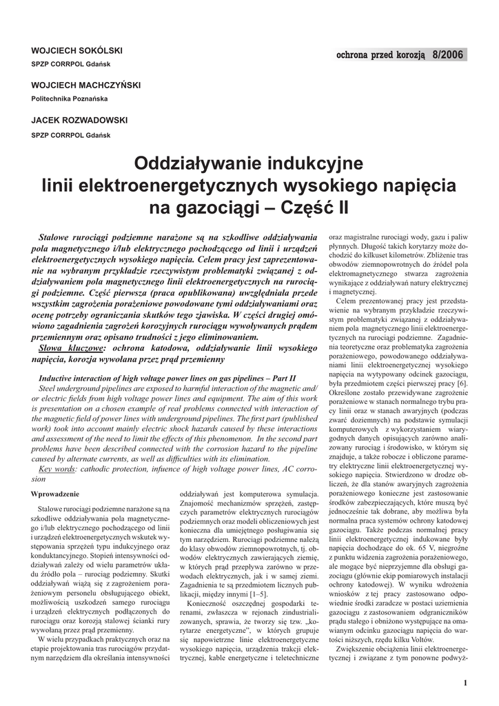 WOJCIECH SOKÓLSKI SPZP CORRPOL Gdańsk WOJCIECH MACHCZYŃSKI Politechnika Poznańska JACEK ROZWADOWSKI SPZP CORRPOL Gdańsk Oddziaływanie indukcyjne linii elektroenergetycznych wysokiego napięcia na gazociągi – Część II Stalowe rurociągi podziemne narażone są na szkodliwe oddziaływania pola magnetycznego i/lub elektrycznego pochodzącego od linii i urządzeń elektroenergetycznych wysokiego napięcia. Celem pracy jest zaprezentowanie na wybranym przykładzie rzeczywistym problematyki związanej z oddziaływaniem pola magnetycznego linii elektroenergetycznych na rurociągi podziemne. Część pierwsza (praca opublikowana) uwzględniała przede wszystkim zagrożenia porażeniowe powodowane tymi oddziaływaniami oraz ocenę potrzeby ograniczania skutków tego zjawiska. W części drugiej omówiono zagadnienia zagrożeń korozyjnych rurociągu wywoływanych prądem przemiennym oraz opisano trudności z jego eliminowaniem. Słowa kluczowe: ochrona katodowa, oddziaływanie linii wysokiego napięcia, korozja wywołana przez prąd przemienny Inductive interaction of high voltage power lines on gas pipelines – Part II Steel underground pipelines are exposed to harmful interaction of the magnetic and/ or electric fields from high voltage power lines and equipment. The aim of this work is presentation on a chosen example of real problems connected with interaction of the magnetic field of power lines with underground pipelines. The first part (published work) took into account mainly electric shock hazards caused by these interactions and assessment of the need to limit the effects of this phenomenon. In the second part problems have been described connected with the corrosion hazard to the pipeline caused by alternate currents, as well as difficulties with its elimination. Key words: cathodic protection, infuence of high voltage power lines, AC corrosion Wprowadzenie Stalowe rurociągi podziemne narażone są na szkodliwe oddziaływania pola magnetycznego i/lub elektrycznego pochodzącego od linii i urządzeń elektroenergetycznych wskutek występowania sprzężeń typu indukcyjnego oraz konduktancyjnego. Stopień intensywności oddziaływań zależy od wielu parametrów układu źródło pola – rurociąg podziemny. Skutki oddziaływań wiążą się z zagrożeniem porażeniowym personelu obsługującego obiekt, możliwością uszkodzeń samego rurociągu i urządzeń elektrycznych podłączonych do rurociągu oraz korozją stalowej ścianki rury wywołaną przez prąd przemienny. W wielu przypadkach praktycznych oraz na etapie projektowania tras rurociągów przydatnym narzędziem dla określania intensywności oddziaływań jest komputerowa symulacja. Znajomość mechanizmów sprzężeń, zastępczych parametrów elektrycznych rurociągów podziemnych oraz modeli obliczeniowych jest konieczna dla umiejętnego posługiwania się tym narzędziem. Rurociągi podziemne należą do klasy obwodów ziemnopowrotnych, tj. obwodów elektrycznych zawierających ziemię, w których prąd przepływa zarówno w przewodach elektrycznych, jak i w samej ziemi. Zagadnienia te są przedmiotem licznych publikacji, między innymi [1–5]. Konieczność oszczędnej gospodarki terenami, zwłaszcza w rejonach zindustrializowanych, sprawia, że tworzy się tzw. „korytarze energetyczne”, w których grupuje się napowietrzne linie elektroenergetyczne wysokiego napięcia, urządzenia trakcji elektrycznej, kable energetyczne i teletechniczne oraz magistralne rurociągi wody, gazu i paliw płynnych. Długość takich korytarzy może dochodzić do kilkuset kilometrów. Zbliżenie tras obwodów ziemnopowrotnych do źródeł pola elektromagnetycznego stwarza zagrożenia wynikające z oddziaływań natury elektrycznej i magnetycznej. Celem prezentowanej pracy jest przedstawienie na wybranym przykładzie rzeczywistym problematyki związanej z oddziaływaniem pola magnetycznego linii elektroenergetycznych na rurociągi podziemne. Zagadnienia teoretyczne oraz problematyka zagrożenia porażeniowego, powodowanego oddziaływaniami linii elektroenergetycznej wysokiego napięcia na wytypowany odcinek gazociągu, była przedmiotem części pierwszej pracy [6]. Określone zostało przewidywane zagrożenie porażeniowe w stanach normalnego trybu pracy linii oraz w stanach awaryjnych (podczas zwarć doziemnych) na podstawie symulacji komputerowych z wykorzystaniem wiarygodnych danych opisujących zarówno analizowany rurociąg i środowisko, w którym się znajduje, a także robocze i obliczone parametry elektryczne linii elektroenergetycznej wysokiego napięcia. Stwierdzono w drodze obliczeń, że dla stanów awaryjnych zagrożenia porażeniowego konieczne jest zastosowanie środków zabezpieczających, które muszą być jednocześnie tak dobrane, aby możliwa była normalna praca systemów ochrony katodowej gazociągu. Także podczas normalnej pracy linii elektroenergetycznej indukowane były napięcia dochodzące do ok. 65 V, niegroźne z punktu widzenia zagrożenia porażeniowego, ale mogące być nieprzyjemne dla obsługi gazociągu (głównie ekip pomiarowych instalacji ochrony katodowej). W wyniku wdrożenia wniosków z tej pracy zastosowano odpowiednie środki zaradcze w postaci uziemienia gazociągu z zastosowaniem odgraniczników prądu stałego i obniżono występujące na omawianym odcinku gazociągu napięcia do wartości niższych, rzędu kilku Voltów. Zwiększenie obciążenia linii elektroenergetycznej i związane z tym ponowne podwyż- 1 szenie wielkości indukowanych napięć na gazociągu, a także wykonane w ostatnim czasie pomiary jakości izolacji na gazociągu, stanowiły podstawę do wykonania kolejnych badań i analiz, których celem tym razem było dalsze zwiększenie bezpieczeństwa gazociągu poprzez wyeliminowanie możliwości przebiegu korozji powodowanej przez prąd przemienny. Temu zagadnieniu poświęcona jest niniejsza – II część opracowania. Kryteria ochrony przed korozją wywo