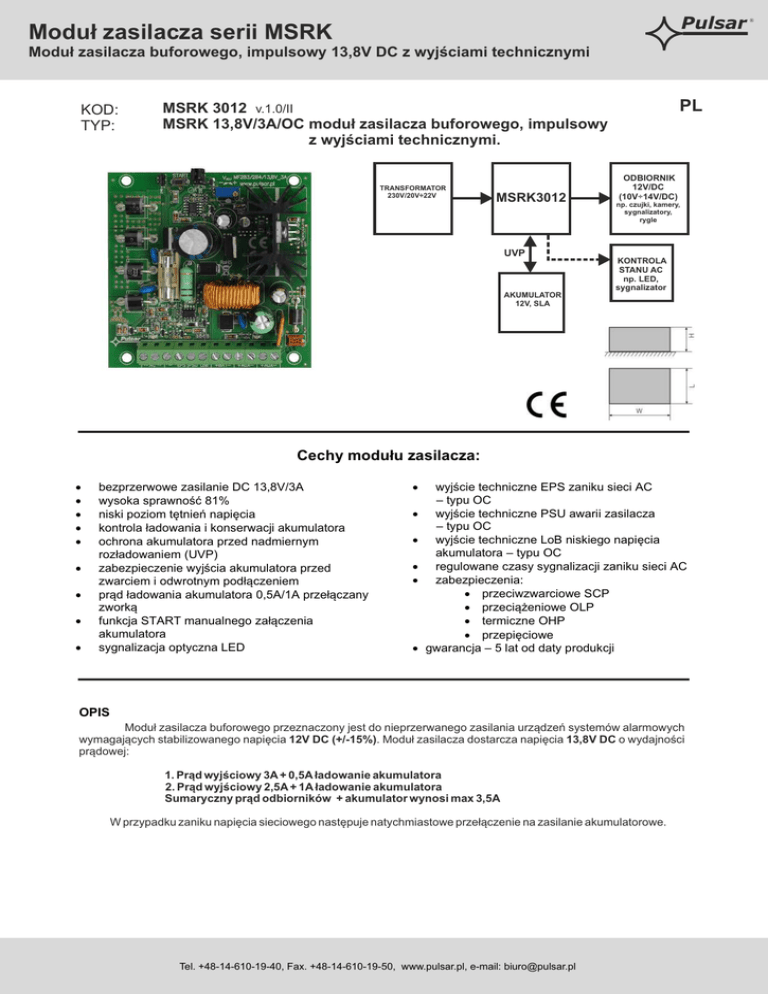 Pulsar Moduł zasilacza serii MSRK Moduł zasilacza buforowego, impulsowy 13,8V DC z wyjściami technicznymi KOD: TYP: PL MSRK 3012 v.1.0/II MSRK 13,8V/3A/OC moduł zasilacza buforowego, impulsowy z wyjściami technicznymi. TRANSFORMATOR 230V/20V÷22V MSRK3012 UVP ODBIORNIK 12V/DC (10V÷14V/DC) np. czujki, kamery, sygnalizatory, rygle KONTROLA STANU AC np. LED, sygnalizator AKUMULATOR 12V, SLA Cechy modułu zasilacza: · · · · · · · · · bezprzerwowe zasilanie DC 13,8V/3A wysoka sprawność 81% niski poziom tętnień napięcia kontrola ładowania i konserwacji akumulatora ochrona akumulatora przed nadmiernym rozładowaniem (UVP) zabezpieczenie wyjścia akumulatora przed zwarciem i odwrotnym podłączeniem prąd ładowania akumulatora 0,5A/1A przełączany zworką funkcja START manualnego załączenia akumulatora sygnalizacja optyczna LED · · · · · · wyjście techniczne EPS zaniku sieci AC – typu OC wyjście techniczne PSU awarii zasilacza – typu OC wyjście techniczne LoB niskiego napięcia akumulatora – typu OC regulowane czasy sygnalizacji zaniku sieci AC zabezpieczenia: · przeciwzwarciowe SCP · przeciążeniowe OLP · termiczne OHP · przepięciowe gwarancja – 5 lat od daty produkcji OPIS Moduł zasilacza buforowego przeznaczony jest do nieprzerwanego zasilania urządzeń systemów alarmowych wymagających stabilizowanego napięcia 12V DC (+/-15%). Moduł zasilacza dostarcza napięcia 13,8V DC o wydajności prądowej: 1. Prąd wyjściowy 3A + 0,5A ładowanie akumulatora 2. Prąd wyjściowy 2,5A + 1A ładowanie akumulatora Sumaryczny prąd odbiorników + akumulator wynosi max 3,5A W przypadku zaniku napięcia sieciowego następuje natychmiastowe przełączenie na zasilanie akumulatorowe. Tel. +48-14-610-19-40, Fax. +48-14-610-19-50, www.pulsar.pl, e-mail: [email protected] ® Moduł zasilacza serii MSRK Pulsar Moduł zasilacza buforowego, impulsowy 13,8V DC z wyjściami technicznymi DANE TECHNICZNE Zasilanie: Pobór prądu: Moc modułu zasilacza: Sprawność: Napięcie wyjściowe: Prąd wyjściowy: Zakres regulacji napięcia wyjściowego: Napięcie tętnienia: Prąd ładowania akumulatora: Zabezpieczenie przed zwarciem SCP: Zabezpieczenie przed przeciążeniem OLP: Zabezpieczenie w obwodzie akumulatora SCP i odwrotna polaryzacja podłączenia: Zabezpieczenie przepięciowe Zabezpieczenie akumulatora przed nadmiernym rozładowaniem UVP: W yjścia techniczne: - EPS; wyjście sygnalizujące awarię zasilania AC 20V÷22V AC 80VA min.(np. AWT8161820, AWT039, AWT800) 4,6A max. 49W 81% 11V ÷ 13,8V DC – praca buforowa 10V ÷ 13,8V DC – praca bateryjna 3A + 0,5A ładowanie akumulatora 2,5A + 1A ładowanie akumulatora 12÷14,5V DC 40mV p-p max. 0,5A lub 1A - przełączany zworką IBAT Elektroniczne – ograniczenie prądu i/lub uszkodzenie bezpiecznika topikowego F BAT w obwodzie akumulatora (wymaga wymiany wkładki topikowej) Automatyczny powrót 110-150% mocy modułu zasilacza, ponowne uruchomienie ręczne (awaria wymaga odłączenie obwodu wyjściowego DC) F5A- ograniczenie prądu, bezpiecznik topikowy FBAT (awaria wymaga wymiany wkładki topikowej) warystory U<10 V (± 5%) – odłączenie zacisku akumulatora, konfiguracja zworką PBAT - typu OC: 50mA max. stan normalny: poziom L (0V), awaria: poziom hi-Z, - opóźnienie 10s/60s (+/-20%) - konfiguracja zworką TAC - PSU; wyjście sygnalizujące brak napięcia DC/awarię modułu zasilacza - typu OC: 50mA max. stan normalny: poziom L (0V), awaria: poziom hi-Z, - LoB wyjście sygnalizujące niski poziom napięcia akumulatora - typu OC, 50mA max. stan normalny (U BAT >11,5V): poziom L (0V), awaria (UBAT <11,5V): poziom hi-Z Tak - diody LED o o II klasa środowiskowa, -10 C ÷ 40 C 88 x 93 x 55 (WxLxH) [mm] (+/- 2) 0,14kg / 0,24kg Kołki montażowe x 4 (PCB fi=4,2 mm) CE, RoHS, 5 lat od daty produkcji W yjścia : Ф0,41÷1,63 (AWG 26-14) W yjścia akumulatora BAT: 6,3F-2,5, 30cm Optyczna sygnalizacja pracy: Warunki pracy: W ymiary: Waga netto/brutto: Mocowanie Deklaracje, gwarancja Złącza Tel. +48-14-610-19-40, Fax. +48-14-610-19-50, www.pulsar.pl, e-mail: [email protected] ®