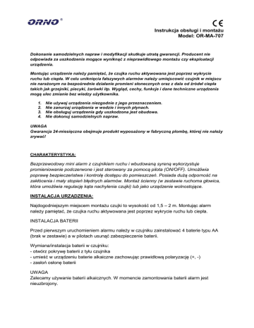 Instrukcja obsługi i montażu Model: OR-MA-707 Dokonanie samodzielnych napraw i modyfikacji skutkuje utratą gwarancji. Producent nie odpowiada za uszkodzenia mogące wyniknąć z nieprawidłowego montażu czy eksploatacji urządzenia. Montując urządzenie należy pamiętać, że czujka ruchu aktywowana jest poprzez wykrycie ruchu lub ciepła. W celu uniknięcia fałszywych alarmów należy umiejscowić czujnik w miejscu nie narażonym na bezpośrednie działanie promieni słonecznych oraz z dala od źródeł ciepła takich jak grzejniki, piecyki, żarówki itp. Wygląd, cechy, funkcje i dane techniczne urządzenia mogą ulec zmianie bez wiedzy użytkownika. 1. 2. 3. 4. Nie używaj urządzenia niezgodnie z jego przeznaczeniem. Nie zanurzaj urządzenia w wodzie i innych płynach. Nie obsługuj urządzenia gdy uszkodzona jest obudowa. Nie dokonuj samodzielnych napraw. UWAGA Gwarancja 24-miesięczna obejmuje produkt wyposażony w fabryczną plombę, której nie należy zrywać! CHARAKTERYSTYKA: Bezprzewodowy mini alarm z czujnikiem ruchu i wbudowaną syreną wykorzystuje promieniowanie podczerwone i jest sterowany za pomocą pilota (ON/OFF). Umożliwia poprawę bezpieczeństwa i kontrolę dostępu do pomieszczeń. Posiada dużą odporność na zakłócenia i mały stopień błędnych alarmów. Montaż ścienny (w zestawie ruchoma głowica, która umożliwia regulację kąta nachylenia czujki) lub jako urządzenie wolnostojące. INSTALACJA URZĄDZENIA: Najdogodniejszym miejscem montażu czujki to wysokość od 1,5 – 2 m. Montując alarm należy pamiętać, że czujka ruchu aktywowana jest poprzez wykrycie ruchu lub ciepła. INSTALACJA BATERII Przed pierwszym uruchomieniem alarmu należy w czujniku zainstalować 4 baterie typu AA (brak w zestawie) a w pilotach usunąć zabezpieczenie baterii. Wymiana/instalacja baterii w czujniku: - otwórz pokrywę baterii z tyłu czujnika - umieść w urządzeniu baterie alkaiczne zachowując prawidłową polaryzację (+, -) - zasłoń osłonę baterii UWAGA Zalecamy używanie baterii alkaicznych. W momencie zamontowania baterii alarm jest nieuzbrojony. INSTRUKCJA UŻYTKOWANIA: Uzbrojenie alarmu: Przed opuszczeniem „chronionego pomieszczenia” naciśnij na pilocie przycisk ARM/DISARM w celu uzbrojenia alarmu. Na czujniku zapali się zielona dioda i urządzenie wyda krótki dźwięk. Gdy zielona dioda zgaśnie oznaczać to będzie że alarm został zazbrojony. Rozbrojenie alarmu: Aby rozbroić alarm należy na pilocie nacisnąć przycisk ARM/DISARM. Czas uzbrojenia na wejściu: 5 sek, na wyjściu 20 sek. DANE TECHNICZNE: zasilanie czujnika: 4xAA (brak w zestawie) zasilanie pilota: 3xLR44 (w zestawie) głośność: ≤95dB kąt widzenia czujnika poziom: 1100 waga netto: 0,18 kg *Projekt i dane techniczne urządzenia mogą ulec zmianie bez wiedzy użytkownika. Wszelkie prawa do tłumaczenia/interpretowania oraz prawa autorskie do niniejszej instrukcji są zastrzeżone. Zgodnie z przepisami Ustawy z dnia 29 lipca 2005 r. o ZSEiE zabronione jest umieszczanie łącznie z innymi odpadami zużytego sprzętu oznakowanego symbolem przekreślonego kosza. Użytkownik, chcąc pozbyć się sprzętu elektronicznego i elektrycznego, jest zobowiązany do oddania go do punktu zbierania zużytego sprzętu. 09/2014 PRODUCENT ORNO-LOGISTIC Sp. z o.o. ul. Katowicka 134, 43-190 Mikołów, te. 32 43 43 110