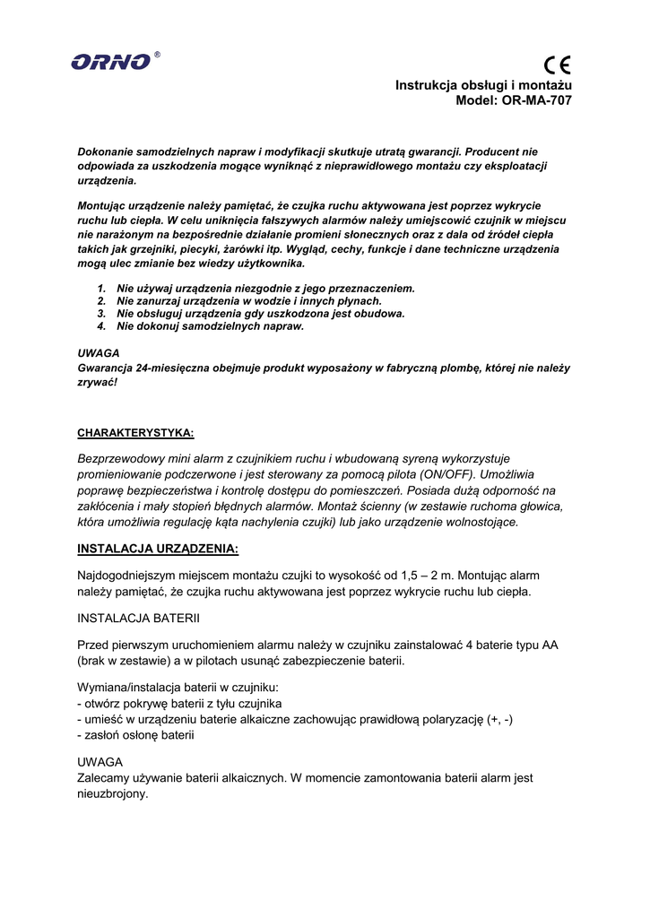 Instrukcja obsługi i montażu Model: OR-MA-707