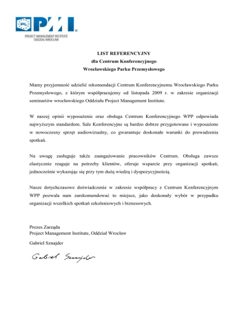 LIST REFERENCYJNY dla Centrum Konferencyjnego Wrocławskiego Parku Przemysłowego Mamy przyjemność udzielić rekomendacji Centrum Konferencyjnemu Wrocławskiego Parku Przemysłowego, z którym współpracujemy od listopada 2009 r. w zakresie organizacji seminariów wrocławskiego Oddziału Project Management Institute. W naszej opinii wyposażenie oraz obsługa Centrum Konferencyjnego WPP odpowiada najwyższym standardom. Sale Konferencyjne są bardzo dobrze przygotowane i wyposażone w nowoczesny sprzęt audiowizualny, co gwarantuje doskonałe warunki do prowadzenia spotkań. Na uwagę zasługuje także zaangażowanie pracowników Centrum. Obsługa zawsze elastycznie reaguje na potrzeby klientów, oferuje wsparcie przy organizacji spotkań, jednocześnie wykazując się przy tym dużą wiedzą i dyspozycyjnością. Nasze dotychczasowe doświadczenie w zakresie współpracy z Centrum Konferencyjnym WPP pozwala nam zarekomendować to miejsce, jako doskonały wybór w przypadku organizacji wszelkich spotkań szkoleniowych i biznesowych. Prezes Zarządu Project Management Institute, Oddział Wrocław Gabriel Sznajder
