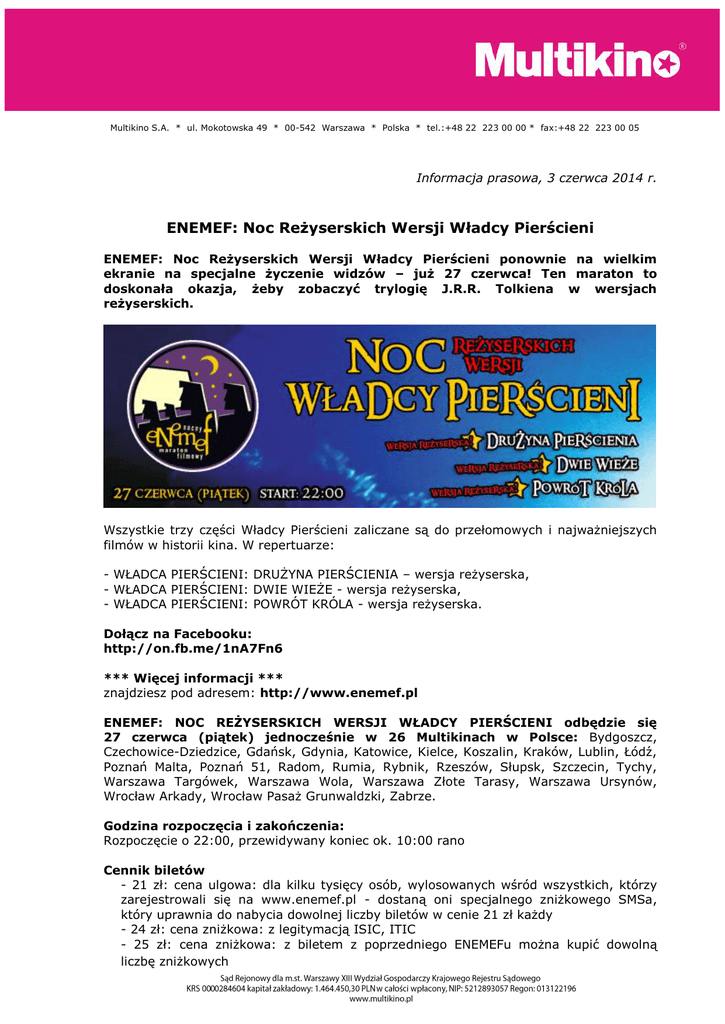 Multikino S.A. * ul. Mokotowska 49 * 00-542 Warszawa * Polska * tel.:+48 22 223 00 00 * fax:+48 22 223 00 05 Informacja prasowa, 3 czerwca 2014 r. ENEMEF: Noc Reżyserskich Wersji Władcy Pierścieni ENEMEF: Noc Reżyserskich Wersji Władcy Pierścieni ponownie na wielkim ekranie na specjalne życzenie widzów – już 27 czerwca! Ten maraton to doskonała okazja, żeby zobaczyć trylogię J.R.R. Tolkiena w wersjach reżyserskich. Wszystkie trzy części Władcy Pierścieni zaliczane są do przełomowych i najważniejszych filmów w historii kina. W repertuarze: - WŁADCA PIERŚCIENI: DRUŻYNA PIERŚCIENIA – wersja reżyserska, - WŁADCA PIERŚCIENI: DWIE WIEŻE - wersja reżyserska, - WŁADCA PIERŚCIENI: POWRÓT KRÓLA - wersja reżyserska. Dołącz na Facebooku: http://on.fb.me/1nA7Fn6 *** Więcej informacji *** znajdziesz pod adresem: http://www.enemef.pl ENEMEF: NOC REŻYSERSKICH WERSJI WŁADCY PIERŚCIENI odbędzie się 27 czerwca (piątek) jednocześnie w 26 Multikinach w Polsce: Bydgoszcz, Czechowice-Dziedzice, Gdańsk, Gdynia, Katowice, Kielce, Koszalin, Kraków, Lublin, Łódź, Poznań Malta, Poznań 51, Radom, Rumia, Rybnik, Rzeszów, Słupsk, Szczecin, Tychy, Warszawa Targówek, Warszawa Wola, Warszawa Złote Tarasy, Warszawa Ursynów, Wrocław Arkady, Wrocław Pasaż Grunwaldzki, Zabrze. Godzina rozpoczęcia i zakończenia: Rozpoczęcie o 22:00, przewidywany koniec ok. 10:00 rano Cennik biletów - 21 zł: cena ulgowa: dla kilku tysięcy osób, wylosowanych wśród wszystkich, którzy zarejestrowali się na www.enemef.pl - dostaną oni specjalnego zniżkowego SMSa, który uprawnia do nabycia dowolnej liczby biletów w cenie 21 zł każdy - 24 zł: cena zniżkowa: z legitymacją ISIC, ITIC - 25 zł: cena zniżkowa: z biletem z poprzedniego ENEMEFu można kupić dowolną liczbę zniżkowych - 26 zł: cena ulgowa: z ważną legitymacją uczniowską lub studencką - 29 zł: cena normalna Wielka Dolewka Coca Coli: do każdego biletu dodawany jest kupon uprawniający do jednorazowej dolewki napoju (Coca Cola, Fanta, Sprite). W Multikinie Złote Tarasy ceny biletów są wyższe o 3 zł (nie dotyczy biletów ze zniżką smsową). Rezerwacja i przedsprzedaż biletów: Bilety w przedsprzedaży można kupić w kinie oraz przez Internet, przedsprzedaż rozpocznie się w piątek 6 czerwca po 16:00. Brak możliwości rezerwacji biletów. Więcej informacji na temat przedsprzedaży oraz rezerwacji biletów pod adresem www.enemef.pl. Informacje o filmach: Władca Pierścieni: Drużyna Pierścienia - WERSJA REŻYSERSKA Lord of the Rings: The Fellowship of the Ring, Nowa Zelandia, USA 2001, 208' reżyseria: Peter Jackson scenariusz: Fran Walsh, Philippa Boyens, Peter Jackson obsada: Elijah Wood, Ian Holm, Viggo Mortensen, Sean Bean, Liv Tyler, Cate Blanchett muzyka: Howard Shore Wersja reżyserska - dłuższa od zwykłej o 30 minut - zawiera dodatkowe sceny, m.in.: inne rozpoczęcie, dłuższe ujęcie śmierci Isildura oraz opowieść Gandalfa o Gollumie. Jeden z najbardziej wyczekiwanych filmów w historii kina i upragniony przez fanów Tolkiena, dziś już należy do klasyki kina. Nieśmiały, młody hobbit o imieniu Frodo dziedziczy Jedyny Pierścień – narzędzie władzy absolutnej, stworzony przez mrocznego władcę krainy Mordoru – Saurona. Frodo wraz z towarzyszami musi zabrać pierścień do jedynego miejsca, gdzie może zostać zniszczony. Podczas wyprawy drużyna musi walczyć nie tylko ze złem czającym się wokół, ale również waśniami wewnątrz drużyny oraz niszczącym wpływem samego pierścienia... Każdy detal Śródziemia jest dopracowany w najdrobniejszym szczególe, nawet najmniejsze elementy przykuwają uwagę swoją tajemniczością i wykonaniem. Drużyna Pierścienia to niezwykle emocjonujące doświadczenie, które zrobi wrażenie nie tylko na fanach trylogii. Władca Pierścieni: Dwie Wieże - WERSJA REŻYSERSKA Lord of the Rings: The Two Towers, Nowa Zelandia, USA 2002, 223' reżyseria: Peter Jackson scenariusz: Fran Walsh, Philippa Boyens, Peter Jackson obsada: Elijah Wood, Ian Holm, Viggo Mortensen, Sean Bean, Liv Tyler, Cate Blanchett muzyka: Howard Shore Wersja reżyserska - dłuższa od zwykłej o 44 minuty - zawiera dodatkowe sceny, m.in.: retrospekcję dotycząca Faramira, historię odbicia Osgiliath przez Boromira i Faramira. Niepisana reguła filmowych trylogii, mówi, że druga część musi stawiać przed bohaterami najtrudniejsze wyzwania, żeby po ich przezwyciężeniu mogli śmiało zmierzyć się z przeciwnikami. Dwie Wieże spełniają ten schemat w sposób widowiskowy i niezwykle ekscytujący. Po zdradzie Boromira drużyna zostaje rozbita, Frodo i Sam zmierzają ku Mordorowi, a ich śladem podąża Gollum. Reszta drużyny odwiedza krainy Rohanu i Gondoru. Wszystkie znaki na niebie i ziemi wskazują nieuchronność wielkiej wojny z siłami zła... Dwie Wieże to piękny, zapierający dech w piersiach film, pełen mistrzowskich efektów specjalnych. To wielkie widowisko, kryjące w sobie wiele niespodzianek i zaskakujących zwrotów akcji. Władca Pierścieni: Powrót Króla - WERSJA REŻYSERSKA Lord of the Rings: The Return of the King, Nowa Zelandia, USA 2003, 251' reżyseria: Peter Jackson scenariusz: Fran Walsh, Philippa Boyens, Peter Jackson obsada: Elijah Wood, Ian Holm, Viggo Mortensen, Sean Bean, Liv Tyler, Cate Blanchett muzyka: Howard Shore Wersja reżyserska - dłuższa od zwykłej o 50 minut - zawiera dodatkowe sceny, m.in: tragiczny koniec Sarumana w ruinach Isengardu, spotkanie z Głosem Saurona, wątek opisujący miłość Faramira i Eowiny. Doskonałe efekty specjalne, świetna fabuła, spektakularne sceny batalistyczne. Powrót króla to idealne zamknięcie trylogii. Nadchodzi czas konfrontacji sił Władcy Ciemności Saurona ze zjednoczonymi siłami Ludów Śródziemia. Czy Rohan i Gondor będą w stanie przeciwstawić się niezliczonym zastępom Nieprzyjaciela? Czy Frodo uda się wykonać powierzoną mu misję - zniszczyć