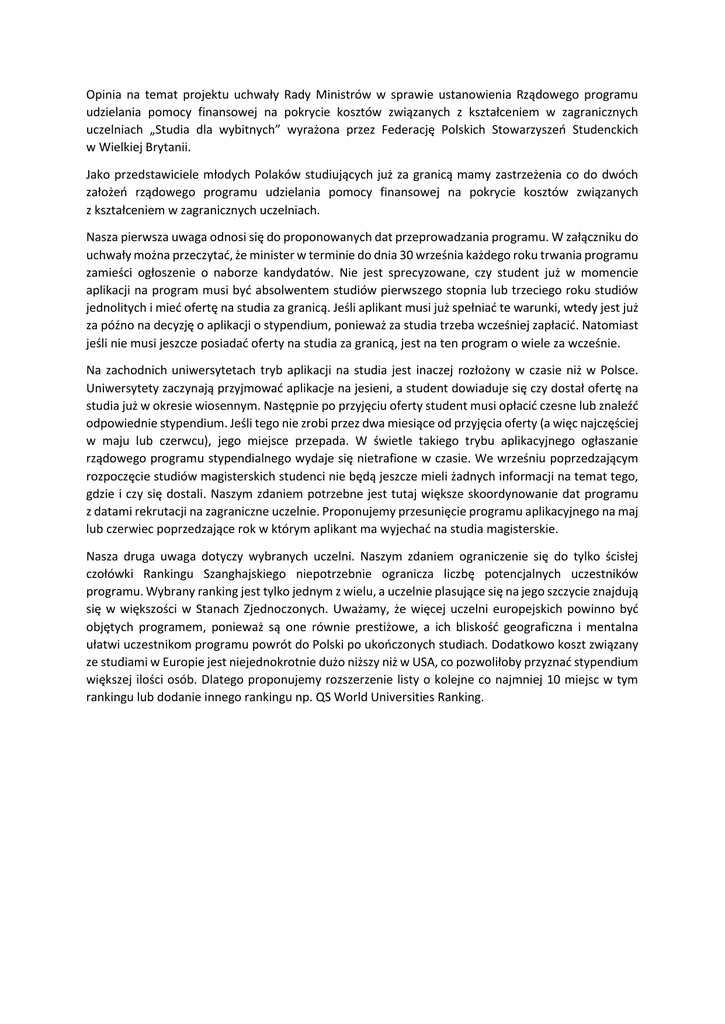Opinia na temat projektu uchwały Rady Ministrów w sprawie ustanowienia Rządowego programu udzielania pomocy finansowej na pokrycie kosztów związanych z kształceniem w zagranicznych uczelniach „Studia dla wybitnych” wyrażona przez Federację Polskich Stowarzyszeń Studenckich w Wielkiej Brytanii. Jako przedstawiciele młodych Polaków studiujących już za granicą mamy zastrzeżenia co do dwóch założeń rządowego programu udzielania pomocy finansowej na pokrycie kosztów związanych z kształceniem w zagranicznych uczelniach. Nasza pierwsza uwaga odnosi się do proponowanych dat przeprowadzania programu. W załączniku do uchwały można przeczytać, że minister w terminie do dnia 30 września każdego roku trwania programu zamieści ogłoszenie o naborze kandydatów. Nie jest sprecyzowane, czy student już w momencie aplikacji na program musi być absolwentem studiów pierwszego stopnia lub trzeciego roku studiów jednolitych i mieć ofertę na studia za granicą. Jeśli aplikant musi już spełniać te warunki, wtedy jest już za późno na decyzję o aplikacji o stypendium, ponieważ za studia trzeba wcześniej zapłacić. Natomiast jeśli nie musi jeszcze posiadać oferty na studia za granicą, jest na ten program o wiele za wcześnie. Na zachodnich uniwersytetach tryb aplikacji na studia jest inaczej rozłożony w czasie niż w Polsce. Uniwersytety zaczynają przyjmować aplikacje na jesieni, a student dowiaduje się czy dostał ofertę na studia już w okresie wiosennym. Następnie po przyjęciu oferty student musi opłacić czesne lub znaleźć odpowiednie stypendium. Jeśli tego nie zrobi przez dwa miesiące od przyjęcia oferty (a więc najczęściej w maju lub czerwcu), jego miejsce przepada. W świetle takiego trybu aplikacyjnego ogłaszanie rządowego programu stypendialnego wydaje się nietrafione w czasie. We wrześniu poprzedzającym rozpoczęcie studiów magisterskich studenci nie będą jeszcze mieli żadnych informacji na temat tego, gdzie i czy się dostali. Naszym zdaniem potrzebne jest tutaj większe skoordynowanie dat programu z datami rekrutacji na zagraniczne uczelnie. Proponujemy przesunięcie programu aplikacyjnego na maj lub czerwiec poprzedzające rok w którym aplikant ma wyjechać na studia magisterskie. Nasza druga uwaga dotyczy wybranych uczelni. Naszym zdaniem ograniczenie się do tylko ścisłej czołówki Rankingu Szanghajskiego niepotrzebnie ogranicza liczbę potencjalnych uczestników programu. Wybrany ranking jest tylko jednym z wielu, a uczelnie plasujące się na jego szczycie znajdują się w większości w Stanach Zjednoczonych. Uważamy, że więcej uczelni europejskich powinno być objętych programem, ponieważ są one równie prestiżowe, a ich bliskość geograficzna i mentalna ułatwi uczestnikom programu powrót do Polski po ukończonych studiach. Dodatkowo koszt związany ze studiami w Europie jest niejednokrotnie dużo niższy niż w USA, co pozwoliłoby przyznać stypendium większej ilości osób. Dlatego proponujemy rozszerzenie listy o kolejne co najmniej 10 miejsc w tym rankingu lub dodanie innego rankingu np. QS World Universities Ranking.