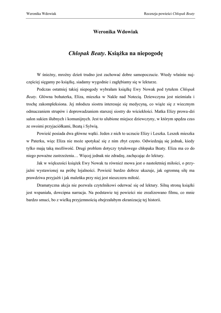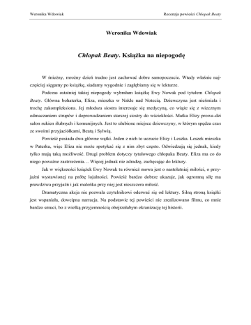 Recenzja powieści Chłopak Beaty Weronika Wdowiak Weronika Wdowiak Chłopak Beaty. Książka na niepogodę W śnieżny, mroźny dzień trudno jest zachować dobre samopoczucie. Wtedy właśnie najczęściej sięgamy po książkę, siadamy wygodnie i zagłębiamy się w lekturze. Podczas ostatniej takiej niepogody wybrałam książkę Ewy Nowak pod tytułem Chłopak Beaty. Główna bohaterka, Eliza, mieszka w Nakle nad Notecią. Dziewczyna jest nieśmiała i trochę zakompleksiona. Jej młodsza siostra interesuje się medycyną, co wiąże się z wiecznym odmaczaniem strupów i doprowadzaniem starszej siostry do wściekłości. Matka Elizy prowa-dzi salon sukien ślubnych i komunijnych. Jest to ulubione miejsce dziewczyny, w którym spędza czas ze swoimi przyjaciółkami, Beatą i Sylwią. Powieść posiada dwa główne wątki. Jeden z nich to uczucie Elizy i Leszka. Leszek mieszka w Paterku, więc Eliza nie może spotykać się z nim zbyt często. Odwiedzają się jednak, kiedy tylko mają taką możliwość. Drugi problem dotyczy tytułowego chłopaka Beaty. Eliza ma co do niego poważne zastrzeżenia… Więcej jednak nie zdradzę, zachęcając do lektury. Jak w większości książek Ewy Nowak tu również mowa jest o nastoletniej miłości, o przyjaźni wystawionej na próbę lojalności. Powieść bardzo dobrze ukazuje, jak ogromną siłę ma prawdziwa przyjaźń i jak maleńka przy niej jest nieszczera miłość. Dramatyczna akcja nie pozwala czytelnikowi oderwać się od lektury. Silną stroną książki jest wspaniała, dowcipna narracja. Na podstawie tej powieści nie zrealizowano filmu, co mnie bardzo smuci, bo z wielką przyjemnością obejrzałabym ekranizację tej historii.