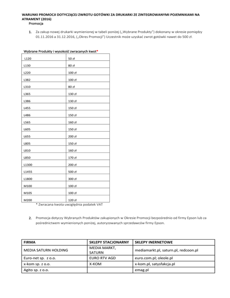 WARUNKI PROMOCJI DOTYCZĄCEJ ZWROTU GOTÓWKI ZA DRUKARKI ZE ZINTEGROWANYMI POJEMNIKAMI NA ATRAMENT (2016) Promocja 1. Za zakup nowej drukarki wymienionej w tabeli poniżej („Wybrane Produkty”) dokonany w okresie pomiędzy 01.11.2016 a 31.12.2016, („Okres Promocji”) Uczestnik może uzyskać zwrot gotówki nawet do 500 zł. Wybrane Produkty i wysokość zwracanych kwot* L120 50 zł L130 80 zł L220 100 zł L382 100 zł L310 80 zł L365 130 zł L386 130 zł L455 150 zł L486 150 zł L565 160 zł L605 150 zł L655 200 zł L805 150 zł L810 160 zł L850 170 zł L1300 200 zł L1455 500 zł L1800 300 zł M100 100 zł M105 100 zł M200 120 zł * Zwracana kwota uwzględnia podatek VAT 2. Promocja dotyczy Wybranych Produktów zakupionych w Okresie Promocji bezpośrednio od firmy Epson lub za pośrednictwem wymienionych poniżej, autoryzowanych sprzedawców firmy Epson. FIRMA SKLEPY INERNETOWE Euro-net sp. z o.o. SKLEPY STACJONARNY MEDIA MARKT, SATURN EURO RTV AGD x-kom sp. z o.o. X-KOM x-kom.pl, satysfakcja.pl MEDIA SATURN HOLDING Agito sp. z o.o. mediamarkt.pl, saturn.pl, redcoon.pl euro.com.pl; oleole.pl emag.pl WARUNKI PROMOCJI DOTYCZĄCEJ ZWROTU GOTÓWKI ZA DRUKARKI ZE ZINTEGROWANYMI POJEMNIKAMI NA ATRAMENT (2016) TERG sp z o.o. Media Expert mediaexpert.pl, electro.pl, avans.pl Komputronik S.A. Komputronik komputronik.pl Corso sp.j. Corso corso.com.pl Cyfrowe.pl cyfrowe.pl Iterra sp z o.o. Vobis vobis.pl Yamo sp z o.o. Reactor ataniej.pl AV max AVMax avmax.pl Internet Mall Polska Sp. z o.o. Mall mall.pl JB Multimedia JB Multimedia najlepsze.pl; jbmultimedia.pl Astral sp z o.o. Media Expert 2bis.pl Krakprint.pl KrakPrint krakprint.pl Centrum Papieru Centrum Papieru centrumpapieru.pl Centrum Druku Centrum Druku www.centrumdruku.com.pl Alsen Marketing Sp z o.o. Alsen alsen.pl, zadowolenie.pl Morele.net morele.net Sferis Sp. z o.o. Sferis sferis.pl Starcom Sp.J. Apollo Sp. z o.o. Foto-Plus Consulting – IT Fotoaparaciki Sp.j Medyńscy NKK System Agata Grześkowiak Ptacy Empik e-commerce Sp. z o.o. Starcom Apollo Foto-Plus starcom-ntt.com.pl apollo.pl fotoplus.pl b365.pl fotoaparaciki.pl nkksystem.pl ptacy.pl empik.com 3. W Promocji mogą wziąć udział tylko osoby, które ukończyły osiemnasty rok życia i są mieszkańcami Polski. Na jednego klienta może przypadać maksymalnie jedno zgłoszenia. Na jeden Wybrany Produkt może przypadać tylko jedno zgłoszenie. 4. W Promocji mogą brać udział tylko klienci końcowi. Zgłoszenia dotyczące Wybranych Produktów, które zostały zakupione z zamiarem odsprzedaży osobom trzecim, nie mogą brać udziału w Promocji. Sprzedawcy nie mogą przedstawiać zgłoszeń w imieniu klientów. 5. W Promocji nie mogą uczestniczyć pracownicy firmy Epson, agenci, dystrybutorzy, sprzedawcy, pracownicy sprzedawców detalicznych uczestniczących w Promocji ani żadne inne osoby powiązane z Promocją. 6. Promocja nie dotyczy urządzeń z drugiej ręki, poddanych renowacji lub regenerowanych. 7. Zgłoszenie o zwrot gotówki należy przedstawić w terminie 30 dni kalendarzowych od daty zakupu. Ostateczny termin składania zgłoszeń upływa z dniem 31.01.2017 Jak uzyskać zwrot 8. Aby uzyskać zwrot, należy odwiedzić stronę www.epson.pl/zwrot, wypełnić dostępny tam formularz zgłoszeniowy i przesłać go razem z kopią dowodu zakupu oraz zdjęciem numeru seryjnego, umieszczonego na drukarce– nie będą akceptowane zdjęcia numerów seryjnych umieszczonych na pudełku. Uczestnik zostanie poproszony o podanie danych osobowych, w tym numeru konta. WARUNKI PROMOCJI DOTYCZĄCEJ ZWROTU GOTÓWKI ZA DRUKARKI ZE ZINTEGROWANYMI POJEMNIKAMI NA ATRAMENT (2016) 9. Dowód zakupu powinien być czytelną kopią paragonu lub faktury zawierającą wyraźnie widoczną nazwę sprzedawcy, datę zakupu, nazwę zakupionego produktu oraz jego cenę. 10. Po otrzymaniu zgłoszenia zostanie wysłana wiadomość e-mail ze stosownym potwierdzeniem. 11. Zwrot gotówki zostanie dokonany w formie przelewu bankowego w terminie 30 dni od daty zweryfikowania zgłoszenia. Organizator wykona przelew bankowy tylko na konto bankowe założone w kraju, w którym dokonano zakupu produktu firmy Epson. Organizator nie ponosi odpowiedzialności za opłaty bankowe dotyczące zwrotu gotówki realizowanego za pośrednictwem przelewu bankowego. W związku z powyższym, jeśli bank Uczestnika obciąży Użytkownika takimi opłatami, zostaną one odliczone przez bank od kwoty zwrotu. 12. Osoba rejestrująca zgłoszenie ponosi odpowiedzialność za zarejestrowanie prawidłowych danych konta bankowego. Jeśli zostaną podane nieprawidłowe dane i Organizator dokona płatności, która zostanie odrzucona albo nie zostanie otrzymana przez Uczestnika, Organizator nie będzie ponosił odpowiedzialności za ponowne dokonanie takiej płatności. Ograniczenia 13. W przypadku, gdy zwrócona gotówka stanowi dochód podlegający opodatkowaniu, obowiązek uiszczenia stosownego podatku spoczywa na odbiorcy. 14. Jeśli Wybrany Produkt, który jest przedmiotem zgłoszenia, zostanie z jakiegokolwiek powodu zwrócony sprzedawcy, uprawnienie klienta do ubiegania się o zwrot gotówki przestanie obowiązywać, a gotówkę już wypłaconą należy zwrócić Organizatorowi. 15. Organizator zastrzega sobie prawo do żądania dodatkowych dowodów, które pomogą zweryfikować zgłoszenie, jeżeli uzna, że może ono nie być uzasadnione. 16. Zgłoszenie nie zostanie przyjęte, jeśli: a. Wybrany Produkt nie został zakupiony w Okresie Promocji; b. Zgłoszenie dotyczy produktu niebiorącego udziału w promocji c. Zgłoszenie nie zostało wypełnione w sposób kompletny; d. Dowód zakupu nie został dostarczony lub był nieczytelny; e. Uczestnik nie przesłał zdjęcia numeru seryjnego umieszczonego na drukarce; f. Zgłoszenie nie zostało przesłane w wymaganym terminie 30 dni kalendarzowych od daty zakupu; g. Uczestnik nie zaakceptował regulaminu. h. Wybrany produkt nie został zakupiony u sprzedawcy wymienionego w pu