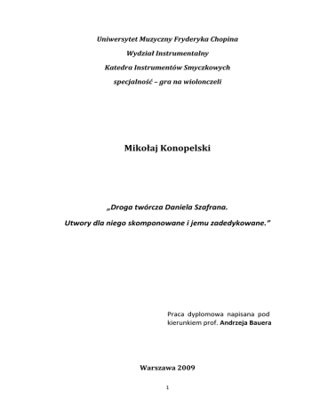 Uniwersytet Muzyczny Fryderyka Chopina Wydział Instrumentalny Katedra Instrumentów Smyczkowych specjalność – gra na wiolonczeli Mikołaj Konopelski „Droga twórcza Daniela Szafrana. Utwory dla niego skomponowane i jemu zadedykowane.” Praca dyplomowa napisana pod kierunkiem prof. Andrzeja Bauera Warszawa 2009 1 Spis treści Wstęp 3 Rozdział I. Droga twórcza Daniela Szafrana 4 1. Dania - Cudowne dziecko 4 2. Początki wielkiej kariery 9 3. Szafran, jako pedagog i juror 10 4. Szafran - profesjonalista w odniesieniu do innych i siebie samego 13 Rozdział II. Styl i zasady wykonawcze 16 1. ”Osobiste” brzmienie wiolonczeli 16 2. Bach w wykonaniu Szafrana 19 3. Aplikatura i wibracja 22 4. Praca nad utworem 26 5. Pianiści Daniela Szafrana 34 Rozdział III. Utwory napisane i dedykowane Szafranowi 36 1. Tsinkadze – Pięć melodii ludowych na wiolonczelę i fortepian 36 2. Kabalewski – Drugi Koncert wiolonczelowy 39 3. Arapow – Sonata na wiolonczelę i fortepian 42 Zakończenie 44 Przedsłowie do dyskografii Daniela Szafrana 45 Dyskografia 46 Wykaz cytowanej literatury 67 2 DANIEL SZAFRAN był jednym z najwspanialszych muzyków XX wieku. W gronie najwybitniejszych wiolonczelistów zajmuje miejsce szczególne. Z jego postacią, a właściwie z jego kunsztem wykonawczym, zetknąłem się – poprzez nagrania płytowe – już na początku swojej edukacji muzycznej. Do dziś jestem zafascynowany tym wspaniałym rosyjskim wiolonczelistą, a jego interpretacje stanowią dla mnie niedościgły wzór. Od jego śmierci minęło ponad 12 lat i mało kto już pamięta tego niezwykłego artystę. „Nie był typem idola, pogromcy koncertowych sal, może dlatego jego nazwisko nie obrosło legendą, na jaką niewątpliwie zasłużył. Tylko najlepiej zorientowani wiedzieli, że Szafran – to poeta wiolonczeli, wspaniały muzyk, w czasie gry, niemal zrośnięty z instrumentem, pozostający z nim w absolutnej symbiozie.” 1 Jeden z najwybitniejszych współczesnych wiolonczelistów – Steven Isserlis – w słowach zachwytu nad sztuką artysty doskonale scharakteryzował osobowość Szafrana : „Jako wiolonczelista i muzyk był niepodobny do nikogo. Jego wibrato, frazowanie, jego poczucie rytmu były niespotykane. Wirtuozerią wprawiał w osłupienie, emanował siłą muzycznej osobowości, a jednocześnie zjednywał prostotą i poezją, bo było w nim coś z prostej, rosyjskiej natury ludowego śpiewaka. Nie potrafił zagrać jednej fałszywej nuty; jego muzyka przemawiała duszą.” 2 Niniejszą pracą, chociaż w nieznacznym stopniu, pragnę złożyć hołd temu wielkiemu artyście. Znalezienie odpowiednich i zarazem obiektywnych materiałów biograficznych sprawiło mi pewną trudność. Głównym źródłem wiedzy o Danielu Szafranie stała się dla mnie książka pod redakcją G.M.Cypina – „Wiolonczela solo.” 1 Małgorzata Pęcioska www.polskieradio.eu/dwojka/muzykaklasyczna/artykul_38112.html 2 Tamże 3 Rozdział I. Droga twórcza Daniela Szafrana Szafran żył w kraju, w którym władza radziecka miała wpływ na wszystko – kontrolując każdą dziedzinę życia. Wypowiedzi, wywiady i publikacje prasowe poddawane były szczegółowej cenzurze. Daniel Borysowicz był człowiekiem skrytym i niechętnie udzielał wywiadów. Każde wypowiedziane publicznie słowo musiało być wyważone i przemyślane. „Stemplem” bezpieczeństwa i ostrożności były dziękczynienia skierowane do „najukochańszej” partii i rządu. Daniel Szafran urodził się 13 stycznia 1923 roku w Leningradzie, w rodzinie muzyków. Jego ojciec przez trzydzieści lat prowadził grupę wiolonczelistów Akademickiej Orkiestry Symfonicznej Leningradzkiej Filharmonii. Mama była pianistką. Tak więc dźwięki muzyki towarzyszyły mu od samego dzieciństwa. Muzyczną edukację Dania rozpoczął pod kierunkiem ojca, który miał wiele wątpliwości i obaw co do słuszności wyboru drogi życiowej syna. Ojciec obawiał się rozczarowania, które mogło być udziałem utalentowanego dziecka, jeśli po latach ciężkiej pracy okazałoby się, że talentu jest zbyt mało. W końcu Borys Siemionowicz uległ gorącym prośbom syna i rozpoczął z nim naukę gry na wiolonczeli. Dania miał wówczas 8 lat. Od ojca otrzymał swój pierwszy instrument. W stosunku do innych swoich studentów Borys Szafran nie faworyzował syna. Wymagał od niego o wiele więcej, przyzwyczajając go do większego wysiłku i ucząc go większej odpowiedzialności. W jednym z wywiadów Daniel Szafran z wdzięcznością wspominał jak to ojciec zawsze powtarzał : „Nasz zawód to przede wszystkim praca, praca i jeszcze raz praca ! ” … „ Ojcu zawdzięczam wiele, a głównie mój stosunek do instrumentu jako kontynuacji samego siebie.” 3 3 Według G.M. Cypin, Daniel Szafran – Wiolonczela solo, AST, Moskwa 2001, s. 11,12 4 Poprzez lekcje ze swoim ojcem Daniel Szafran rozwijał się bardzo szybko. Borys Siemionowicz opowiadał kiedyś jak przebiegały te lekcje: „Pracować z nim było bardzo lekko, on szybko przyswajał, a najważniejsze było to, że ćwiczył na instrumencie z wielką przyjemnością. Zadziwiająco szybko opanował czystość intonacji, technikę lewej ręki i nieskazitelną technikę smyczkowania – zupełnie tak jakby urodził się z wiolonczelą w rękach. Po półtora roku nauki on już grał koncert Saint – Saënsa, sonatę Ecclesa i „Taniec elfów” Poppera.” 4 Z takimi pozytywnymi rezultatami półtorarocznej pracy ojciec przyprowadził go do Aleksandra Jakowliewicza Sztrimmera, wpływ którego okazał profesjonalnego się i decydujący muzycznego w oblicza formowaniu Daniela duchowego, Szafrana. Danię niepokoiło jedynie to, czy Sztrimmer, który uczył w konserwatorium weźmie go do swojej klasy – nie miał przecież jeszcze 11 lat. Nastąpił jednak szczęśliwy zbieg okoliczności, bo właśnie w tym samym roku przy Leningradzkim Konserwatorium została otwarta szkoła dla uzdolniony