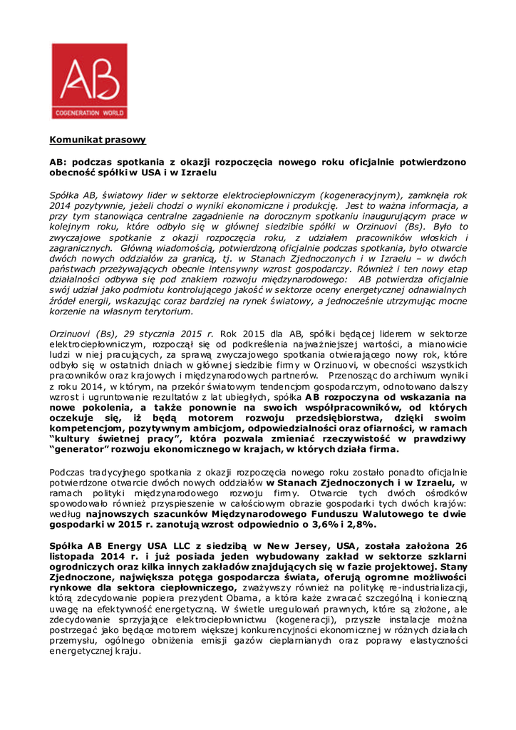 Komunikat prasowy AB: podczas spotkania z okazji rozpoczęcia nowego roku oficjalnie potwierdzono obecność spółki w USA i w Izraelu Spółka AB, światowy lider w sektorze elektrociepłowniczym (kogeneracyjnym), zamknęła rok 2014 pozytywnie, jeżeli chodzi o wyniki ekonomiczne i produkcję. Jest to ważna informacja, a przy tym stanowiąca centralne zagadnienie na dorocznym spotkaniu inaugurującym prace w kolejnym roku, które odbyło się w głównej siedzibie spółki w Orzinuovi (Bs). Było to zwyczajowe spotkanie z okazji rozpoczęcia roku, z udziałem pracowników włoskich i zagranicznych. Główną wiadomością, potwierdzoną oficjalnie podczas spotkania, było otwarcie dwóch nowych oddziałów za granicą, tj. w Stanach Zjednoczonych i w Izraelu – w dwóch państwach przeżywających obecnie intensywny wzrost gospodarczy. Również i ten nowy etap działalności odbywa się pod znakiem rozwoju międzynarodowego: AB potwierdza oficjalnie swój udział jako podmiotu kontrolującego jakość w sektorze oceny energetycznej odnawialnych źródeł energii, wskazując coraz bardziej na rynek światowy, a jednocześnie utrzymując mocne korzenie na własnym terytorium. Orzinuovi (Bs), 29 stycznia 2015 r. Rok 2015 dla AB, spółk i będące j lide rem w sek torze e lek trociepłowniczym, rozpoczął się od podk reśle nia najważnie jsze j wartości, a mianowicie ludzi w nie j pracujących, za sprawą zwyczajowego spotkania otwie rającego nowy rok, k tóre odbyło się w ostatnich dniach w główne j siedzibie firm y w O rzinuovi, w obe cności wszystk ich pracowników oraz k rajowych i międzynarodowych partne rów. Prze nosząc do archiwum wynik i z rok u 2014, w k tórym, na przekór światowym tende ncjom gospodarczym, odnotowano dalszy wzrost i ugruntowanie re zultatów z lat ubiegłych, spółka A B rozpoczyna od wskazania na nowe pokolenia, a także ponownie na swo ich współpracownikó w, od których oczekuje się, iż będą motorem rozwoju przedsiębiorstwa, dzięki s woim kompetencjom, pozytywnym ambicjom, odpowiedzialności oraz ofiarności, w ramach “kultury świetnej pracy”, która pozwala zmieniać rzeczywistość w prawdziwy “generator” rozwoju ekonomicznego w krajach, w których działa firma. Podczas tradycyjne go spotkania z okazji rozpoczę cia nowego roku zostało ponadto oficjalnie potwie rdzone otwarcie dwóch nowych oddziałów w Stanach Zjednoczonych i w Izraelu, w ramach polityk i międzynarodowego rozwoju firm y. O twarcie tych dwóch ośrodków spowodowało również przyspie szenie w całościowym obrazie gospodark i tych dwóch k rajów: we dług najnowszych szacunków Międzynarodowego Funduszu Walutowego te d wie gospodarki w 2015 r. zanotują wzrost odpowiednio o 3,6% i 2,8%. Spółka A B Energy USA LLC z s iedzibą w Ne w Jersey, USA , została założona 26 listopada 2014 r. i już pos iada jeden wybudowany zakład w sektorze szklarni ogrodniczych oraz kilka innych zakładów znajdujących się w fazie projektowej. Stany Zjednoczone, największa potęga gospodarcza świata, oferują ogromne możliwości rynkowe dla sektora ciepłowniczego, zważywszy również na politykę re -industrializacji, k tórą zde cydowanie popie ra prezydent Obama, a k tóra każe zwracać szczególną i konie czną uwagę na efek tywność ene rge tyczną. W świe tle uregulowań prawnych, k tóre są złożone , ale zde cydowanie sprzyjające e lek trociepłownictwu (kogene racji), przyszłe instalacje można postrzegać jako bę dące motorem większe j konkure ncyjności ekonom iczne j w różnych działach przemysłu, ogólne go obniżenia emisji gazów cie plarnianych oraz poprawy e lastyczności e ne rgetycznej k raju. Spółka A B Energy Israel została utworzona 8 grudnia 2014 r. Udziały w niej objęły spółki AB Holding (60%) i ITEEO (40%), tj. spółka nowych technologii w inżynierii, zaangażowana w dziedzinę rozwoju instalacji termodynamicznych i CHP w najróżniejszych branżach przemysłowych. Odk rycie k ilka lat temu u wybrzeży Izrae la dwóch ważnych złóż gazu ziemnego pozwala Izrae lowi na większą nie zależność ene rge tyczną. Infrastruk tura niezbędna do tego, aby pozwolić sobie na wykorzystywanie tych zasobów ak tualnie jest w trak cie realizacji, a to może umożliwić także rozwój w sek torze e le k trociepłownictwa (kogeneracji). „Jak zwykle, nowy rok rozpoczynamy od spotkania, z nowym entuzjazmem i ze świadomością naszych atutów, podkreślając raz jeszcze wartość ludzi w tworzeniu naszej rzeczywistości oraz, przede wszystkim, wartość nowych pokoleń we Włoszech i na świecie, które mogą stać się prawdziwym motorem rozwoju – powiedział A ngelo Baronchelli, założyciel i prezes AB. Rok 2015 rozpoczyna się od nowych i dużych zmian organizacyjnych, dzięki którym, z uwagi na naszą rozległą obecność, będziemy odgrywali coraz większą rolę na światowym rynku, a nowo otwarte oddziały w Stanach Zjednoczonych i w Izraelu jeszcze bardziej ugruntują politykę powiększania międzynarodowego zasięgu naszej działalności, zgodnie z planem wytyczonym w ostatnich latach. Nasza wielka rodzina, która liczy już sobie 550 jednostek na całym świecie, wzbogaciła się o dwa nowe oddziały, dwa nowe zespoły ludzi, którzy mogą poszczycić się udokumentowanym doświadczeniem w sektorze, dzięki czemu będziemy mogli nadal oferować na światowym rynku, będącym naszym punktem odniesienia, jedyne w swoim rodzaju, świetne produkty i usługi.” AB Grupa AB, założona w 1981 r. przez Angelo Baronchelli, działa w sektorz e kogeneracji, rozdzielania energii elektrycznej oraz oc eny energetycznej odnawialnych źród eł energii. Spółka, licząca obecnie 550 pracowników, aktualnie obecna jest na 21 rynkach na trzech kontynentach i stanowi światowy punkt odniesienia dla przemysłu elektrociepłowniczego. AB projektuje, buduje, instaluje i świadczy wsparcie w zakresie rozwiązań modularn