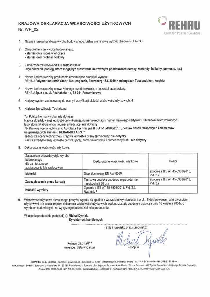 (JREHRU KRAJOWA DEKLARACJA Wt.ASCIWOSCI UZYTKOWYCH Nr. WP 02 Unlimited Polymer Solutions 1. Nazwa i nazwa handlowa wyrobu budowlanego: Listwy aluminiowe wykonczeniowe RELAZZO 2. Oznaczenie typu wyrobu budowlanego: - aluminiowa listwa wienczetca - aluminiowy profil schodowy 3. Zamierzone zastosowanie lub zastosowania: - wykonczenie podlog, ktöre moget bye stosowane na zewnettrz pomieszczen (tarasy, werandy, balkony, pomosty, itp.) 4. Nazwa i adres siedziby producenta oraz miejsce produkcji wyrobu: REHAU Polymer Industrie GmbH Neulengbach, Edersberg 163, 3040 Neulengbach Tausendblum, Austria 5. Nazwa i adres siedziby upowaznioneqo przedstawiciela, 0 ile zostal ustanowiony: REHAU Sp. z 0.0. ul. Poznanska 1a, 62-081 Przezmierowo 6. Krajowy system zastosowany do oceny i weryfikacji staosci wlasciwosci uzytkowych: 4 7. Krajowa Specyfikacja Techniczna: 7a. Polska Norma wyrobu: nie dotyczy Nazwa akredytowanej jednostki certyfikujq_cej, numer akredytacji i numer krajowego certyfikatu lub nazwa akredytowanego laboratorurraaooratoriowi numer akredytacji: nie dotyczy 7b. Krajowa ocena techniczna: Aprobata Techniczna ITB AT-15-8903/2013 "Zestaw desek tarasowych i elementöw uzupelnlajacych systemu REHAU-RELAZZO" Jednostka oceny technicznej I Krajowa jednostka oceny technicznej: nie dotyczy Nazwa akredytowanej jednostki certyfikujq_cej, numer akredytacji i numer certyfikatu: nie dotyczy 8. Deklarowane wlasciwosci uzyikowe: Zasadnicze charakterystyki wyrobu budowlanego dia zamierzonego zastosowania lub zastosowan Stop aluminiowy EN AW-6060 Material Zabezpieczenie przed korozjet Ksztatt i wymiary 9. Uwagi Deklarowane wlasclwosci uzylkowe Tlenkowa powloka anodowa 0 qrubosci nie rnnielszel niz 20 urn Zgodnie z ITB AT-15-8903/2013, Pkt. 3.2, Rysunek 7 Zgodnie z ITB AT-15-8903/2013, Pkt. 3.2 Zgodnie z ITB AT-15-8903/2013, Pkt. 3.2 Wlasciwosci uzyikowe okresloneqo powyzej wyrobu sa zgodne z wszystkimi wymienionymi w pkt. 8 deklarowanymi wlasciwosciami uzytsowymi. Niniejsza krajowa deklaracja wlasciwosci uzytkowych wydana zostaje zgodnie z ustawa z dnia 16 kwietnia 2004r. 0 wyrobach budowlanych, na wylq_cznq_ odpowiedzialnoscproducenta. W imieniu producenta podpisal(-a): Michal Dymek, Dyrektor ds. handlowych (imi~ i nazwisko oraz stanowisko) Poznan 02.01.2017 (miejsce i data wydania) flJ;[1J (podpis) REHAU Sp. z 0.0. -Sprzedaz i Marketing· Baranowo, ul Poznanska 1A . 62·081 Przeimierowo k. Poznania . Polska . tel.: (+48) 61 8498400· fax: (+48) 61 8498401 www.rehau.pl.Siedziba:Baranowo.ul.Poznanska1A.62-081Przeimierowok.Poznania·Sq_dRejonowyPoznan-NoweMiastoiWildawPoznaniu·VIIi Wydzial Gospodarczy Krajowego Rejestru Sq_dowego . Numer KRS: 0000049439· NIP: 781-00-16-806· Kapital zakladowy: 46 500 000 zl· Raiffeisen Bank Polska SA 531750 10190000000000981017