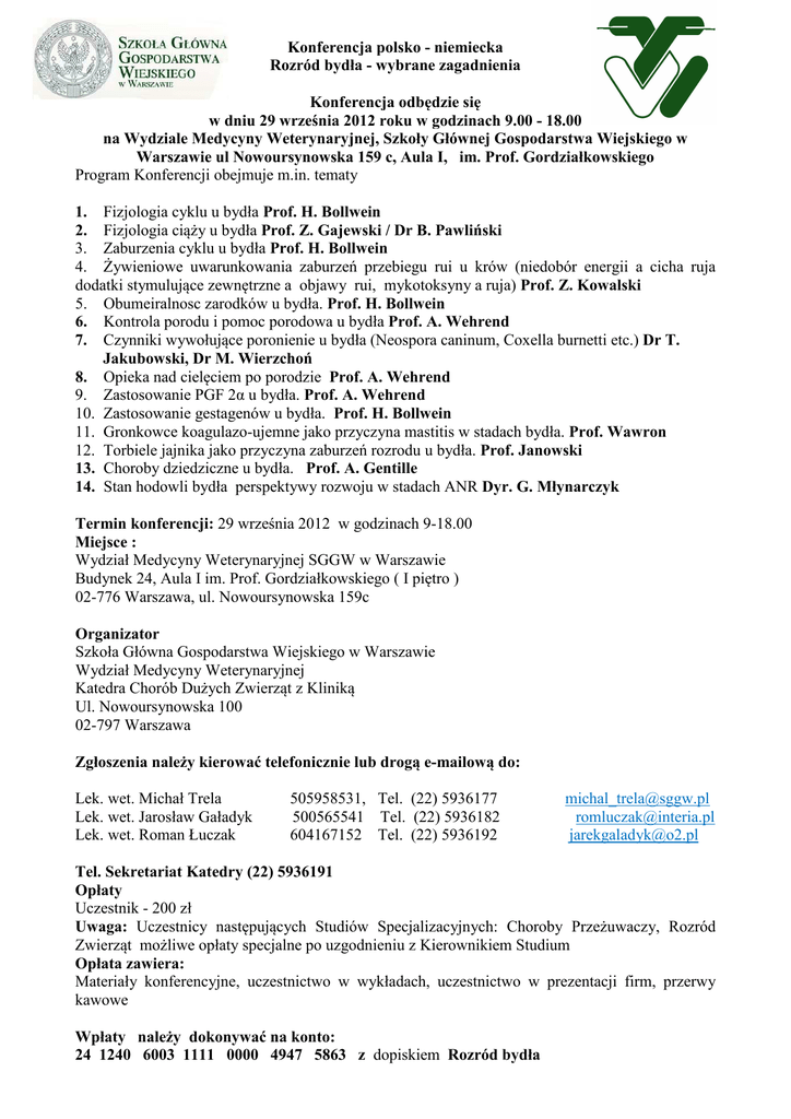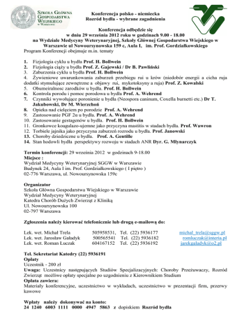 Konferencja polsko - niemiecka Rozród bydła - wybrane zagadnienia Konferencja odbędzie się w dniu 29 września 2012 roku w godzinach 9.00 - 18.00 na Wydziale Medycyny Weterynaryjnej, Szkoły Głównej Gospodarstwa Wiejskiego w Warszawie ul Nowoursynowska 159 c, Aula I, im. Prof. Gordziałkowskiego Program Konferencji obejmuje m.in. tematy 1. Fizjologia cyklu u bydła Prof. H. Bollwein 2. Fizjologia ciąży u bydła Prof. Z. Gajewski / Dr B. Pawliński 3. Zaburzenia cyklu u bydła Prof. H. Bollwein 4. Żywieniowe uwarunkowania zaburzeń przebiegu rui u krów (niedobór energii a cicha ruja dodatki stymulujące zewnętrzne a objawy rui, mykotoksyny a ruja) Prof. Z. Kowalski 5. Obumeiralnosc zarodków u bydła. Prof. H. Bollwein 6. Kontrola porodu i pomoc porodowa u bydła Prof. A. Wehrend 7. Czynniki wywołujące poronienie u bydła (Neospora caninum, Coxella burnetti etc.) Dr T. Jakubowski, Dr M. Wierzchoń 8. Opieka nad cielęciem po porodzie Prof. A. Wehrend 9. Zastosowanie PGF 2α u bydła. Prof. A. Wehrend 10. Zastosowanie gestagenów u bydła. Prof. H. Bollwein 11. Gronkowce koagulazo-ujemne jako przyczyna mastitis w stadach bydła. Prof. Wawron 12. Torbiele jajnika jako przyczyna zaburzeń rozrodu u bydła. Prof. Janowski 13. Choroby dziedziczne u bydła. Prof. A. Gentille 14. Stan hodowli bydła perspektywy rozwoju w stadach ANR Dyr. G. Młynarczyk Termin konferencji: 29 września 2012 w godzinach 9-18.00 Miejsce : Wydział Medycyny Weterynaryjnej SGGW w Warszawie Budynek 24, Aula I im. Prof. Gordziałkowskiego ( I piętro ) 02-776 Warszawa, ul. Nowoursynowska 159c Organizator Szkoła Główna Gospodarstwa Wiejskiego w Warszawie Wydział Medycyny Weterynaryjnej Katedra Chorób Dużych Zwierząt z Kliniką Ul. Nowoursynowska 100 02-797 Warszawa Zgłoszenia należy kierować telefonicznie lub drogą e-mailową do: Lek. wet. Michał Trela Lek. wet. Jarosław Gaładyk Lek. wet. Roman Łuczak 505958531, Tel. (22) 5936177 500565541 Tel. (22) 5936182 604167152 Tel. (22) 5936192 [email protected] [email protected] [email protected] Tel. Sekretariat Katedry (22) 5936191 Opłaty Uczestnik - 200 zł Uwaga: Uczestnicy następujących Studiów Specjalizacyjnych: Choroby Przeżuwaczy, Rozród Zwierząt możliwe opłaty specjalne po uzgodnieniu z Kierownikiem Studium Opłata zawiera: Materiały konferencyjne, uczestnictwo w wykładach, uczestnictwo w prezentacji firm, przerwy kawowe Wpłaty należy dokonywać na konto: 24 1240 6003 1111 0000 4947 5863 z dopiskiem Rozród bydła
