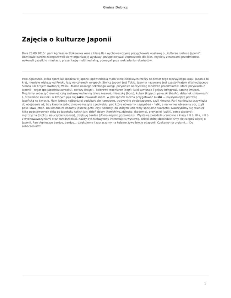 Gmina Dobrcz Zajęcia o kulturze Japonii Dnia 28.09.2016r. pani Agnieszka Zbikowska wraz z klasą IIa i wychowawczynią przygotowała wystawę o „Kulturze i sztuce Japonii”. Uczniowie bardzo zaangażowali się w organizację wystawy, przygotowywali zaproszenia dla klas, etykiety z nazwami przedmiotów, wykonali gazetki o miastach, prezentację multimedialną, pomagali przy rozkładaniu rekwizytów. Pani Agnieszka, która sporo lat spędziła w Japonii, opowiedziała mam wiele ciekawych rzeczy na temat tego niezwykłego kraju. Japonia to kraj, niewiele większy od Polski, leży na czterech wyspach. Stolicą Japonii jest Tokio. Japonia nazywana jest często Krajem Wschodzącego Słońca lub Krajem Kwitnącej Wiśni. Mama naszego szkolnego kolegi, przyniosła na wystawę mnóstwo przedmiotów, które przywiozła z Japonii - zegar (po Japońsku kurokku), obrazy (kaiga), kolorowe wachlarze (oogi), lalki samuraja i gejszy (ningyou), katanę (miecz). Mogliśmy zobaczyć również całą zastawę kuchenną talerz (osara), miseczkę (boru), kubek (koppu), pałeczki (hashi), dzbanek (mizumashi ), drewniane kieliszki, w których pija się sake. Pokazała mam, w jaki sposób można przygotować sushi — najsłynniejszą potrawę japońską na świecie. Nam jednak najbardziej podobały się narodowe, tradycyjne stroje Japonek, czyli kimona. Pani Agnieszka przywiozła do obejrzenia aż, trzy kimona jedno zimowe (uszyte z jedwabiu, pod które ubieramy nagajuban - halki, a na koniec ubieramy obi, czyli pas) i dwa letnie. Do kimona zakładamy jeszcze geta, czyli sandały, do których ubieramy specjalne skarpetki. Nauczyliśmy się również kilka podstawowych słów po Japońsku takich jak: dzień dobry (konichiwa),dziecko, (kodomo), przyjaciel (yujin), serce (kokoro), mężczyzna (otoko), nauczyciel (sensei), dziękuję bardzo (domo arigato gozaimasu) . Wystawę zwiedzili uczniowie z klasy I, II b, III a, i III b z wychowawczyniami oraz przedszkolaki. Każdy był zachwycony interesującą wystawą, dzięki której dowiedzieliśmy się czegoś więcej o Japonii. Pani Agnieszce bardzo, bardzo… dziękujemy i zapraszamy na kolejne żywe lekcje o Japonii. Czekamy na orgiami…. Do zobaczenia!!!! 1
