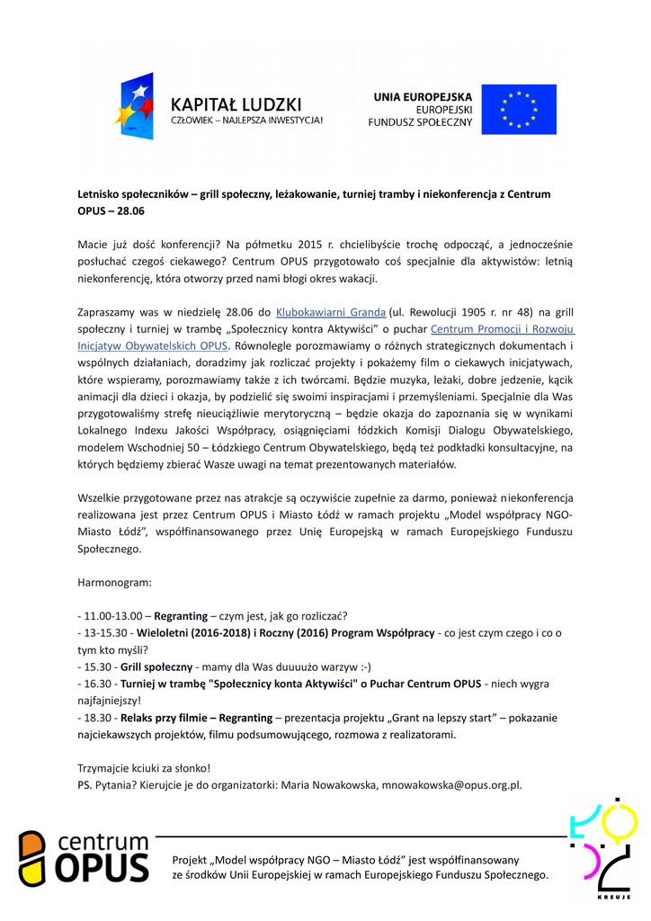 Letnisko społeczników – grill społeczny, leżakowanie, turniej tramby i niekonferencja z Centrum OPUS – 28.06 Macie już dość konferencji? Na półmetku 2015 r. chcielibyście trochę odpocząć, a jednocześnie posłuchać czegoś ciekawego? Centrum OPUS przygotowało coś specjalnie dla aktywistów: letnią niekonferencję, która otworzy przed nami błogi okres wakacji. Zapraszamy was w niedzielę 28.06 do Klubokawiarni Granda (ul. Rewolucji 1905 r. nr 48) na grill społeczny i turniej w trambę „Społecznicy kontra Aktywiści” o puchar Centrum Promocji i Rozwoju Inicjatyw Obywatelskich OPUS. Równolegle porozmawiamy o różnych strategicznych dokumentach i wspólnych działaniach, doradzimy jak rozliczać projekty i pokażemy film o ciekawych inicjatywach, które wspieramy, porozmawiamy także z ich twórcami. Będzie muzyka, leżaki, dobre jedzenie, kącik animacji dla dzieci i okazja, by podzielić się swoimi inspiracjami i przemyśleniami. Specjalnie dla Was przygotowaliśmy strefę nieuciążliwie merytoryczną – będzie okazja do zapoznania się w wynikami Lokalnego Indexu Jakości Współpracy, osiągnięciami łódzkich Komisji Dialogu Obywatelskiego, modelem Wschodniej 50 – Łódzkiego Centrum Obywatelskiego, będą też podkładki konsultacyjne, na których będziemy zbierać Wasze uwagi na temat prezentowanych materiałów. Wszelkie przygotowane przez nas atrakcje są oczywiście zupełnie za darmo, ponieważ niekonferencja realizowana jest przez Centrum OPUS i Miasto Łódź w ramach projektu „Model współpracy NGOMiasto Łódź”, współfinansowanego przez Unię Europejską w ramach Europejskiego Funduszu Społecznego. Harmonogram: - 11.00-13.00 – Regranting – czym jest, jak go rozliczać? - 13-15.30 - Wieloletni (2016-2018) i Roczny (2016) Program Współpracy - co jest czym czego i co o tym kto myśli? - 15.30 - Grill społeczny - mamy dla Was duuuużo warzyw :-) - 16.30 - Turniej w trambę "Społecznicy konta Aktywiści" o Puchar Centrum OPUS - niech wygra najfajniejszy! - 18.30 - Relaks przy filmie – Regranting – prezentacja projektu „Grant na lepszy start” – pokazanie najciekawszych projektów, filmu podsumowującego, rozmowa z realizatorami. Trzymajcie kciuki za słonko! PS. Pytania? Kierujcie je do organizatorki: Maria Nowakowska, [email protected]. Projekt „Model współpracy NGO – Miasto Łódź” jest współfinansowany ze środków Unii Europejskiej w ramach Europejskiego Funduszu Społecznego.
