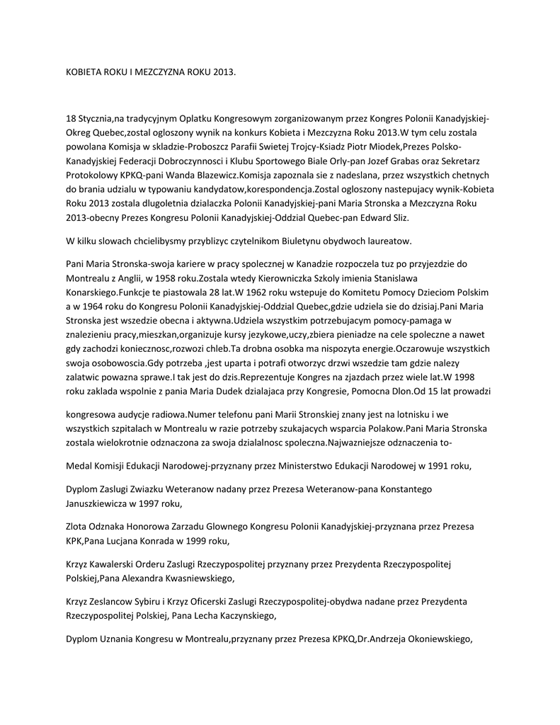 KOBIETA ROKU I MEZCZYZNA ROKU 2013. 18 Stycznia,na tradycyjnym Oplatku Kongresowym zorganizowanym przez Kongres Polonii KanadyjskiejOkreg Quebec,zostal ogloszony wynik na konkurs Kobieta i Mezczyzna Roku 2013.W tym celu zostala powolana Komisja w skladzie-Proboszcz Parafii Swietej Trojcy-Ksiadz Piotr Miodek,Prezes PolskoKanadyjskiej Federacji Dobroczynnosci i Klubu Sportowego Biale Orly-pan Jozef Grabas oraz Sekretarz Protokolowy KPKQ-pani Wanda Blazewicz.Komisja zapoznala sie z nadeslana, przez wszystkich chetnych do brania udzialu w typowaniu kandydatow,korespondencja.Zostal ogloszony nastepujacy wynik-Kobieta Roku 2013 zostala dlugoletnia dzialaczka Polonii Kanadyjskiej-pani Maria Stronska a Mezczyzna Roku 2013-obecny Prezes Kongresu Polonii Kanadyjskiej-Oddzial Quebec-pan Edward Sliz. W kilku slowach chcielibysmy przyblizyc czytelnikom Biuletynu obydwoch laureatow. Pani Maria Stronska-swoja kariere w pracy spolecznej w Kanadzie rozpoczela tuz po przyjezdzie do Montrealu z Anglii, w 1958 roku.Zostala wtedy Kierowniczka Szkoly imienia Stanislawa Konarskiego.Funkcje te piastowala 28 lat.W 1962 roku wstepuje do Komitetu Pomocy Dzieciom Polskim a w 1964 roku do Kongresu Polonii Kanadyjskiej-Oddzial Quebec,gdzie udziela sie do dzisiaj.Pani Maria Stronska jest wszedzie obecna i aktywna.Udziela wszystkim potrzebujacym pomocy-pamaga w znalezieniu pracy,mieszkan,organizuje kursy jezykowe,uczy,zbiera pieniadze na cele spoleczne a nawet gdy zachodzi koniecznosc,rozwozi chleb.Ta drobna osobka ma nispozyta energie.Oczarowuje wszystkich swoja osobowoscia.Gdy potrzeba ,jest uparta i potrafi otworzyc drzwi wszedzie tam gdzie nalezy zalatwic powazna sprawe.I tak jest do dzis.Reprezentuje Kongres na zjazdach przez wiele lat.W 1998 roku zaklada wspolnie z pania Maria Dudek dzialajaca przy Kongresie, Pomocna Dlon.Od 15 lat prowadzi kongresowa audycje radiowa.Numer telefonu pani Marii Stronskiej znany jest na lotnisku i we wszystkich szpitalach w Montrealu w razie potrzeby szukajacych wsparcia Polakow.Pani Maria Stronska zostala wielokrotnie odznaczona za swoja dzialalnosc spoleczna.Najwazniejsze odznaczenia toMedal Komisji Edukacji Narodowej-przyznany przez Ministerstwo Edukacji Narodowej w 1991 roku, Dyplom Zaslugi Zwiazku Weteranow nadany przez Prezesa Weteranow-pana Konstantego Januszkiewicza w 1997 roku, Zlota Odznaka Honorowa Zarzadu Glownego Kongresu Polonii Kanadyjskiej-przyznana przez Prezesa KPK,Pana Lucjana Konrada w 1999 roku, Krzyz Kawalerski Orderu Zaslugi Rzeczypospolitej przyznany przez Prezydenta Rzeczypospolitej Polskiej,Pana Alexandra Kwasniewskiego, Krzyz Zeslancow Sybiru i Krzyz Oficerski Zaslugi Rzeczypospolitej-obydwa nadane przez Prezydenta Rzeczypospolitej Polskiej, Pana Lecha Kaczynskiego, Dyplom Uznania Kongresu w Montrealu,przyznany przez Prezesa KPKQ,Dr.Andrzeja Okoniewskiego, Medal Pro Memoria,przyznany przez Urzad do Spraw Kombatantow i Osob Represjonowanych w 2007 roku. Dyplom Uznania Organizacji Charytatywnej- Myosotis. Zyczymy Pani Marii Stronskiej dalszych sukcesow i wytrwalosci w dazeniu do realizacji celow w pracy spolecznej i w zyciu osobistym. Pan Edward Sliz-Swoja kariere w pracy spolecznej w Kanadzie rozpocza 25 lat temu.Pierwszym krokiem w tym kierunku bylo zainteresowanie sie Zespolami Folklorystycznymi-Tecza i Tatry w Montrealu.To wlasnie do tych zespolow pan Edward Sliz zapisal swoje dzieci-Elzunie,Danusie i Pawelka.Szybko zauwazyl,ze w tych grupach jak i w innych organizacjach polonijnych ciagle brakuje chetnych do pracy spolecznej.I tak to sie zaczelo. Szybko zostaje Prezesem Zespolu tanecznego Tatry,ktorym jest przez dlugi okres czasu.Organizuje dzieciom i mlodziezy wielokrotnie wyjazdy do Polski miedzy innymi na festiwale do Rzeszowa,gdzie wzbudzaja duze zainteresowanie.Tatry,dzieki inwencji pana Edwarda Sliza wystepuja rowniez na Balu Grand Prix Du Canada w 2000 roku.Pan Edward Sliz organizuje wystepy polonijnej mlodziezy w Paradach Swietego Patryka,Swietach Kanady.Mlodziez wyjezdza tez do USA na Festiwal Polski do Milwaukee.Pan Edward Sliz nie tylko stara sie uaktywnic dzialalnosc grupy Tatry ale rowniez jako bisnesmen, wspiera ja finansowo.W 2000 roku prejmuje kierownictwo nad pracami remontowymi w Domu Polskim-Bialy Orzel.W 2002 roku zostaje wybrany Prezesem tejze organizacji.Prezesem tej organizacji jest do dzisiaj.W 2007 roku zostaje wybrany prezesem Kongresu Polonii Kanadyjskiej-Oddzial Quebec.Funkcje te rowniez piastuje do chwili obecnej.Stara sie urozmaicic zycie Polonii poprzez organizowanie spotkan z ciekawymi ludzmi,zabaw,corocznych wyborow Miss Polonia. Organizuje spotkanie z Kardynalem Stanislawem Dziwiszem,Malzonka Prezydenta Rzeczypospolitej Polskiej-Pania Maria Kaczynska w Ottawie.Jest wspolorganizatorem przyjazdu Pana Lecha Walesy do Montrealu.Odbywaja sie powitania i pozegnania przedstawicieli Rzadu Polskiego.Przyjezdrzaja artysci z Polski.Zalatwia tez caly czas sprawy biezace,zaprasza do pracy spolecznej w Kongresie mlodziez,wspolpracuje z ruchem mlodziezowym Quo Vadis.Pan Edward Sliz wielokrotnie za prace spoleczna zostal wielokrotnie odznaczony.Najwazniejsze odznaczenia toSrebrny Krzyz Zaslugi-przyznany przez Prezydenta Rzeczypospolitej Polskiej-Pana Alexandra Kwasniewskiego, Srebrny Krzyz Kawalerski-przyznany przez Prezydenta Rzeczypospolitej Polskiej-Pana Lecha Kaczynskiego, Krzyz SPK-nadany przez prezesa pana Jozefa Foltyna, Medal Quebec National Asemble-przyznany zostal panu Edwardowi Slizowi jako pierwszemu Polakowi za dzialalnosc spoleczna na rzecz dobra Polonii Montrealskiej w 2012 roku, Medal za dzialalnosc spoleczna, w zwiazku z 60 rocznica panowania Krolowej Elzbiety w 2012 roku. Zyczymy jak najwiecej sukcesow i satysfakcji w pracy spolecznej jak i w zyciu osobistym. W imieniu Zarzadu Kongresu Polonii Kanadyjskiej-Oddzial Quebec-Krystyna Betley-Sekretarz KPKQ.