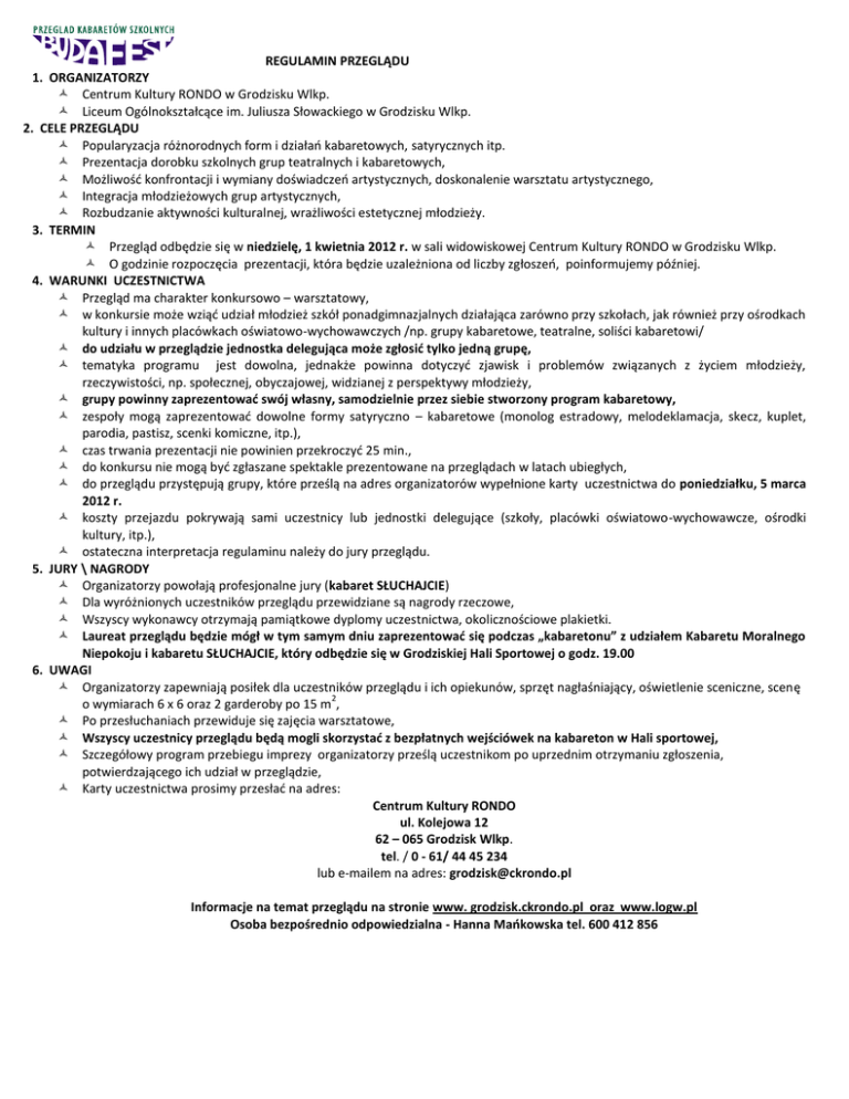 REGULAMIN PRZEGLĄDU 1. ORGANIZATORZY  Centrum Kultury RONDO w Grodzisku Wlkp.  Liceum Ogólnokształcące im. Juliusza Słowackiego w Grodzisku Wlkp. 2. CELE PRZEGLĄDU  Popularyzacja różnorodnych form i działao kabaretowych, satyrycznych itp.  Prezentacja dorobku szkolnych grup teatralnych i kabaretowych,  Możliwośd konfrontacji i wymiany doświadczeo artystycznych, doskonalenie warsztatu artystycznego,  Integracja młodzieżowych grup artystycznych,  Rozbudzanie aktywności kulturalnej, wrażliwości estetycznej młodzieży. 3. TERMIN  Przegląd odbędzie się w niedzielę, 1 kwietnia 2012 r. w sali widowiskowej Centrum Kultury RONDO w Grodzisku Wlkp.  O godzinie rozpoczęcia prezentacji, która będzie uzależniona od liczby zgłoszeo, poinformujemy później. 4. WARUNKI UCZESTNICTWA  Przegląd ma charakter konkursowo – warsztatowy,  w konkursie może wziąd udział młodzież szkół ponadgimnazjalnych działająca zarówno przy szkołach, jak również przy ośrodkach kultury i innych placówkach oświatowo-wychowawczych /np. grupy kabaretowe, teatralne, soliści kabaretowi/  do udziału w przeglądzie jednostka delegująca może zgłosid tylko jedną grupę,  tematyka programu jest dowolna, jednakże powinna dotyczyd zjawisk i problemów związanych z życiem młodzieży, rzeczywistości, np. społecznej, obyczajowej, widzianej z perspektywy młodzieży,  grupy powinny zaprezentowad swój własny, samodzielnie przez siebie stworzony program kabaretowy,  zespoły mogą zaprezentowad dowolne formy satyryczno – kabaretowe (monolog estradowy, melodeklamacja, skecz, kuplet, parodia, pastisz, scenki komiczne, itp.),  czas trwania prezentacji nie powinien przekroczyd 25 min.,  do konkursu nie mogą byd zgłaszane spektakle prezentowane na przeglądach w latach ubiegłych,  do przeglądu przystępują grupy, które prześlą na adres organizatorów wypełnione karty uczestnictwa do poniedziałku, 5 marca 2012 r.  koszty przejazdu pokrywają sami uczestnicy lub jednostki delegujące (szkoły, placówki oświatowo-wychowawcze, ośrodki kultury, itp.),  ostateczna interpretacja regulaminu należy do jury przeglądu. 5. JURY \ NAGRODY  Organizatorzy powołają profesjonalne jury (kabaret SŁUCHAJCIE)  Dla wyróżnionych uczestników przeglądu przewidziane są nagrody rzeczowe,  Wszyscy wykonawcy otrzymają pamiątkowe dyplomy uczestnictwa, okolicznościowe plakietki.  Laureat przeglądu będzie mógł w tym samym dniu zaprezentowad się podczas „kabaretonu” z udziałem Kabaretu Moralnego Niepokoju i kabaretu SŁUCHAJCIE, który odbędzie się w Grodziskiej Hali Sportowej o godz. 19.00 6. UWAGI  Organizatorzy zapewniają posiłek dla uczestników przeglądu i ich opiekunów, sprzęt nagłaśniający, oświetlenie sceniczne, scenę 2 o wymiarach 6 x 6 oraz 2 garderoby po 15 m ,  Po przesłuchaniach przewiduje się zajęcia warsztatowe,  Wszyscy uczestnicy przeglądu będą mogli skorzystad z bezpłatnych wejściówek na kabareton w Hali sportowej,  Szczegółowy program przebiegu imprezy organizatorzy prześlą uczestnikom po uprzednim otrzymaniu zgłoszenia, potwierdzającego ich udział w przeglądzie,  Karty uczestnictwa prosimy przesład na adres: Centrum Kultury RONDO ul. Kolejowa 12 62 – 065 Grodzisk Wlkp. tel. / 0 - 61/ 44 45 234 lub e-mailem na adres: [email protected] Informacje na temat przeglądu na stronie www. grodzisk.ckrondo.pl oraz www.logw.pl Osoba bezpośrednio odpowiedzialna - Hanna Maokowska tel. 600 412 856