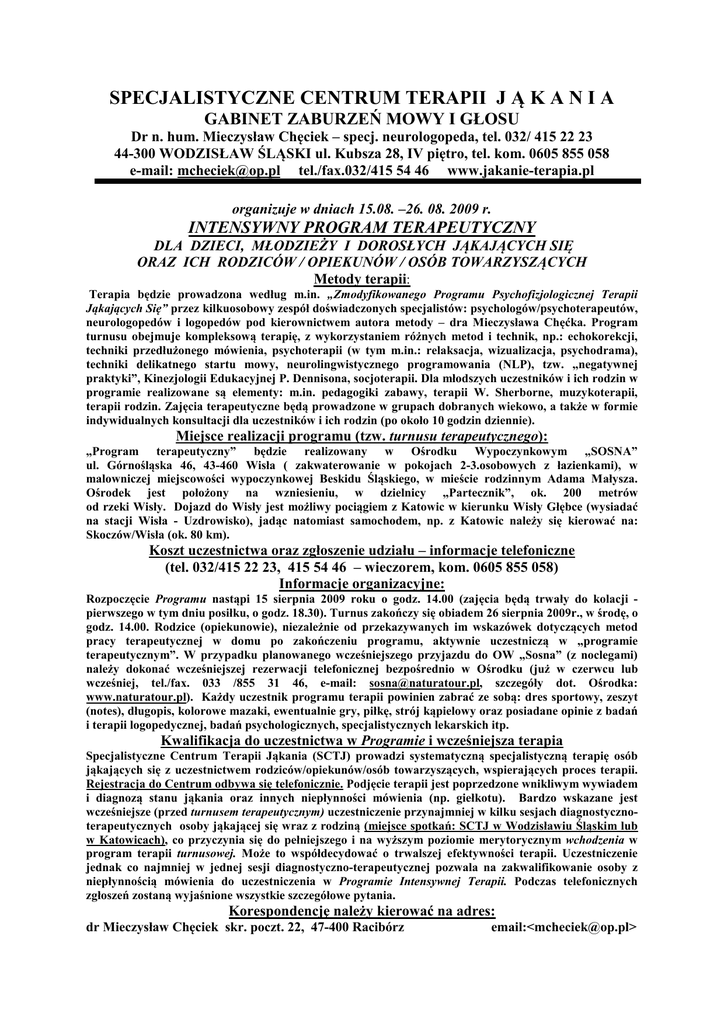 SPECJALISTYCZNE CENTRUM TERAPII J Ą K A N I A GABINET ZABURZEŃ MOWY I GŁOSU Dr n. hum. Mieczysław Chęciek – specj. neurologopeda, tel. 032/ 415 22 23 44-300 WODZISŁAW ŚLĄSKI ul. Kubsza 28, IV piętro, tel. kom. 0605 855 058 e-mail: [email protected] tel./fax.032/415 54 46 www.jakanie-terapia.pl organizuje w dniach 15.08. –26. 08. 2009 r. INTENSYWNY PROGRAM TERAPEUTYCZNY DLA DZIECI, MŁODZIEŻY I DOROSŁYCH JĄKAJĄCYCH SIĘ ORAZ ICH RODZICÓW / OPIEKUNÓW / OSÓB TOWARZYSZĄCYCH Metody terapii: Terapia będzie prowadzona według m.in. „Zmodyfikowanego Programu Psychofizjologicznej Terapii Jąkających Się” przez kilkuosobowy zespół doświadczonych specjalistów: psychologów/psychoterapeutów, neurologopedów i logopedów pod kierownictwem autora metody – dra Mieczysława Chęćka. Program turnusu obejmuje kompleksową terapię, z wykorzystaniem różnych metod i technik, np.: echokorekcji, techniki przedłużonego mówienia, psychoterapii (w tym m.in.: relaksacja, wizualizacja, psychodrama), techniki delikatnego startu mowy, neurolingwistycznego programowania (NLP), tzw. „negatywnej praktyki”, Kinezjologii Edukacyjnej P. Dennisona, socjoterapii. Dla młodszych uczestników i ich rodzin w programie realizowane są elementy: m.in. pedagogiki zabawy, terapii W. Sherborne, muzykoterapii, terapii rodzin. Zajęcia terapeutyczne będą prowadzone w grupach dobranych wiekowo, a także w formie indywidualnych konsultacji dla uczestników i ich rodzin (po około 10 godzin dziennie). Miejsce realizacji programu (tzw. turnusu terapeutycznego): „Program terapeutyczny” będzie realizowany w Ośrodku Wypoczynkowym „SOSNA” ul. Górnośląska 46, 43-460 Wisła ( zakwaterowanie w pokojach 2-3.osobowych z łazienkami), w malowniczej miejscowości wypoczynkowej Beskidu Śląskiego, w mieście rodzinnym Adama Małysza. Ośrodek jest położony na wzniesieniu, w dzielnicy „Partecznik”, ok. 200 metrów od rzeki Wisły. Dojazd do Wisły jest możliwy pociągiem z Katowic w kierunku Wisły Głębce (wysiadać na stacji Wisła - Uzdrowisko), jadąc natomiast samochodem, np. z Katowic należy się kierować na: Skoczów/Wisła (ok. 80 km). Koszt uczestnictwa oraz zgłoszenie udziału – informacje telefoniczne (tel. 032/415 22 23, 415 54 46 – wieczorem, kom. 0605 855 058) Informacje organizacyjne: Rozpoczęcie Programu nastąpi 15 sierpnia 2009 roku o godz. 14.00 (zajęcia będą trwały do kolacji pierwszego w tym dniu posiłku, o godz. 18.30). Turnus zakończy się obiadem 26 sierpnia 2009r., w środę, o godz. 14.00. Rodzice (opiekunowie), niezależnie od przekazywanych im wskazówek dotyczących metod pracy terapeutycznej w domu po zakończeniu programu, aktywnie uczestniczą w „programie terapeutycznym”. W przypadku planowanego wcześniejszego przyjazdu do OW „Sosna” (z noclegami) należy dokonać wcześniejszej rezerwacji telefonicznej bezpośrednio w Ośrodku (już w czerwcu lub wcześniej, tel./fax. 033 /855 31 46, e-mail: [email protected], szczegóły dot. Ośrodka: www.naturatour.pl). Każdy uczestnik programu terapii powinien zabrać ze sobą: dres sportowy, zeszyt (notes), długopis, kolorowe mazaki, ewentualnie gry, piłkę, strój kąpielowy oraz posiadane opinie z badań i terapii logopedycznej, badań psychologicznych, specjalistycznych lekarskich itp. Kwalifikacja do uczestnictwa w Programie i wcześniejsza terapia Specjalistyczne Centrum Terapii Jąkania (SCTJ) prowadzi systematyczną specjalistyczną terapię osób jąkających się z uczestnictwem rodziców/opiekunów/osób towarzyszących, wspierających proces terapii. Rejestracja do Centrum odbywa się telefonicznie. Podjęcie terapii jest poprzedzone wnikliwym wywiadem i diagnozą stanu jąkania oraz innych niepłynności mówienia (np. giełkotu). Bardzo wskazane jest wcześniejsze (przed turnusem terapeutycznym) uczestniczenie przynajmniej w kilku sesjach diagnostycznoterapeutycznych osoby jąkającej się wraz z rodziną (miejsce spotkań: SCTJ w Wodzisławiu Śląskim lub w Katowicach), co przyczynia się do pełniejszego i na wyższym poziomie merytorycznym wchodzenia w program terapii turnusowej. Może to współdecydować o trwalszej efektywności terapii. Uczestniczenie jednak co najmniej w jednej sesji diagnostyczno-terapeutycznej pozwala na zakwalifikowanie osoby z niepłynnością mówienia do uczestniczenia w Programie Intensywnej Terapii. Podczas telefonicznych zgłoszeń zostaną wyjaśnione wszystkie szczegółowe pytania. Korespondencję należy kierować na adres: dr Mieczysław Chęciek skr. poczt. 22, 47-400 Racibórz email:<[email protected]>