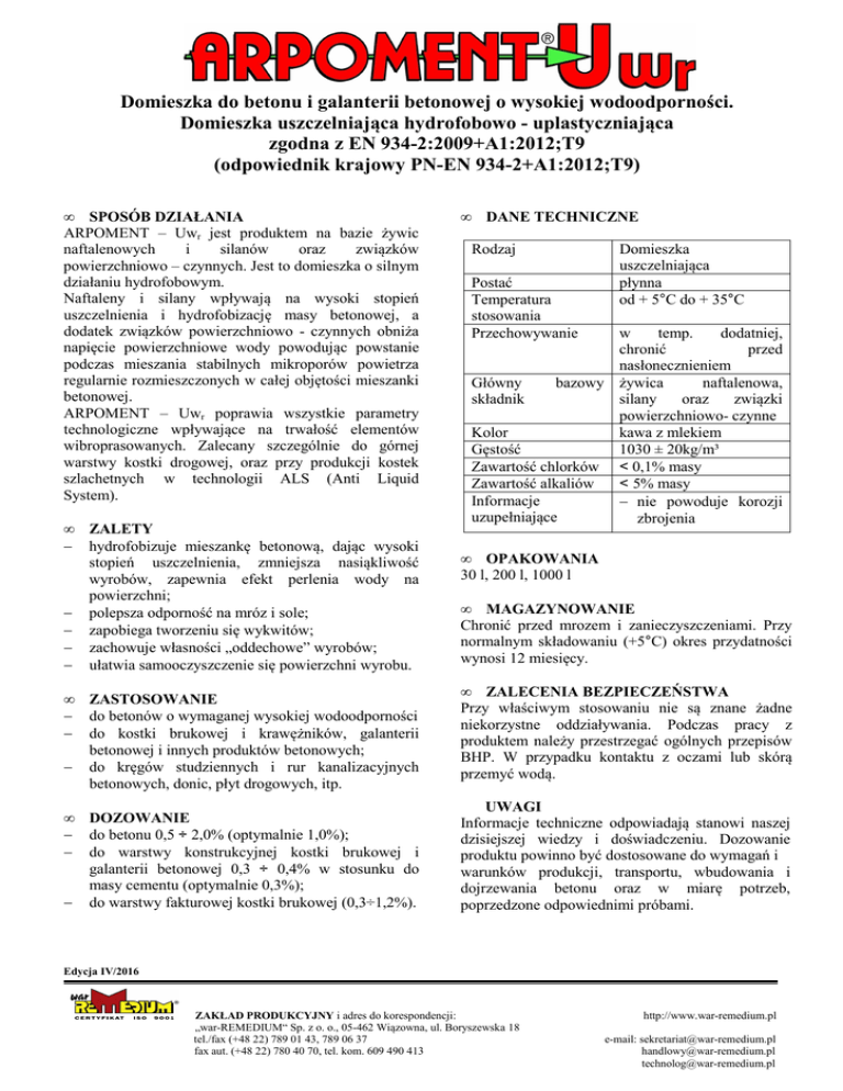 Domieszka do betonu i galanterii betonowej o wysokiej wodoodporności. Domieszka uszczelniająca hydrofobowo - uplastyczniająca zgodna z EN 934-2:2009+A1:2012;T9 (odpowiednik krajowy PN-EN 934-2+A1:2012;T9) • SPOSÓB DZIAŁANIA ARPOMENT – Uwr jest produktem na bazie żywic naftalenowych i silanów oraz związków powierzchniowo – czynnych. Jest to domieszka o silnym działaniu hydrofobowym. Naftaleny i silany wpływają na wysoki stopień uszczelnienia i hydrofobizację masy betonowej, a dodatek związków powierzchniowo - czynnych obniża napięcie powierzchniowe wody powodując powstanie podczas mieszania stabilnych mikroporów powietrza regularnie rozmieszczonych w całej objętości mieszanki betonowej. ARPOMENT – Uwr poprawia wszystkie parametry technologiczne wpływające na trwałość elementów wibroprasowanych. Zalecany szczególnie do górnej warstwy kostki drogowej, oraz przy produkcji kostek szlachetnych w technologii ALS (Anti Liquid System). • − − − − − • − − − • − − − ZALETY hydrofobizuje mieszankę betonową, dając wysoki stopień uszczelnienia, zmniejsza nasiąkliwość wyrobów, zapewnia efekt perlenia wody na powierzchni; polepsza odporność na mróz i sole; zapobiega tworzeniu się wykwitów; zachowuje własności „oddechowe” wyrobów; ułatwia samooczyszczenie się powierzchni wyrobu. ZASTOSOWANIE do betonów o wymaganej wysokiej wodoodporności do kostki brukowej i krawężników, galanterii betonowej i innych produktów betonowych; do kręgów studziennych i rur kanalizacyjnych betonowych, donic, płyt drogowych, itp. DOZOWANIE do betonu 0,5 ÷ 2,0% (optymalnie 1,0%); do warstwy konstrukcyjnej kostki brukowej i galanterii betonowej 0,3 ÷ 0,4% w stosunku do masy cementu (optymalnie 0,3%); do warstwy fakturowej kostki brukowej (0,3÷1,2%). • DANE TECHNICZNE Rodzaj Postać Temperatura stosowania Przechowywanie Domieszka uszczelniająca płynna od + 5°C do + 35°C w temp. dodatniej, chronić przed nasłonecznieniem Główny bazowy żywica naftalenowa, składnik silany oraz związki powierzchniowo- czynne Kolor kawa z mlekiem Gęstość 1030 ± 20kg/m³ Zawartość chlorków < 0,1% masy Zawartość alkaliów < 5% masy Informacje − nie powoduje korozji uzupełniające zbrojenia • OPAKOWANIA 30 l, 200 l, 1000 l • MAGAZYNOWANIE Chronić przed mrozem i zanieczyszczeniami. Przy normalnym składowaniu (+5°C) okres przydatności wynosi 12 miesięcy. • ZALECENIA BEZPIECZEŃSTWA Przy właściwym stosowaniu nie są znane żadne niekorzystne oddziaływania. Podczas pracy z produktem należy przestrzegać ogólnych przepisów BHP. W przypadku kontaktu z oczami lub skórą przemyć wodą. UWAGI Informacje techniczne odpowiadają stanowi naszej dzisiejszej wiedzy i doświadczeniu. Dozowanie produktu powinno być dostosowane do wymagań i warunków produkcji, transportu, wbudowania i dojrzewania betonu oraz w miarę potrzeb, poprzedzone odpowiednimi próbami. Edycja IV/2016 ZAKŁAD PRODUKCYJNY i adres do korespondencji: „war-REMEDIUM“ Sp. z o. o., 05-462 Wiązowna, ul. Boryszewska 18 tel./fax (+48 22) 789 01 43, 789 06 37 fax aut. (+48 22) 780 40 70, tel. kom. 609 490 413 http://www.war-remedium.pl e-mail: [email protected] [email protected] [email protected]