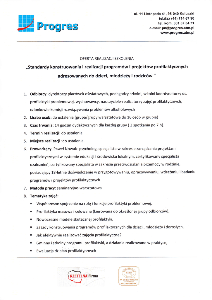 §li§E ul. 11 Listopada 41, 95-040 Koluszki tel./fax |44|71467 90 Progr€§ tel. kom. 60137 3471 e-mail : pn@progres,atm,pl www.progres.atm.pl oFERTA REAL|ZACJl SZKoLENlA ,,Standardy konstruowania i realizacji programów i projektów profilaktycznych adresowanych do dzieci, młodzieżyi rodziców " 1,. Odbiorcy: dyrektorzy placówek oświatowych, pedagodzy szkolni, szkolni koordynatorzy ds. profilaktyki problemowej, wychowawcy/ nauczyciele-realizatorzy zajęc profilaktycznych, człon kowie kom isji rozwiązywa 2. 3. 4. 5. 6. n ia prob lemów al koholowych Liczba osób: do ustalenia (grupa/grupy warsztatowe do 1-6 osób w grupie) Czas trwania: 14 godzin dydaktycznych dla kazdej grupy ( 2 spotkania po 7 h). Termin realizacji: do ustalenia Miejsce realizacji :do ustalenia. Prowadzący: Paweł Nowak- psycholog, specjalista w zakresie zarządzania projektami profilaktycznymi w systemie edukacji i środowisku lokalnym, certyfikowany specjalista uzależnień, certyfikowany specjalista w zakresie przeciwdziałania przemocy w rodzinie, posiadający 18-1etnie doświadczenie w przygotowywaniu, opracowywaniu, wdrażaniu i badaniu programów i projektów profilaktycznych. 7, Metoda pracy: seminaryjno-warsztatowa 8. Tematyka zajęć: . . r . . . . współczesne spojrzenie na rolę ifunkcje profilaktyki problemowej, profilaktyka masowa i celowana (kierowana do określonej grupy odbiorców), Nowoczesne modele skutecznej profilaktyki, zasady konstruowania programów profilaktycznych dla dzieci , młodzieży i dorosłych, Jak efektywnie realizować zajęcia profilaktyczne? Gminny i szkolny proBramu profilaktyki, a działania realizowane w praktyce, Ewaluacja działań profilaktycznych /"--"* j: --------. ,] .,l-i"n'u,ł. l :-*__-'l- t nzrrrlnn Firma |-" ||, .. ,_,,-_,} . | (-},ll l -.4i.i]i],!_.::, l: lr_l,t llrl gołl,:ooo i,,,",,,,",,,", "ł9'.,,1.,,l.|.,Ą}W,:,:,|,:_.yu : ul. 11 Listopada 41, 95-040 Koluszki tel./fax (44| 714 67 90 tel. kom. 60137 3471 e-mail: [email protected] :§! Progrg§ 9. www.progres.atm,pl Sposób ewa!uacji: ankieta ewaluacyjna wypełniana przez uczestników szkolenia 10, Koszt ogółem: 2190 zl/grupa lub ż9O zł/os, W cenę wliczono materiały i zaświadczenia dla uczestników. Koszt nie obejmuje ewentualnego wynajmu sali , wyżywienia/przerw kawowych dla uczestników oraz dojazdu/noclegu trenera. Uczestnicy szkolenia po jego zakończeniu będą mogli skorzystać także z superwizji własnej pracy i/l u b recenzj i op racowa nego a utorski ego p rojektu profi la ktycznego. _r-i:T1,," \ /ł::..._...........::l\, nzrr*n* \J t Firma i CF:RI, \--1*}, --! 1.,1,1!1)!!^:! , _/ l'Nl.]i\ |s(} 900l::{'0s:i lll13ł1ll2Il21,1lC : ;i !l || :i