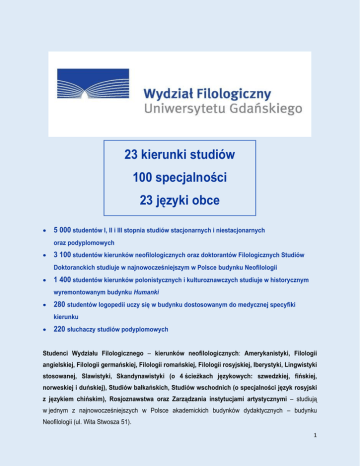 23 kierunki studiów 100 specjalności 23 języki obce 5 000 studentów I, II i III stopnia studiów stacjonarnych i niestacjonarnych oraz podyplomowych 3 100 studentów kierunków neofilologicznych oraz doktorantów Filologicznych Studiów Doktoranckich studiuje w najnowocześniejszym w Polsce budynku Neofilologii 1 400 studentów kierunków polonistycznych i kulturoznawczych studiuje w historycznym wyremontowanym budynku Humanki 280 studentów logopedii uczy się w budynku dostosowanym do medycznej specyfiki kierunku 220 słuchaczy studiów podyplomowych Studenci Wydziału Filologicznego – kierunków neofilologicznych: Amerykanistyki, Filologii angielskiej, Filologii germańskiej, Filologii romańskiej, Filologii rosyjskiej, Iberystyki, Lingwistyki stosowanej, Slawistyki, Skandynawistyki (o 4 ścieżkach językowych: szwedzkiej, fińskiej, norweskiej i duńskiej), Studiów bałkańskich, Studiów wschodnich (o specjalności język rosyjski z językiem chińskim), Rosjoznawstwa oraz Zarządzania instytucjami artystycznymi – studiują w jednym z najnowocześniejszych w Polsce akademickich budynków dydaktycznych – budynku Neofilologii (ul. Wita Stwosza 51). 1 W nowym budynku studiuje ponad 3100 studentów i doktorantów. Znajdują się tu Instytuty: Anglistyki i Amerykanistyki, Filologii Germańskiej, Filologii Romańskiej, Skandynawistyki i Lingwistyki Stosowanej, Filologii Wschodniosłowiańskiej oraz Katedra Slawistyki i Katedra Sztuk Scenicznych. W związku z powstaniem nowego budynku dla neofilologii Wydział Filologiczny Uniwersytetu Gdańskiego posiada obecnie aż 3 siedziby. Studenci kierunków polonistycznych, kulturoznawczych i artystycznych czyli Kulturoznawstwa, Etnofilologii kaszubskiej, Filologii polskiej, Filologii klasycznej, Studium humanitatis – tradycji cywilizacji europejskiej, Wiedzy o filmie i kulturze audiowizualnej, Wiedzy o teatrze, Teatrologii oraz Sinologii studiują w historycznym, wyremontowanym niedawno budynku Wydziału Filologicznego zwanym przez studentów Humanką (ul. Wita Stwosza 55). Studenci Logopedii – międzyuczelnianego kierunku filologiczno-medycznego (prowadzonego wspólnie z Gdańskim Uniwersytetem Medycznym) studiują w dostosowanym do specyfiki kierunku budynku Parlamentu Studentów (ul. Wita Stwosza 58). W budynku Neofilologii liczącym 13 tysięcy metrów kwadratowych znajdują się: sala teatralna na 408 miejsc, 59 sal dydaktycznych wyposażonych m.in. w tablice interaktywne i rzutniki multimedialne, 4 aule (3 aule na 108 miejsc, 1 aula na 200 miejsc), 124 gabinety dla pracowników naukowych oraz 5 pokoi dla pracowników Dziekanatu. 2 Nowy budynek Neofilologii Wydziału Filologicznego posiada 2 laboratoria do nauki języków obcych wyposażone w system Sanako, 2 sale z kabinami do nauki tłumaczeń symultanicznych, 5 sal komputerowych oraz 3 specjalistyczne sale do kształcenia tłumaczy języków obcych. Dzięki temu służy on kształceniu absolwentów o bardzo wysokich kompetencjach językowych (biegle władających co najmniej dwoma językami obcymi), którzy są przygotowani do zadań na rynku pracy wymagających od nich wielu różnych kompetencji głównie z zakresu komunikacji międzykulturowej. Salę teatralną (408 miejsc) za pomocą ruchomej ściany można podzielić na dwie sale wykładowe po 204 miejsca. Scena wyposażona jest w nowoczesną aparaturę oraz fortepian marki Yamaha. Służy ona kierunkom o profilu artystycznym np. Zarządzaniu instytucjami artystycznymi, teatrom studenckim oraz Akademickiemu Centrum Kultury „Alternator”, Dyskusyjnemu Klubowi Filmowemu „Miłość Blondynki” czy Zespołowi Pieśni i Tańca „Jantar”. Nowoczesna baza naukowo-dydaktyczna Wydziału Filologicznego, nawiązującego do akademickiej tradycji sztuk wyzwolonych, pełni funkcję międzynarodowego centrum naukowo-kulturalnego. Tu organizowane są konferencje naukowe o zasięgu międzynarodowym, wykłady otwarte, sympozja, dyskusje panelowe oraz wydarzenia teatralne, muzyczne i kulturalne, integrujące naukowców i twórców z Pomorza (szczególnie młodych stojących u progu swoich poczynań twórczych) w celu prezentacji swojego dorobku naukowego i kulturalnego w regionie, w Polsce i na świecie. Wydział Filologiczny zapewnia wysoki poziom nauczania 23 języków obcych angielskiego, białoruskiego, chińskiego, chorwackiego, duńskiego, fińskiego, francuskiego, hiszpańskiego, japońskiego, łacińskiego, niemieckiego, norweskiego, portugalskiego, rosyjskiego, serbskiego, starogreckiego, szwedzkiego, tureckiego, ukraińskiego, włoskiego oraz regionalnego języka kaszubskiego, a także w miarę zapotrzebowania litewskiego i łotewskiego. 3 100 specjalności na 23 kierunkach Rodzaje specjalności na studiach licencjackich i magisterskich stacjonarnych i niestacjonarnych 1. Filologiczna: FILOLOGIA KLASYCZNA (studia klasyczne, studia renesansowe) STUDIUM HUMANITATIS – TRADYCJE CYWILIZACJI EUROPEJSKIEJ 2. Nauczycielska: ETNOFILOLOGIA KASZUBSKA, FILOLOGIA ANGIELSKA, FILOLOGIA GERMAŃSKA, FILOLOGIA KLASYCZNA, FILOLOGIA ROMAŃSKA, FILOLOGIA ROSYJSKA, FILOLOGIA POLSKA (nauczanie języka polskiego jako obcego), LINGWISTYKA STOSOWANA, LOGOPEDIA 3. Translatoryczna: FILOLOGIA ANGIELSKA, FILOLOGIA GERMAŃSKA, FILOLOGIA ROMAŃSKA, FILOLOGIA ROSYJSKA (translatoryka i język biznesu); IBERYSTYKA, LINGWISTYKA STOSOWANA, SKANDYNAWISTYKA, SLAWISTYKA 4. Literaturoznawcza: AMERYKANISTYKA, FILOLOGIA ANGIELSKA, FILOLOGIA GERMAŃSKA, FILOLOGIA KLASYCZNA (wiedza o literaturze, książce i teatrze), FILOLOGIA ROMAŃSKA, FILOLOGIA ROSYJSKA, FILOLOGIA POLSKA, IBERYSTYKA, SKANDYNAWISTYKA, SLAWISTYKA 5. Językoznawcza: AMERYKANISTYKA, ETNOFILOLOGIA KASZUBSKA, FILOLOGIA ANGIELSKA (komputerowe przetwarzanie języka naturalnego), FILOLOGIA GERMAŃSKA, FILOLOGIA KLASYCZNA, FILOLOGIA POLSKA (m.in. nauczanie języka polskiego jako obcego), FILOLOGIA ROMAŃSKA, FILOLOGIA ROSYJSKA (lingwistyczna), LOGOPEDIA, IBERYSTYKA, LINGWISTYKA STOSOWANA, ROSJOZNAWST