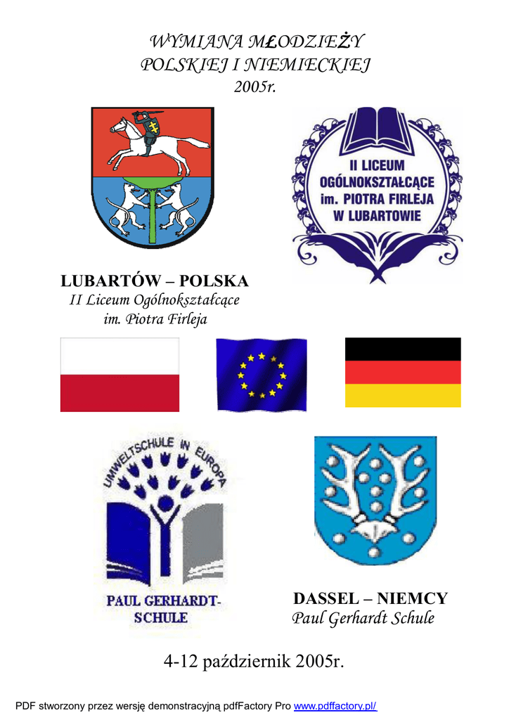 WYMIANA MŁODZIEŻY POLSKIEJ I NIEMIECKIEJ 2005r. LUBARTÓW – POLSKA II Liceum Ogólnokształcące im. Piotra Firleja DASSEL – NIEMCY Paul Gerhardt Schule 4-12 październik 2005r. PDF stworzony przez wersję demonstracyjną pdfFactory Pro www.pdffactory.pl/ WYMIANA MŁODZIEŻY POLSKIEJ I NIEMIECKIEJ 2005r. DASSEL – NIEMCY Paul Gerhardt Schule LUBARTÓW – POLSKA II Liceum Ogólnokształcące im. Piotra Firleja 4-12 październik 2005r. PDF stworzony przez wersję demonstracyjną pdfFactory Pro www.pdffactory.pl/ Program polsko-niemieckiego spotkania młodzieży 4-12 października 2005 Temat: „Wolontariat w Polsce i w Niemczech” Wtorek, 4.10. 21.30 - Przyjazd uczestników - Lublin - Dworzec PKP Środa, 5.10. 9.00 - Śniadanie u rodzin uczniów 9.30 - Powitanie i przedstawienie programu spotkania - II LO 10.30 - Udział w zajęciach szkolnych - II LO 12.00 - Obiad - II LO 12.30 - Ślubowanie klas pierwszych oraz przyjęcie młodzieży niemieckiej do społeczności uczniowskiej II LO na czas pobytu w Polsce 14.30 - Wprowadzenie do tematu spotkania, zabawy i gry służące bliższemu poznaniu (praca w polsko - niemieckich zespołach) - II LO 17.30 - Kolacja „Kuchnia polska” - II LO 18.00 - Dyskoteka - II LO Czwartek, 6.10. 9.00 - Śniadanie u rodzin uczniów 9.30 - Spotkanie z władzami miasta w Urzędzie Miasta Lubartów 10.00 - Wyjazd do Kozłówki, zwiedzanie pałacu 13.00 - Obiad - II LO 14.00 - Spacer po Lubartowie, zapoznanie z pracą wolontariuszy w Lubartowie 16.00 - Jadwinów - praca wolontariuszy 18.00 - Spotkanie w „Emaus”, ognisko Piątek, 7.10. 8.30 - Śniadanie u rodzin uczniów 9.00 - Wyjazd do Lublina 10.30 - Szkolenie dla wolontariuszy w Centrum Wolontariatu w Lublinie 12.00 - Zwiedzanie Starego Miasta 14.00 - Obiad w Lublinie 14.30 - Wizyta w instytucjach związanych z pracą wolontariuszy (Dom Dziecka nr 1, Dom Młodzieży SOS, Świetlica opiekuńczo - wychowawcza) 18.30 - Kolacja u rodzin uczniów PDF stworzony przez wersję demonstracyjną pdfFactory Pro www.pdffactory.pl/ Sobota, 8.10. 8.30 - Śniadanie u rodzin uczniów 9.00 - Wyjazd do Lublina 10.00 - Zwiedzanie muzeum na Majdanku - Wyjazd do Kazimierza 13.00 - Obiad w Kazimierzu 13.30 - Zwiedzanie Kazimierza 18.30 - Kolacja u rodzin uczniów Niedziela, 9.10. Do dyspozycji rodzin Poniedziałek, 10.10. 9.00 - Śniadanie u rodzin uczniów 10.00 - 12.00 - Europejski Dzień Sportu (polsko-niemieckie zespoły) 12.40 - Obiad - II LO 13.30 - Wyjazd do Dąbrówki (Eko-spotkanie i ognisko) 18.30 - Kolacja u rodzin uczniów Wtorek, 11.10 9.00 - Śniadanie u rodzin uczniów 9.45 - 11.30 - Udział w zajęciach szkolnych - II LO 12.00 - Obiad - II LO 12.30 - 16.30 - Podróż do miejsc pamięci (cmentarze niemieckich żołnierzy w okolicach Lubartowa) Od 17.00 - Podsumowanie spotkania - Kolacja Restauracja Laguna - Spotkanie pożegnalne } Środa,12.10. 7.00 - Wyjazd uczestników z Lubartowa 8.30 - Wyjazd uczestników z Lublina PDF stworzony przez wersję demonstracyjną pdfFactory Pro www.pdffactory.pl/ Programm deutsch – polnischer Jugendbegegnung vom 4. bis zum 12. Oktober 2005 Thema: „Freiwilligenarbeit in Deutschland und Polen“ Geplanter Programmablauf: Dienstag, 4. Oktober 21.30 Anreise der TeilnehmerInnen Beziehen der Zimmer bei Gastfamilien Mittwoch, 5. Oktober 9.00 9.30 10.30 12.00 12.30 14.30 Frühstück Begrüßung, Vorstellung des Programms, Erwartungen der Teilnehmer Teilnahme am Unterricht (Deutsch, Englisch, Informatik, Sport) Mittagessen Gelöbnis der Ersten Klassen Einstieg ins Thema über Freiwilligenarbeit in Deutschland und Polen, Kennenlernspiele (Arbeit in gemischten dt. – pl. Gruppen, Präsentationen) 17.30 Abendessen – „Polnische Küche“ 18.00 Diskothek Donnerstag, 6. Oktober 9.00 9.30 10.00 13.00 14.00 16.00 18.00 Frühstück Begegnung mit der Stadtbehörde Besichtigung des Palastes in Kozłówka Mittagessen Stadtbummel, Begegnung mit polnischen Volontären Arbeit als Volontäre in Jadwinow Erholung am Lagerfeuer Freitag, 7. Oktober 9.00 10.30 12.00 14.00 14.30 18.30 Frühstück Fahrt nach Lublin Schulung für Volontäre Besichtigung der Altstadt Mittagessen Besuch der sozialen Einrichtungen (Krankenhäuser, Altersheime, Kindergärten, Kinderheime) Abendessen Samstag, 8. Oktober 9.00 Frühstück Fahrt nach Lublin 10.00 Besuch des ehemaligen Konzentrationslagers Majdanek PDF stworzony przez wersję demonstracyjną pdfFactory Pro www.pdffactory.pl/ Fahrt nach Kazimierz 14.00 Mittagessen 13.30 Besichtigung der Stadt 18.30 Abendessen Sonntag, 9. Oktober zur Verfügung der Familien Montag, 10. Oktober 9.00 10.00 14.00 15.00 18.30 Frühstück Anfang des Sporttages (Spiel, Sport und Spaß in gemischten dt. – pl. Teams) Mittagessen Fahrt nach Dabrowka Abendessen Dienstag, 11. Oktober 9.00 10.00 13.00 14.00 Frühstück Teilnahme am Unterricht (Deutsch, Englisch, Informatik, Sport) Mittagessen Gedenkstättenfahrt (Friedhöfe der deutschen Soldaten in der Nähe von Lubartów) 16.00 Auswertung des Programms 17.00 Abendessen, gemeinsamer Abschiedsabend (Restaurant „Laguna“) Mittwoch, 12. Oktober 8.30 Abreise der TeilnehmerInnen PDF stworzony przez wersję demonstracyjną pdfFactory Pro www.pdffactory.pl/ Program polsko-niemieckiego spotkania młodzieży 4-12 października 2005 Temat: „Wolontariat w Polsce i w Niemczech” Wtorek, 4.10. 21.30 - Przyjazd uczestników - Lublin - Dworzec PKP Przyjazd o godzinie 21.30 Jedna z uczennic wraz z Panią Dyrektor oraz dwoma germanistami, przywitali grupę młodzieży niemieckiej na dworcu kolejowym w Lublinie. Po przyjeździe do Lubartowa odbyło się krótkie spotkanie powitalne w budynku naszego LO. Wszyscy byliśmy bardzo zmęczeni, jednak na naszych twarzach widniały uśmiechy z podekscytowanymi humorami udaliśmy się wszyscy na noc do domów wraz z naszymi gośćmi z Niemiec. Dienstag, 4. Oktober 21.30 Anreise der TeilnehmerInnen Beziehen der Zimmer bei Gastfamilien Erster Tag Ankunft: Um 21.30 Uhr fuhren eine der Schülerinnen, zwei D