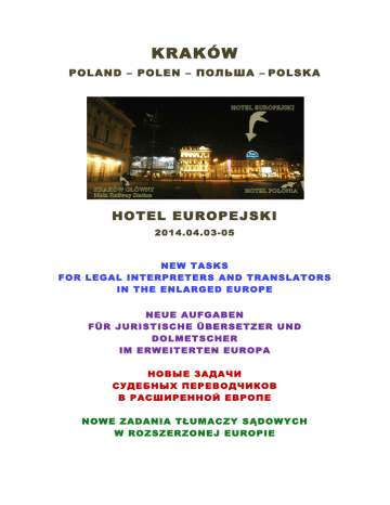 KRAKÓW POLAND – POLEN – ПОЛЬША – POLSKA HOTEL EUROPEJSKI 2014.04.03-05 NEW TASKS FOR LEGAL INTERPRETERS AND TRANSLATORS IN THE ENLARGED EUROPE NEUE AUFGABEN FÜR JURISTISCHE ÜBERSETZER UND DOLMETSCHER IM ERWEITERTEN EUROPA НОВЫЕ ЗАДАЧИ СУДЕБНЫХ ПЕРЕВОДЧИКОВ В РACШИPEННОЙ ЕВРОПЕ NOWE ZADANIA TŁUMACZY SĄDOWYCH W ROZSZERZONEJ EUROPIE HOTEL EUROPEJSKI 31-‐034 Kraków, ul. Lubicz 5 RATES FOR ROOMS RESERVED BY ’TEPIS’ od/from 03.04.2014 do/to 06.04.2014 Reservation valid by 31st January 2014 Room category One night stay Typ pokoju _______________________________________________________ 1-‐osobowy standard Single room 2-‐osobowy standard Double/twin room 2-‐osobowy plus Double/twin plus 3-‐osobowy Triple room Superior Pobyt 1 doba PLN 345 -‐ 20% PLN 385 – 20% PLN 485 – 20% PLN 459 – 20% PLN 545 – 20% Cena zawiera: VAT, śniadanie, saunę Price includes: VAT. breakfast, sauna Opłata lokalna 1,60 PLN /osoba/dzień nie wliczona w cenę pokoju Local tax PLN 1.60/person/day not included in the price of room HOTEL POLONIA 31-‐156 Kraków, ul. Basztowa 25 RESERVATION FORM for rooms booked for ‘TEPIS’ at discounted rates Name of the Guest: ................................................................................................ Arrival date: ........................................... Departure Date: ................................. E-‐mail address: .................................................................................... I hereby ask for reservation (please tick X on the selected option): Hotel: Hotel Polonia Price Single room (price / night) PLN 240 Twin/double room (price / night) PLN 260 Included in the room price 00.00 Room Type: Breakfast: This reservation is guaranteed. In case of no-show and lack of cancellation I agree to charge my credit card as no-show fee (payment for first disused night). Credit card number : ..................................................................................... Exp. date ........................................................................................................ Date and guest signature: ............................................................................. There is a limited number of rooms reserved for Participants of the TEPIS Conference In the Polonia Hotel. Each reservation must be finally confirmed by the Hotel. No-‐cost cancellation must be made till the end of January 2014. Please return the completed form by scan to reservation@hotel-‐polonia.com.pl Phone number +48 12 422 12 33 HOTEL IBIS 31-‐154 Kraków, ul. Pawia 15 RESERVATION FORM for rooms booked for ‘TEPIS’ at discounted rates Name of the Guest: ................................................................................................ Arrival date: ........................................... Departure Date: ................................. E-‐mail address: .................................................................................... I hereby ask for reservation (please tick X on the selected option) : Hotel: Ibis Kraków Stare Miasto Ibis budget Kraków Stare Miasto Single room (price 259pln / night) Single room (price 149pln / night) Twin room (price 293 pln / night) Twin room (price 149pln / night) Included in the room price Breakfast (price 21 pln / person/ night) Room Type: Breakfast: This reservation is guaranteed. In case of no-show and lack of cancellation I agree to charge my credit card as no-show fee (payment for first disused night). Credit card number : ..................................................................................... Exp. date ........................................................................................................ Date and guest signature: ............................................................................. There is a limited number of rooms reserved for Participants of the TEPIS Conference In the Ibis Hotel. Each reservation must be finally confirmed by the Hotel. No-‐cost cancellation must be made before 6 pm on the arrival date Please return the completed form by scan on the below address: Reservation at Ibis Kraków Stare Miasto Hotel: [email protected] Address: ul. Pawia 15, 31-‐154 Kraków, phone number +48 12 355 29 00 Reservation at Ibis Budget Kraków Stare Miasto Hotel: [email protected] Address: ul. Pawia 11, 31-‐154 Kraków, phone number +48 12 355 29 50