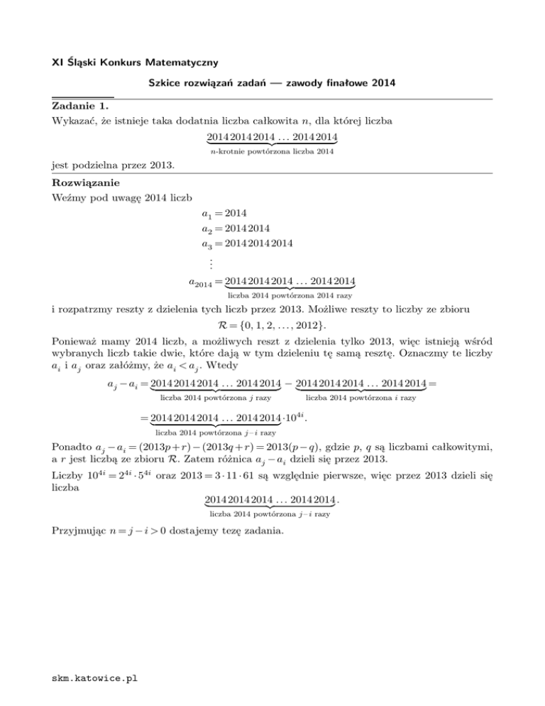 a r jest liczbą ze zbioru R. Zatem różnica aj − ai dzieli się przez 2013.