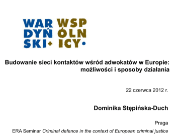 Budowanie sieci kontaktów wśród adwokatów w Europie: możliwości i sposoby działania 22 czerwca 2012 r. Dominika Stępińska-Duch Praga ERA Seminar Criminal defence in the context of European criminal justice Czemu służy networking? wzrost ilości spraw transgranicznych wymóg działania prawnika lokalnego w każdej jurysdykcji, jako gwarancja skutecznej obrony znajomość prawa i obowiązujących zwyczajów oszczędność czasu i środków 2 Dobry i zły networking (+) osobiste kontakty wzajemna rozpoznawalność zaufanie regularne spotkania wymiana doświadczeń możliwość dalszych rekomendacji (-) „yellow” pages brak bezpośredniej komunikacji 3 Komu służy budowanie sieci kontaktów? 1. Prawnikom 2. Obywatelom 4 Organizacje / platformy internetowe Rady Adwokackie CCBE (Council of Bars and Law Societies of Europe) CCBE, European Lawyers Database ECBA (European Criminal Bar Association) ERA (The Academy of European Law) PenalNet Fair Trials International E-Justice Portal IBA (International Bar Association) 5 Rady adwokackie http://www.nra.pl Naczelna Rada Adwokacka Okręgowe Rady Adwokackie 6 CCBE Council of Bars and Law Societies of Europe Rada Adwokatur i Stowarzyszeń Prawniczych Europy http://www.ccbe.eu 1. Polska w CCBE radca prawny Maria Ślązak jako wspólna kandydatka obu polskich samorządów zawodów prawniczych: Krajowej Izby Radców Prawnych oraz Naczelnej Rady Adwokackiej została wybrana na stanowisko Wiceprezydenta Rady Adwokatur i Stowarzyszeń Prawniczych Europy (CCBE). Niebawem zostanie ona Prezydentem CCBE - każdy bowiem nowo wybrany Wiceprezydent będzie pełnił funkcję Prezydenta na członka Komisji Finansowej CCBE został w tym roku powołany Przewodniczący komisji ds. Zagranicznych przy Naczelnej Radzie Adwokackiej adwokat Maciej Łaszczuk 7 European Lawyers Database CCBE 2. Wyszukiwarka internetowa European Lawyers Database narzędzie zamieszczone na stronie internetowej CCBE, służące wyszukiwaniu Rad Adwokackich i Krajowych Izb Radców Prawnych w krajach europejskich i nie tylko 8 European Criminal Bar Association ECBA http://www.ecba.org niezależna organizacja zrzeszająca obrońców europejskich (w ramach krajów Rady Europy) członkostwo płatne newsletter dwie konferencje rocznie „Find a lawyer” (http://www.ecba.org/contactslist/contacts-search-country.php) 9 ERA The Academy of European Law Akademia Prawa Europejskiego https://www.era.int Akademia Prawa Europejskiego to fundacja non-profit, orgaznizująca szkolenia z zakresu prawa europejskiego dla praktykujących prawników 10 PenalNet http://www.penalnet.eu bezpieczna komunikacja mailowa zagwarantowana podpisem elektronicznym, możliwość przesyłania informacji poufnych oraz organizowania multi-video-konferencji z innymi użytkownikami platformy dostępne z zewnątrz informacje elektronicznych zbiorów bibliotecznych ogólne i część PenalNet funkcjonuje zgodnie z inicjatywami Rady Europy oraz z założeniami European Interoperability Framework 11 Fair Trials International http://www.fairtrials.net działania promocyjne na rzecz zapewnienia praw do uczciwego procesu, poprzez kampanie, publikacje, „case examples”, materiały filmowe, warsztaty szkoleniowe strona internetowa Fair Trials International (w językach angielskim, francuskim, niemieckim i hiszpańskim) jest dostępna bezpłatnie 12 E-Justice Portal Europejski portal e-sprawiedliwość https://e-justice.europa.eu portal udostępnia proste definicje oraz linki do odpowiadających im stron internetowych UE oraz do stron samych krajów członkowskich służyć może zarówno ekspertom jak i innym użytkownikom, takim jak np.: obywatele, spółki, zawody prawnicze, sądy. korzystanie z zasobów platformy jest bezpłatne i przetłumaczona jest ona na wszystkie oficjalne języki UE 13 IBA International Bar Association http://www.ibanet.org/ Committees Bussines Crime Criminal Law Human Rights Instuitute Human Rights Law 14 Budowanie sieci kontaktów wśród adwokatów w Europie: możliwości i sposoby działania Dziękuję za uwagę Dominika Stępińska-Duch Aleje Ujazdowskie 10, 00-478 Warszawa tel.: 22 437 82 00, 22 537 82 00 e-mail: [email protected]