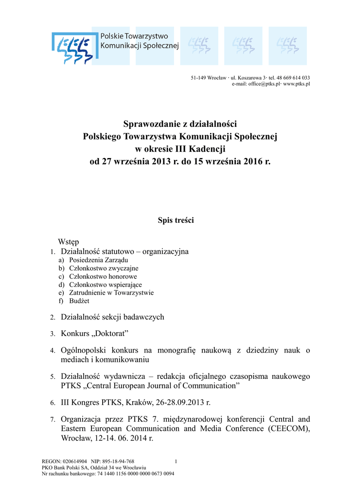 51-149 Wrocław · ul. Koszarowa 3· tel. 48 669 614 033 e-mail: [email protected]· www.ptks.pl Sprawozdanie z działalności Polskiego Towarzystwa Komunikacji Społecznej w okresie III Kadencji od 27 września 2013 r. do 15 września 2016 r. Spis treści Wstęp 1. Działalność statutowo – organizacyjna a) b) c) d) e) f) Posiedzenia Zarządu Członkostwo zwyczajne Członkostwo honorowe Członkostwo wspierające Zatrudnienie w Towarzystwie Budżet 2. Działalność sekcji badawczych 3. Konkurs „Doktorat” 4. Ogólnopolski konkurs na monografię naukową z dziedziny nauk o mediach i komunikowaniu 5. Działalność wydawnicza – redakcja oficjalnego czasopisma naukowego PTKS „Central European Journal of Communication” 6. III Kongres PTKS, Kraków, 26-28.09.2013 r. 7. Organizacja przez PTKS 7. międzynarodowej konferencji Central and Eastern European Communication and Media Conference (CEECOM), Wrocław, 12-14. 06. 2014 r. REGON: 020614904 NIP: 895-18-94-768 1 PKO Bank Polski SA, Oddział 34 we Wrocławiu Nr rachunku bankowego: 74 1440 1156 0000 0000 0673 0094 51-149 Wrocław · ul. Koszarowa 3· tel. 48 669 614 033 e-mail: [email protected]· www.ptks.pl 8. Współpraca międzynarodowa a) Central and Eastern European Communication (CEECOM) b) International Communication Association (ICA) c) European Communication Research and Education Association (ECREA) d) International Federation of Communication Association (IFCA e) National Association of Mass Media Researchers (NAMMI) 9. Uczestnictwo PTKS w konferencjach międzynarodowych a) 64. Kongres International Communication Association (ICA), Seattle (USA), 22-26.05.2014 r. b) Konferencja European Communication Research and Education Association (ECREA), Lizbona (Portugalia), 12-15.11.2014 r. c) Regionalna Konferencja International Communication Association (ICA), Łódź (Polska), 9-11.04.2015 r. d) 65. Kongres International Communication Association (ICA), San Juan (Puerto Rico), 21-25.05.2015 r. e) 8. Central and Eastern European Communication and Media Conference (CEECOM), Zagrzeb (Chorwacja), 12-14.06.2015 r. f) 66. Kongres International Communication Association (ICA), Fukuoka (Japonia) 9-13.06.2016 r. g) 9. Central and Eastern European Communication and Media Conference (CEECOM), Tartu (Estonia), 16-18.06.2016 r. 10. Udział PTKS w konferencjach krajowych oraz patronaty PTKS nad konferencjami naukowymi 11. Pozostałe inicjatywy i obszary działania Towarzystwa a) Monitorowanie rynku wydawniczego w zakresie nauki o komunikowaniu b) Dotacje na wsparcie działalności c) Patronat honorowy PTKS nad ogólnopolskim konkursem na najlepszą pracę magisterską z wiedzy o mediach Medi@stery d) Współpraca z innymi instytucjami i organizacjami e) Funkcjonowanie Systemu Identyfikacji Wizualnej i strony internetowej REGON: 020614904 NIP: 895-18-94-768 2 PKO Bank Polski SA, Oddział 34 we Wrocławiu Nr rachunku bankowego: 74 1440 1156 0000 0000 0673 0094 51-149 Wrocław · ul. Koszarowa 3· tel. 48 669 614 033 e-mail: [email protected]· www.ptks.pl Wstęp Polskie Towarzystwo Komunikacji Społecznej zostało powołane 22 kwietnia 2007 r. we Wrocławiu na Walnym Zjeździe Założycielskim. Wybrano wówczas Zarząd I Kadencji, który działał do 15 września 2010 r. W dniu 16 września 2010 r. podczas II Zjazdu PTKS w Lublinie udzielono absolutorium Zarządowi I Kadencji i wybrano Zarząd II Kadencji na okres od 16 września 2010 r. do 27 września 2013 r. 27 września 2013 r. podczas III Walnego Zjazdu Wyborczego PTKS udzielono absolutorium Zarządowi II Kadencji i wybrano Zarząd III Kadencji PTKS na okres od 27 września 2013 r. do 15 września 2016 r. w składzie 9osobowym: prof. dr hab. Iwona Hofman (Uniwersytet Marii Curie-Skłodowskiej w Lublinie) Prezes, prof. UŚ, dr hab. Zbigniew Oniszczuk (Uniwersytet Śląski w Katowicach) – Wiceprezes, prof. dr hab. Bogusława Dobek-Ostrowska (Uniwersytet Wrocławski) - Redaktor „Central European Journal of Communication”, ks. prof. UPJPII, dr hab. Michał Drożdż (Uniwersytet Papieski Jana Pawła II w Krakowie) - Skarbnik, dr Małgorzata Adamik-Szysiak (Uniwersytet Marii Curie-Skłodowskiej w Lublinie) - Sekretarz oraz Członkowie: prof. UAM, dr hab. Dorota Piontek (Uniwersytet im. Adama Mickiewicza w Poznaniu), prof. UW, dr hab. Alicja Jaskiernia (Uniwersytet Warszawski), prof. UAM, dr hab. Agnieszka Stępińska (Uniwersytet im. Adama Mickiewicza w Poznaniu), dr hab. Małgorzata Lisowska-Magdziarz (Uniwersytet Jagielloński). W skład Komisji Rewizyjnej PTKS w wyniku wyborów, które odbyły się również podczas III Walnego Zjazdu Wyborczego weszli: prof. SGH, dr hab. Małgorzata MolędaZdziech (Szkoła Główna Handlowa w Warszawie) - Przewodnicząca oraz Członkowie: dr Michał Kuś (Uniwersytet Wrocławski), dr Bartłomiej Łódzki (Dolnośląska Szkoła Wyższa, Wrocław), dr Mirosława Wielopolska-Szymura (Uniwersytet Śląski w Katowicach) oraz dr Teresa Sławińska (Uniwersytet Jagielloński). W wyżej wymienionym składzie Zarząd i Komisja Rewizyjna pracowały przez pełną III Kadencję. Zasady i zakres działania Towarzystwa określa Statut PTKS. Aktywność Towarzystwa ma na celu przede wszystkim integrację środowiska badaczy i praktyków komunikowania, REGON: 020614904 NIP: 895-18-94-768 3 PKO Bank Polski SA, Oddział 34 we Wrocławiu Nr rachunku bankowego: 74 1440 1156 0000 0000 0673 0094 51-149 Wrocław · ul. Koszarowa 3· tel. 48 669 614 033 e-mail: [email protected]· www.ptks.pl uporządkowanie obszaru studiów nad komunikowaniem i mediami w Polsce, podniesienie ich rangi i poziomu oraz współpracę z podobnymi towarzystwami krajowymi i zagranicznymi. 1. Działalność statutowo-organizacyjna a) Posiedzenia Zarządu W okresie III Kadencji Zarząd Towarzystwa spotykał się regularnie na posiedzeniach, których łącznie odbyło się trzynaście: w 2013 r. – jedno, w 2014 r. – pięć, w 2015 r.– cztery, w 2016 r. – trzy. I Posiedzenie Zarządu PTKS III