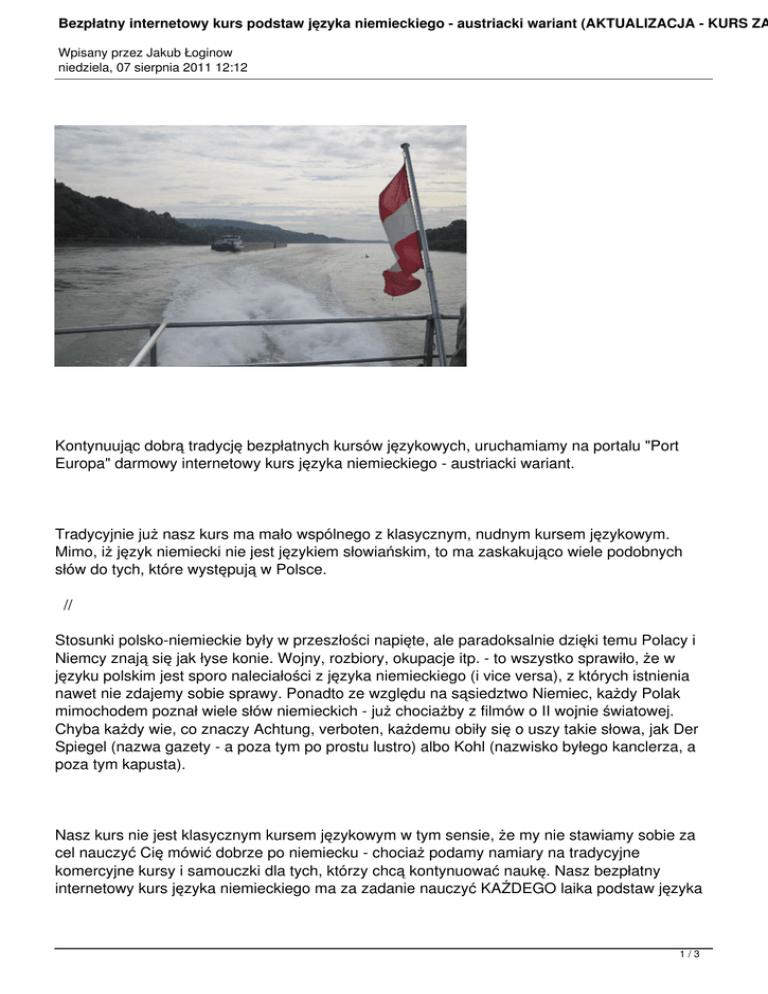 Bezpłatny internetowy kurs podstaw języka niemieckiego - austriacki wariant (AKTUALIZACJA - KURS ZA Wpisany przez Jakub Łoginow niedziela, 07 sierpnia 2011 12:12 Kontynuując dobrą tradycję bezpłatnych kursów językowych, uruchamiamy na portalu "Port Europa" darmowy internetowy kurs języka niemieckiego - austriacki wariant. Tradycyjnie już nasz kurs ma mało wspólnego z klasycznym, nudnym kursem językowym. Mimo, iż język niemiecki nie jest językiem słowiańskim, to ma zaskakująco wiele podobnych słów do tych, które występują w Polsce. // Stosunki polsko-niemieckie były w przeszłości napięte, ale paradoksalnie dzięki temu Polacy i Niemcy znają się jak łyse konie. Wojny, rozbiory, okupacje itp. - to wszystko sprawiło, że w języku polskim jest sporo naleciałości z języka niemieckiego (i vice versa), z których istnienia nawet nie zdajemy sobie sprawy. Ponadto ze względu na sąsiedztwo Niemiec, każdy Polak mimochodem poznał wiele słów niemieckich - już chociażby z filmów o II wojnie światowej. Chyba każdy wie, co znaczy Achtung, verboten, każdemu obiły się o uszy takie słowa, jak Der Spiegel (nazwa gazety - a poza tym po prostu lustro) albo Kohl (nazwisko byłego kanclerza, a poza tym kapusta). Nasz kurs nie jest klasycznym kursem językowym w tym sensie, że my nie stawiamy sobie za cel nauczyć Cię mówić dobrze po niemiecku - chociaż podamy namiary na tradycyjne komercyjne kursy i samouczki dla tych, którzy chcą kontynuować naukę. Nasz bezpłatny internetowy kurs języka niemieckiego ma za zadanie nauczyć KAŻDEGO laika podstaw języka 1/3 Bezpłatny internetowy kurs podstaw języka niemieckiego - austriacki wariant (AKTUALIZACJA - KURS ZA Wpisany przez Jakub Łoginow niedziela, 07 sierpnia 2011 12:12 niemieckiego, wykorzystując te podobieństwa oraz różne intuicyjne słowa i zwroty. Sam się zdziwisz, jak wiele wiesz już teraz, zanim jeszcze nie zacząłeś nauki! Po ukończeniu naszego kursu nie będziesz co prawda jeszcze mówić po niemiecku, z wyjątkiem prostych sytuacji - np. będziesz umiał kupić kebaba, zapytać o drogę, zrobić zakupy w sklepie. Ale przede wszystkim nauczymy cię ROZUMIEĆ język niemiecki. Dzięki naszemu kursowi, gdy już pojedziesz na wycieczkę do Austrii, będziesz zasadniczo porozumiewać się np. po angielsku, ale przynajmniej będziesz mieć ten komfort, że będziesz rozumiał otaczające Cię zewsząd niemieckie napisy, wyłapiesz ogólny sens komunikatów, a nawet będziesz rozumieć, o czym piszą w gazecie (ale tylko w tabloidach, gdzie używa się prostego języka). Filozofia naszego kursu - to nauka jako hobby, połączona z poznawaniem realiów i zwyczajów AUSTRII. Wychodzimy z założenia, że nie każdy musi znać język niemiecki - to nie jest łatwe, ale KAŻDY, również TY, może bardzo łatwo i w przyjemny sposób poznać podstawy tego języka, który chcąc nie chcąc jest i tak obecny w życiu Europy Środkowej. Zapisując się na kurs, wyrażasz automatycznie zgodę na dopisanie Twojego adresu do newslettera portalu "Port Europa", zgodnie z naszą polityką prywatności. Newsletter i kurs są wysyłane z innych systemów - z newslettera możesz w każdej chwili zrezygnować, korzystając z linka rezygnacji umieszczonego w każdym mailingu, co nie oznacza rezygnacji z kursu (i vice versa). AKTUALIZACJA 6.10.2016 W związku z wprowadzeniem opłat przez Freebot.pl od 15 października, zmuszeni jesteśmy zawiesić dalsze funkcjonowanie kursu w formacie bezpłatnym. Środki na opłacenie systemu do rozsyłki lekcji nie są co prawda duże i w normalnych warunkach spokojnie dalibyśmy radę je pokryć z wpływów z reklam Google Adsense, uzyskiwanych dzięki osobom odwiedzającym nasz portal. Niestety, od kilku lat polscy internauci wpadają na "genialny" ich zdaniem pomysł, by włączać na swoim komputerze lub telefonie program do blokowania reklam typu Adblock, który sprawia, że mimo ogromnego ruchu na stronie nie otrzymujemy z tego tytułu nawet tych skromnych 27 zł/mies. które są potrzebne do obsługi danego kursu. Wskutek tego, zapisy na kurs zostają zawieszone do odwołania. Mamy nadzieję, że uda się je wznowić jeszcze przed końcem 2016 roku. 2/3 Bezpłatny internetowy kurs podstaw języka niemieckiego - austriacki wariant (AKTUALIZACJA - KURS ZA Wpisany przez Jakub Łoginow niedziela, 07 sierpnia 2011 12:12 Stanie się tak jeśli zostanie spełniony jeden z dwóch warunków: - dzięki systemowi dobrowolnych wpłat od użytkowników uda się uzyskać przynajmniej 300 zł/mies. na pokrycie minimalnych stałych kosztów naszej działalności, np. opłat za hosting naszych bezpłatnych kursów internetowych - użytkownicy przestaną stosować program do blokowania reklam przynajmniej w odniesieniu do naszej strony. Żeby nie zostać źle zrozumianym: 27 zł/miesięcznie nie jest problemem i dlatego właściciel portalu z własnej kieszeni wyłoży tę kwotę na dalsze istnienie trzech kursów: języka polskiego dla Ukraińców, języka ukraińskiego dla Polaków i języka polskiego dla Słowaków. To już 81 zł/mies. Kursów jest jednak o wiele więcej i kosztu ich hostingowania nie może ponosić jedna osoba. Mam nadzieję, że wkrótce uda się znaleźć sposób wyjścia z tej sytuacji. Jakub Łoginow Więcej: Lubisz nasz portal? Nie blokuj reklam! Port Europa – sześć lat minęło. Co dalej? Dowiedz się, jak wesprzeć nasz portal 3/3