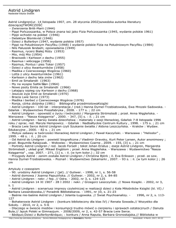 Astrid Lindgren Nadesłał Edyta Dobek Astrid Lindgren(ur. 14 listopada 1907, zm. 28 stycznia 2002)szwedzka autorka literatury dziecięcejTWÓRCZOŚĆ - Zwierzenia Britt-Marii (1944) - Pippi Pończoszanka, w Polsce znana też jako Fizia Pończoszanka (1945, wydanie polskie 1961) - Pippi wchodzi na pokład (1946) - Detektyw Blomkvist (1946) - Dzieci z Bullerbyn (1947, wydanie polskie 1957) - Pippi na Południowym Pacyfiku (1948) I wydanie polskie Fizia na Południowym Pacyfiku (1984) - Nils Paluszek – opowiadania (1949) - Rasmus, rycerz Białej Róży (1953) - Mio, mój Mio (1954) - Braciszek i Karlsson z dachu (1955) - Rasmus i włóczęga (1956) - Rasmus, Pontus i pies Toker (1957) - Dzieci z ulicy Awanturników (1958) - Madika z Czerwcowego Wzgórza (1960) - Lotta z ulicy Awanturników (1961) - Karlsson z dachu lata znów (1962) - Emil ze Smalandii (1963) - My na wyspie Saltkråkan (1964) - Nowe psoty Emila ze Smalandii (1966) - Latający szpieg czy Karlsson z dachu (1968) - Jeszcze żyje Emil ze Smalandii (1970) - Bracia Lwie Serce (1973) - Madika i berbeć z Czerwcowego Wzgórza (1976) - Ronja, córka zbójnika (1981) Bibliografia przedmiotowaKsiążki - Astrid Lindgren - 100 lat : interpretacje / (red.) Hanna Dymel-Trzebiatowska, Ewa Mrozek-Sadowska. Gdańsk : Wydawnictwo Pressfabryka , 2008. - 177 s. ; 22 cm - Astrid Lindgren : opowieść o życiu i twórczości / Margareta Strömstedt ; przeł. Anna Węgleńska. Warszawa : "Nasza Księgarnia" , 2000. - 347, [5] s. : il. ; 21 cm - Astrid Lindgren - barwy świata dzieciństwa : materiały z sesji literackiej, Gdańsk 7-8 listopada 1996 roku / oprac. red. Maryla Hempowicz. - Gdańsk : Nadbałtyckie Centrum Kultury , 1998. - 175 s. ; 21 cm - Bracia Lwie Serce Astrid Lindgren czyli Szukanie światła / Aldona Leszczyńska. - Kraków : Wydaw. Edukacyjne , 2000. - 82 s. ; 21 cm - Motyw zabawy w twórczości literackiej Astrid Lindgren / Paweł Kaczyński. - Warszawa : "Heliodor" , 1999. - 48 s. : il. ; 20 cm - Od Astrid do Lindgren : powieść biograficzna / Vladimir Oravsky, Kurt Peter Larsen, Autor anonimowy ; przeł. Bogumiła Ratajczak. - Wołowiec : Wydawnictwo Czarne , 2009. - 155, [3] s. ; 21 cm - Portrety Astrid Lindgren / red. Jacob Forsell ; tekst Johan Erséus ; eseje Astrid Lindgren, Margareta Strömstedt ; układ graf. Mikael Engblom ; przeł. Anna Węgleńska. - Warszawa : Wydawnictwo "Nasza Księgarnia" , cop. 2007. - 271, [1] s. : il. (w tym kolor.) ; 32 cm - Przygody Astrid : zanim została Astrid Lindgren / Christina Björk ; il. Eva Eriksson ; przeł. ze szw. Hanna Dymel-Trzebiatowska. - Poznań : Wydawnictwo Zakamarki , 2007. - 93 s. : il. (w tym kolor.) ; 26 cm Artykuły z czasopism - 90. urodziny Astrid Lindgren / (jel). // Guliwer. - 1998, nr 1, s. 56-58 - Astrid domowa / Joanna Papuzińska. // Guliwer. - 2002, nr 2, s. 84-85 - Astrid Lindgren : nekr. / fep. // Odra. - 2002, nr 3, s. 124-125 - Astrid Lindgren 14 XI 1907 - 28 I 2002 : nekr. / Grzegorz Leszczyński. // Nowe Książki. - 2002, nr 3, s. 1 - Astrid Lindgren : scenariusz imprezy czytelniczej w realizacji dzieci z Koła Miłośników Książki (kl. VI) / Barbara Lewandowska.// Poradnik Bibliotekarza. - 1991, nr 10, s. 21-23 - Baśnie nie-baśnie Astrid Lindgren / Jolanta Ługowska. // Świat Psychoanalizy. 1996, nr 2, s. 113127 - Bohaterowie Astrid Lindgren : (konkurs biblioteczny dla klas IV) / Renata Sowada.// Wszystko dla Szkoły. - 2010, nr 2, s. 5-6 - Dlaczego w świecie mediów i konsumpcji trudno mówić o cierpieniu i sprawach ostatecznych / Danuta Bula.// Język Polski w Gimnazjum. - 2008/2009, nr 2, s. 42-57 Bracia Lwie Serce. - „Dzieci z Bullerbyn” : konkurs / Anna Raputa, Barbara Gronostajska.// Biblioteka w http://www.bp.ostroleka.pl/testowy - Serwis Biblioteki Pedagogicznej w Ostrołęce Powered by Mambo Generated: 4 March, 2017, 00:22 Szkole. - 1993, nr 5, s. 21-22 - "Dzieci z Bullerbyn" - test ze znajomości lektury / Dorota Zbisławska.// Wszystko dla Szkoły. - 2010, nr 2, s. 7 - "Dzieci z Bullerbyn" A. Lindgren / Beata Szczodrak.// Nauczanie Początkowe. - 1993/1994, nr 6, s. 9095 - Dzieciństwo Astrid Lindgren / Wirginia Borodzicz.// Wychowanie w Przedszkolu. - 2008, nr 4, s. 13-17 - Dziękuję, że pani opromieniła jedno smutne dzieciństwo / Katarzyna Szewczyk. // Polonistyka. - 2002, nr 10, s. 612-614 - Katla - interpretacje, reinterpretacje, nadinterpretacje : analiza motywu smoka w "Braciach Lwie Serce" Astrid Lindgren / Hanna Dymel-Trzebiatowska. // Guliwer. - 2010, nr 1, s. 36-42 - Kłopoty z bajką / Julia Hartwig. Miejsce przy oknie // Więź. - 2004, nr 4, s. 139-147 Twórczość A. Lindgren. - Kocie piosenki Astrid Lindgren : o spotkaniach z kotem w wymiarze przekładu / Hanna DymelTrzebiatowska. // Guliwer. - 2009, nr 3, s. 21-26 - Lasse nie chce spać / Mrav. // Guliwer. - 2010, nr 1, s. 113-115 Zawiera rec. książki: Ja nie chcę iść spać / Astrid Lindgren. - Poznań, 2009. - Marcuse w dwubarwnych pończoszkach / Katarzyna Chmielewska. // Bez Dogmatu. - 2004, Nr 60, s. 19-20 - Międzyszkolny konkurs o Pipi Langstrump / Dorota Grząba.// Biblioteka w Szkole. - 2007, nr 3, s. 16-17 - "Mio, mój Mio" - biblioterapia dla wątpiących / Danuta Gierczak. // Guliwer. - 2005, nr 4, s. 76-77 Zawiera rec. książki: Mio, mój Mio / Astrid Lindgren. - Warszawa, 2005. - Motyw zabawy w twórczości literackiej Astrid Lindgren / Paweł Kaczyński. // Kultura Fizyczna. 2000, nr 1/2, s. 22-25 - Nazwy barw jako sposób kreowania świata w książce Astrid Lindgren "Mio, mój Mio" / Ewa TeodorowiczHellman. // Świat Psychoanalizy. - 1996, nr 2, s. 94-112 - Nie chrońmy kanionów przed wichurami : kilka słów o fantasy terapii / Hanna Dybel-Trzebiatowska. // Guliwer. - 2003, nr 4, s. 12-15 - Nordycki kwartet baśniowy / Riitta Kuivasmäki ; tł. Ewa Świerżewska. // Guliwer. - 2002, nr 4, s. 5-12 Hans Christian Andersen, Tove Jansson, Astrid Lindgren, Zacharias Topelius - O smutku z optymizmem / Izabela Mikrut. // Guliwer. - 20
