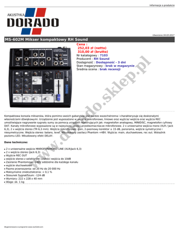 Informacje o produkcie Utworzono 04-03-2017 MS-602M Mikser kompaktowy RH Sound Cena : 252,03 zł (netto) 310,00 zł (brutto) .d or ad o. sk le p. p l Nr katalogowy : 7103 Producent : RH Sound Dostępność : Dostępność - 3 dni Stan magazynowy : brak w magazynie Średnia ocena : brak recenzji Kompaktowa konsola mikserska, która pomimo swoich gabarytów jest bardzo wszechstronna i charakteryzuje się doskonałymi własnościami dźwiękowymi. Urządzenie jest wyposażone w wejścia mikrofonowe, liniowe oraz wyjścia/ wejścia oraz wyjścia REC umożliwiające nagrywanie sygnału sumy za pomocą urządzeń rejestrujących jak: magnetofon analogowy, MINIDISC, magnetofon cyfrowy DAT. Kanały mikrofonowe wyposażone są w najwyższej jakości przedwzmacniacze mikrofonowe. 2 x uniwersalne wejścia mono (XLR / Jack 6,3), 2 x wejścia stereo (TR 6,3 mm). Wejścia mikrofonowe: gain, 2-pasmowy korektor ± 15 dB, panorama, wejście symetryczne i niesymetryczne. Wejścia stereo: balans, level. Wbudowany zasilacz Phantom +48V. Wyjścia: main, słuchawkowe, rec out. Wskaźnik poziomu LED. Wbudowany efekt DELAY. ■ ■ ■ ■ ■ ■ ■ ■ ■ 2 x uniwersalne wejście MIKROFON/MONO LINE (XLR/Jack 6,3) 2 x wejścia stereo (Jack 6,3) Wyjście REC OUT wejście stereo z selektorem czułości wejścia do 10dB Zasilanie Phantomowe +48V oddzielne dla każdego kanału wyjście słuchawkowe Pasmo przenoszenia: od 20 Hz do 20 000 Hz Maksymalne zniekształcenia: < 0,1 % Stosunek Sygnał/Szum: -124 dB Wymiary: 222 x 228 x 40 mm Waga: ok. 1 kg w ■ w ■ w Dane techniczne: Wygenerowano w programie www.oscGold.com