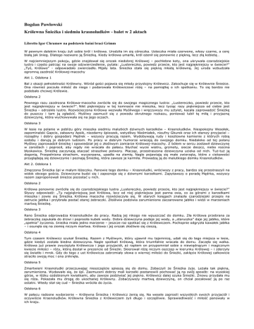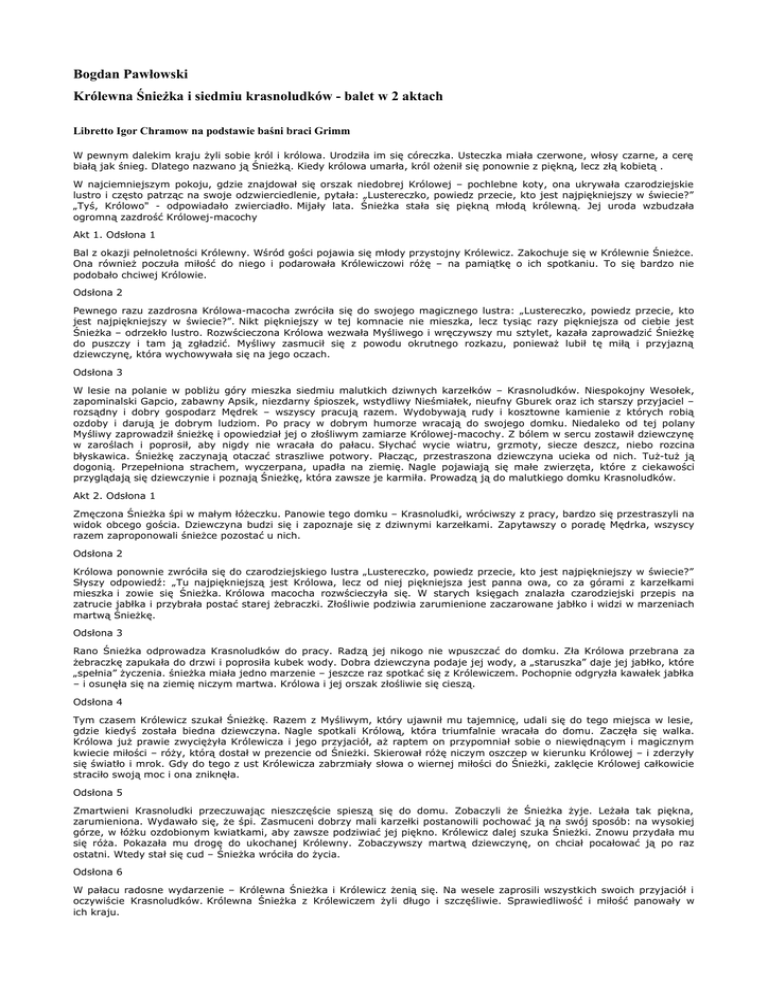Bogdan Pawłowski Królewna Śnieżka i siedmiu krasnoludków - balet w 2 aktach Libretto Igor Chramow na podstawie baśni braci Grimm W pewnym dalekim kraju żyli sobie król i królowa. Urodziła im się córeczka. Usteczka miała czerwone, włosy czarne, a cerę białą jak śnieg. Dlatego nazwano ją Śnieżką. Kiedy królowa umarła, król ożenił się ponownie z piękną, lecz złą kobietą . W najciemniejszym pokoju, gdzie znajdował się orszak niedobrej Królowej – pochlebne koty, ona ukrywała czarodziejskie lustro i często patrząc na swoje odzwierciedlenie, pytała: „Lustereczko, powiedz przecie, kto jest najpiękniejszy w świecie?” „Tyś, Królowo" - odpowiadało zwierciadło. Mijały lata. Śnieżka stała się piękną młodą królewną. Jej uroda wzbudzała ogromną zazdrość Królowej-macochy Akt 1. Odsłona 1 Bal z okazji pełnoletności Królewny. Wśród gości pojawia się młody przystojny Królewicz. Zakochuje się w Królewnie Śnieżce. Ona również poczuła miłość do niego i podarowała Królewiczowi różę – na pamiątkę o ich spotkaniu. To się bardzo nie podobało chciwej Królowie. Odsłona 2 Pewnego razu zazdrosna Królowa-macocha zwróciła się do swojego magicznego lustra: „Lustereczko, powiedz przecie, kto jest najpiękniejszy w świecie?”. Nikt piękniejszy w tej komnacie nie mieszka, lecz tysiąc razy piękniejsza od ciebie jest Śnieżka – odrzekło lustro. Rozwścieczona Królowa wezwała Myśliwego i wręczywszy mu sztylet, kazała zaprowadzić Śnieżkę do puszczy i tam ją zgładzić. Myśliwy zasmucił się z powodu okrutnego rozkazu, ponieważ lubił tę miłą i przyjazną dziewczynę, która wychowywała się na jego oczach. Odsłona 3 W lesie na polanie w pobliżu góry mieszka siedmiu malutkich dziwnych karzełków – Krasnoludków. Niespokojny Wesołek, zapominalski Gapcio, zabawny Apsik, niezdarny śpioszek, wstydliwy Nieśmiałek, nieufny Gburek oraz ich starszy przyjaciel – rozsądny i dobry gospodarz Mędrek – wszyscy pracują razem. Wydobywają rudy i kosztowne kamienie z których robią ozdoby i darują je dobrym ludziom. Po pracy w dobrym humorze wracają do swojego domku. Niedaleko od tej polany Myśliwy zaprowadził śnieżkę i opowiedział jej o złośliwym zamiarze Królowej-macochy. Z bólem w sercu zostawił dziewczynę w zaroślach i poprosił, aby nigdy nie wracała do pałacu. Słychać wycie wiatru, grzmoty, siecze deszcz, niebo rozcina błyskawica. Śnieżkę zaczynają otaczać straszliwe potwory. Płacząc, przestraszona dziewczyna ucieka od nich. Tuż-tuż ją dogonią. Przepełniona strachem, wyczerpana, upadła na ziemię. Nagle pojawiają się małe zwierzęta, które z ciekawości przyglądają się dziewczynie i poznają Śnieżkę, która zawsze je karmiła. Prowadzą ją do malutkiego domku Krasnoludków. Akt 2. Odsłona 1 Zmęczona Śnieżka śpi w małym łóżeczku. Panowie tego domku – Krasnoludki, wróciwszy z pracy, bardzo się przestraszyli na widok obcego gościa. Dziewczyna budzi się i zapoznaje się z dziwnymi karzełkami. Zapytawszy o poradę Mędrka, wszyscy razem zaproponowali śnieżce pozostać u nich. Odsłona 2 Królowa ponownie zwróciła się do czarodziejskiego lustra „Lustereczko, powiedz przecie, kto jest najpiękniejszy w świecie?” Słyszy odpowiedź: „Tu najpiękniejszą jest Królowa, lecz od niej piękniejsza jest panna owa, co za górami z karzełkami mieszka i zowie się Śnieżka. Królowa macocha rozwścieczyła się. W starych księgach znalazła czarodziejski przepis na zatrucie jabłka i przybrała postać starej żebraczki. Złośliwie podziwia zarumienione zaczarowane jabłko i widzi w marzeniach martwą Śnieżkę. Odsłona 3 Rano Śnieżka odprowadza Krasnoludków do pracy. Radzą jej nikogo nie wpuszczać do domku. Zła Królowa przebrana za żebraczkę zapukała do drzwi i poprosiła kubek wody. Dobra dziewczyna podaje jej wody, a „staruszka” daje jej jabłko, które „spełnia” życzenia. śnieżka miała jedno marzenie – jeszcze raz spotkać się z Królewiczem. Pochopnie odgryzła kawałek jabłka – i osunęła się na ziemię niczym martwa. Królowa i jej orszak złośliwie się cieszą. Odsłona 4 Tym czasem Królewicz szukał Śnieżkę. Razem z Myśliwym, który ujawnił mu tajemnicę, udali się do tego miejsca w lesie, gdzie kiedyś została biedna dziewczyna. Nagle spotkali Królową, która triumfalnie wracała do domu. Zaczęła się walka. Królowa już prawie zwyciężyła Królewicza i jego przyjaciół, aż raptem on przypomniał sobie o niewiędnącym i magicznym kwiecie miłości – róży, którą dostał w prezencie od Śnieżki. Skierował różę niczym oszczep w kierunku Królowej – i zderzyły się światło i mrok. Gdy do tego z ust Królewicza zabrzmiały słowa o wiernej miłości do Śnieżki, zaklęcie Królowej całkowicie straciło swoją moc i ona zniknęła. Odsłona 5 Zmartwieni Krasnoludki przeczuwając nieszczęście spieszą się do domu. Zobaczyli że Śnieżka żyje. Leżała tak piękna, zarumieniona. Wydawało się, że śpi. Zasmuceni dobrzy mali karzełki postanowili pochować ją na swój sposób: na wysokiej górze, w łóżku ozdobionym kwiatkami, aby zawsze podziwiać jej piękno. Królewicz dalej szuka Śnieżki. Znowu przydała mu się róża. Pokazała mu drogę do ukochanej Królewny. Zobaczywszy martwą dziewczynę, on chciał pocałować ją po raz ostatni. Wtedy stał się cud – Śnieżka wróciła do życia. Odsłona 6 W pałacu radosne wydarzenie – Królewna Śnieżka i Królewicz żenią się. Na wesele zaprosili wszystkich swoich przyjaciół i oczywiście Krasnoludków. Królewna Śnieżka z Królewiczem żyli długo i szczęśliwie. Sprawiedliwość i miłość panowały w ich kraju.