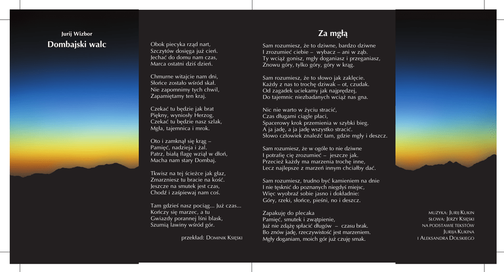 Za mgłą Jurij Wizbor Dombajski walc Obok piecyka rząd nart, Szczytów dosięga już cień. Jechać do domu nam czas, Marca ostatni dziś dzień. Sam rozumiesz, że to dziwne, bardzo dziwne I zrozumieć ciebie – wybacz – ani w ząb. Ty wciąż gonisz, mgły doganiasz i przeganiasz, Znowu góry, tylko góry, góry w krąg. Chmurne witajcie nam dni, Słońce zostało wśród skał. Nie zapomnimy tych chwil, Zapamiętamy ten kraj. Sam rozumiesz, że to słowo jak zaklęcie. Każdy z nas to trochę dziwak – ot, czudak. Od zagadek uciekamy jak najprędzej, Do tajemnic niezbadanych wciąż nas gna. Czekać tu będzie jak brat Piękny, wyniosły Herzog. Czekać tu będzie nasz szlak, Mgła, tajemnica i mrok. Nic nie warto w życiu stracić, Czas długami ciągle płaci, Spacerowy krok przemienia w szybki bieg. A ja jadę, a ja jadę wszystko stracić. Słowo człowiek znaleźć tam, gdzie mgły i deszcz. Oto i zamknął się krąg – Pamięć, nadzieja i żal. Patrz, białą flagę wziął w dłoń, Macha nam stary Dombaj. Tkwisz na tej ścieżce jak głaz, Zmarzniesz tu bracie na kość. Jeszcze na smutek jest czas, Chodź i zaśpiewaj nam coś. Tam gdzieś nasz pociąg... Już czas... Kończy się marzec, a tu Gwiazdy porannej lśni blask, Szumią lawiny wśród gór. przekład: DOMINIK KSIĘSKI Sam rozumiesz, że w ogóle to nie dziwne I potrafię cię zrozumieć – jeszcze jak. Przecież każdy ma marzenia trochę inne, Lecz najlepsze z marzeń innym chciałby dać. Sam rozumiesz, trudno być kamieniem na dnie I nie tęsknić do poznanych niegdyś miejsc, Więc wyobraź sobie jasno i dokładnie: Góry, rzeki, słońce, pieśni, no i deszcz. Zapakuję do plecaka Pamięć, smutek i zwątpienie, Już nie zdążę spłacić długów – czasu brak. Bo znów jadę, rzeczywistość jest marzeniem. Mgły doganiam, moich gór już czuję smak. MUZYKA: JURIJ KUKIN SŁOWA: JERZY KSIĘSKI NA PODSTAWIE TEKSTÓW I JURIJA KUKINA ALEKSANDRA DOLSKIEGO