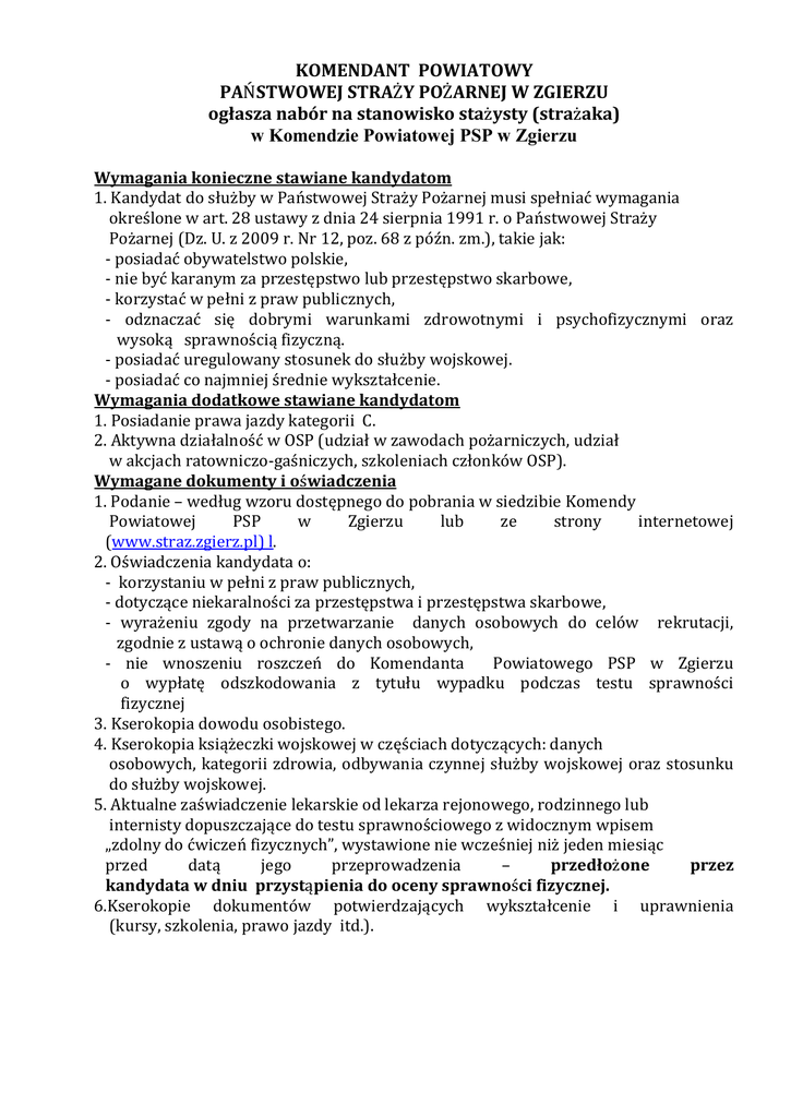KOMENDANT POWIATOWY PAŃSTWOWEJ STRAŻY POŻARNEJ W ZGIERZU ogłasza nabór na stanowisko stażysty (strażaka) w Komendzie Powiatowej PSP w Zgierzu Wymagania konieczne stawiane kandydatom 1. Kandydat do służby w Państwowej Straży Pożarnej musi spełniać wymagania określone w art. 28 ustawy z dnia 24 sierpnia 1991 r. o Państwowej Straży Pożarnej (Dz. U. z 2009 r. Nr 12, poz. 68 z późn. zm.), takie jak: - posiadać obywatelstwo polskie, - nie być karanym za przestępstwo lub przestępstwo skarbowe, - korzystać w pełni z praw publicznych, - odznaczać się dobrymi warunkami zdrowotnymi i psychofizycznymi oraz wysoką sprawnością fizyczną. - posiadać uregulowany stosunek do służby wojskowej. - posiadać co najmniej średnie wykształcenie. Wymagania dodatkowe stawiane kandydatom 1. Posiadanie prawa jazdy kategorii C. 2. Aktywna działalność w OSP (udział w zawodach pożarniczych, udział w akcjach ratowniczo-gaśniczych, szkoleniach członków OSP). Wymagane dokumenty i oświadczenia 1. Podanie – według wzoru dostępnego do pobrania w siedzibie Komendy Powiatowej PSP w Zgierzu lub ze strony internetowej (www.straz.zgierz.pl) l. 2. Oświadczenia kandydata o: - korzystaniu w pełni z praw publicznych, - dotyczące niekaralności za przestępstwa i przestępstwa skarbowe, - wyrażeniu zgody na przetwarzanie danych osobowych do celów rekrutacji, zgodnie z ustawą o ochronie danych osobowych, - nie wnoszeniu roszczeń do Komendanta Powiatowego PSP w Zgierzu o wypłatę odszkodowania z tytułu wypadku podczas testu sprawności fizycznej 3. Kserokopia dowodu osobistego. 4. Kserokopia książeczki wojskowej w częściach dotyczących: danych osobowych, kategorii zdrowia, odbywania czynnej służby wojskowej oraz stosunku do służby wojskowej. 5. Aktualne zaświadczenie lekarskie od lekarza rejonowego, rodzinnego lub internisty dopuszczające do testu sprawnościowego z widocznym wpisem „zdolny do ćwiczeń fizycznych”, wystawione nie wcześniej niż jeden miesiąc przed datą jego przeprowadzenia – przedłożone przez kandydata w dniu przystąpienia do oceny sprawności fizycznej. 6.Kserokopie dokumentów potwierdzających wykształcenie i uprawnienia (kursy, szkolenia, prawo jazdy itd.). 2 Zainteresowani proszeni są o składanie (lub przesłanie pocztą, liczy się data stempla pocztowego) wyżej wymienionych dokumentów w siedzibie Komendy Powiatowej PSP w Zgierzu, przy ul. Łąkowej 6/8 do dnia 26 sierpnia 2011 roku (włącznie). Uwaga: Osoby, które złożyły podanie o pracę przed datą ukazania się ogłoszenia o naborze, nie będą uwzględniane w niniejszym postępowaniu kwalifikacyjnym. Rekrutacja i postępowanie Rekrutację prowadzić będzie Komisja Kwalifikacyjna powołana przez Komendanta Powiatowego PSP w Zgierzu , która zweryfikuje zgodność złożonych ofert ze stawianymi wymaganiami oraz dokona oceny złożonych dokumentów za pomocą punktów gratyfikacyjnych, a następnie podda kandydatów ocenie sprawności fizycznej i wstępnej rozmowie kwalifikacyjnej. Rekrutacja ma charakter V etapowy: I etap postępowania kwalifikacyjnego. Weryfikacja zgodności złożonych ofert ze stawianymi wymaganiami oraz dokonanie oceny złożonych dokumentów za pomocą punktów gratyfikacyjnych. Punktacja gratyfikująca posiadane uprawnienia jest następująca: 1. Prawo jazdy kat. C - 4 pkt. 2. Posiadane uprawnienia ratownika medycznego (dyplom ukończenia szkoły) - 5 pkt 3. Uprawnienia członka OSP (udział w zawodach pożarniczych, udział w akcjach ratowniczo-gaśniczych, szkoleniach członków OSP) - 3 pkt ( łącznie) 4. Wykształcenie: - średnie techniczne - 3 pkt, - zdany egzamin maturalny - 4 pkt, - wyższe techniczne (mgr, inż.) o kierunku przydatnym w PSP - 6 pkt. Po przeprowadzeniu weryfikacji oraz dokonaniu oceny złożonych ofert w siedzibie komendy oraz na stronie internetowej www.straz.zgierz.pl w dniu 30 sierpnia 2011 r. zostanie opublikowana lista osób zakwalifikowanych do oceny sprawności fizycznej. II etap postępowania kwalifikacyjnego. Poddanie kandydatów ocenie sprawności fizycznej według kryteriów określonych w Rozporządzeniu Ministra Spraw Wewnętrznych i Administracji z dnia 27 października 2005 r. w sprawie zakresu, trybu i częstotliwości przeprowadzania okresowych profilaktycznych badań lekarskich oraz okresowej oceny sprawności fizycznej strażaka Państwowej Straży Pożarnej (Dz. U. z 2005 r. Nr 261, poz. 2191) –bez przyznawania punktów preferencyjnych za wiek (wg I grupy wiekowej). Ocena sprawności fizycznej składa się z próby wydolnościowej zmodyfikowaną metodą harwardzką („HARVARD SETP-UP TEST”) oraz testu sprawności fizycznej. Próba wydolnościowa – zmodyfikowana metoda harwardzka („HARVARD SETP-UP TEST”): 3 Wyposażenie: - stopień o wysokości 40 cm, - stoper, - metronom. Wykonanie próby: - badanie przeprowadza się w stroju gimnastycznym, - metronom nastawia się na 120 uderzeń na minutę, - czas trwania pełnego ćwiczenia – 5 minut. W ciągu podanego czasu badany wchodzi na stopień w tempie 30 razy w ciągu 1 minuty. Na hasło „raz” (pierwszy takt metronomu) badany stawia swą lewą stopę na stopniu, na hasło „dwa” (drugi takt metronomu) dostawia prawą stopę do lewej (na stopień) przy całkowitym wyproście w stawach kolanowych i biodrowych, na hasło „trzy” (trzeci takt metronomu) stawia lewą stopę na podłodze, a na hasło „cztery” (czwarty takt metronomu) prawą stopę dostawia do stopy lewej (na podłodze), przyjmując pozycję zasadniczą. Czas trwania jednego cyklu wynosi 2 sekundy. Jeżeli badany utrzymuje przepisowy rytm, można wyłączyć komendę słowną. Przy próbie zmiany rytmu należy pomóc badanemu donośnym sygnałem. Po upływie czasu trwania pełnego ćwiczenia badany siada na krześle, a osoba prowadząca badania wykonuje pomiar częstości tętna przez 30 sekund, począwszy od 1 min po zakończeniu próby, następnie od 2 min oraz od 4